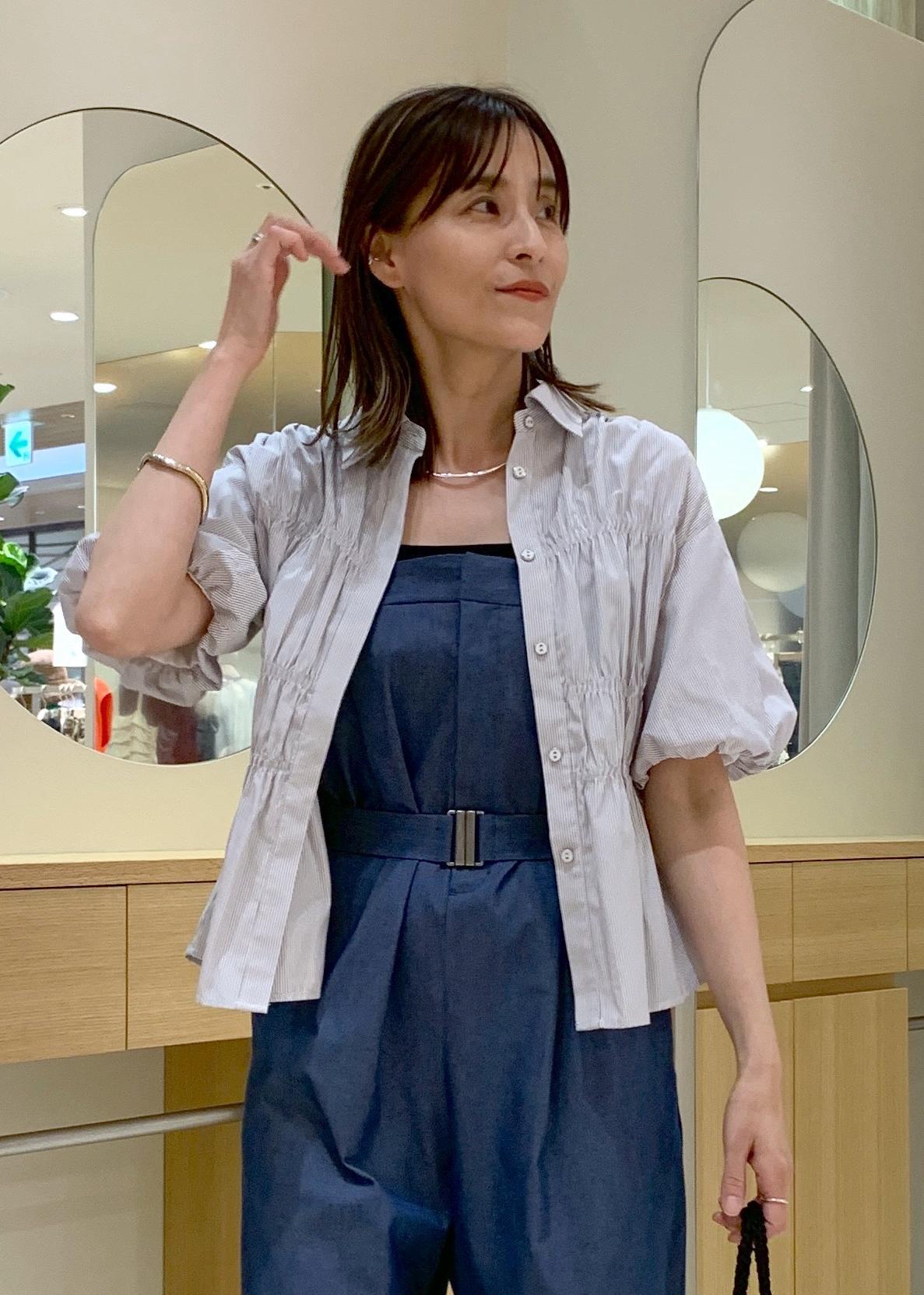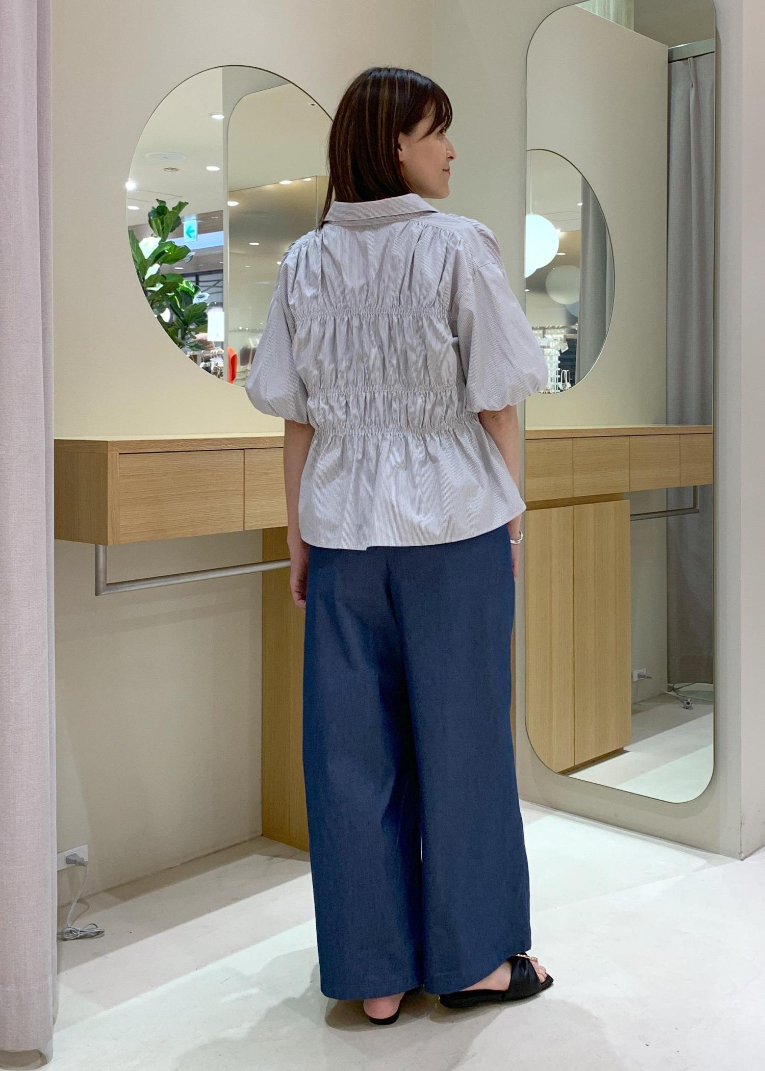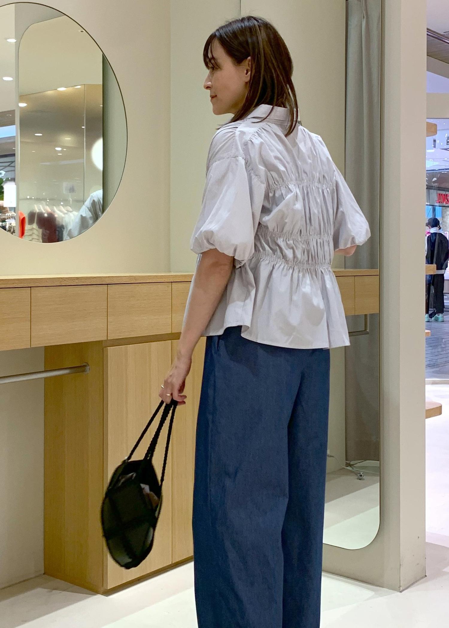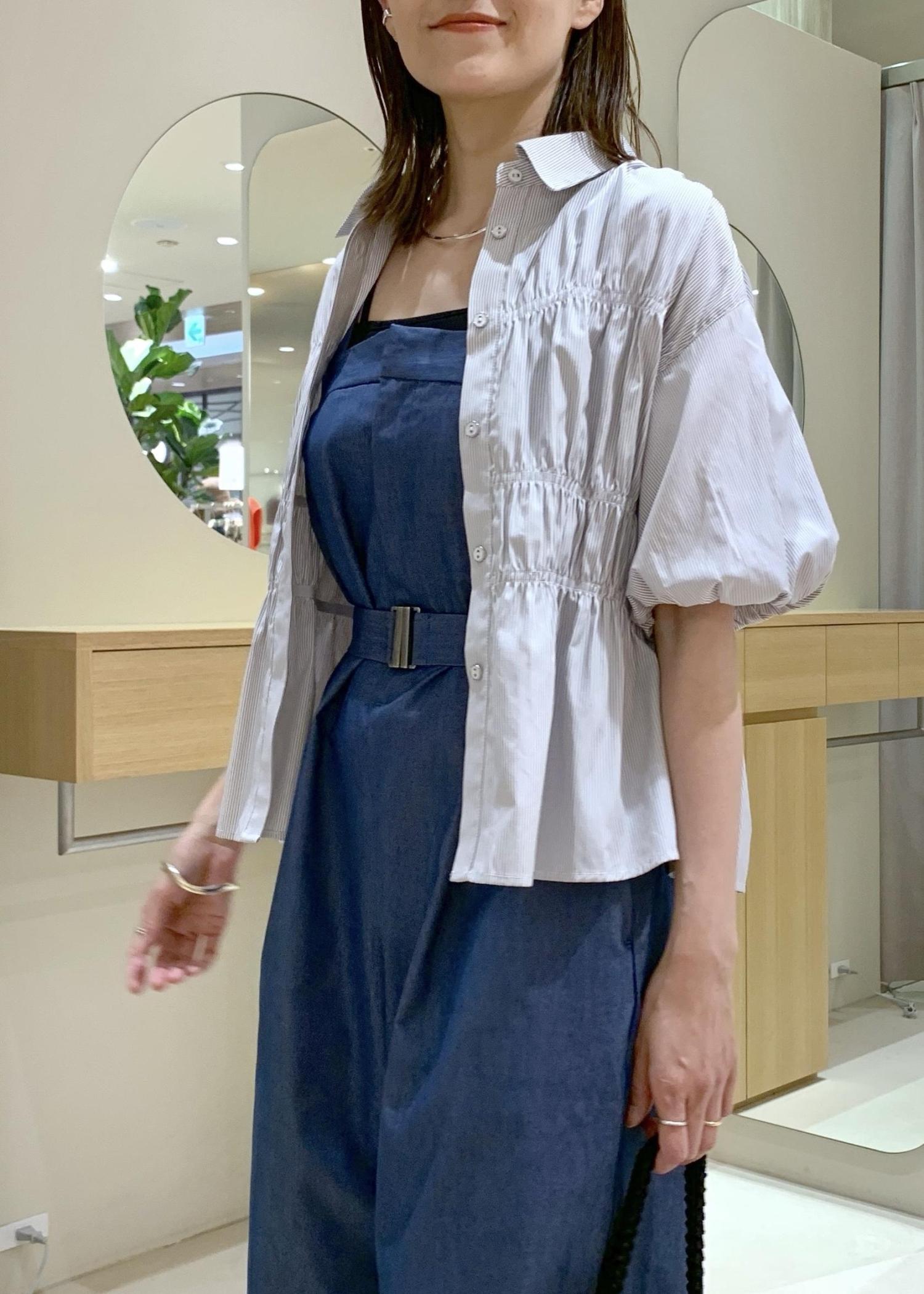 前ボタンを止めたまま着用しても、ギャザーのデザインが入っていて着映えする1枚です♪