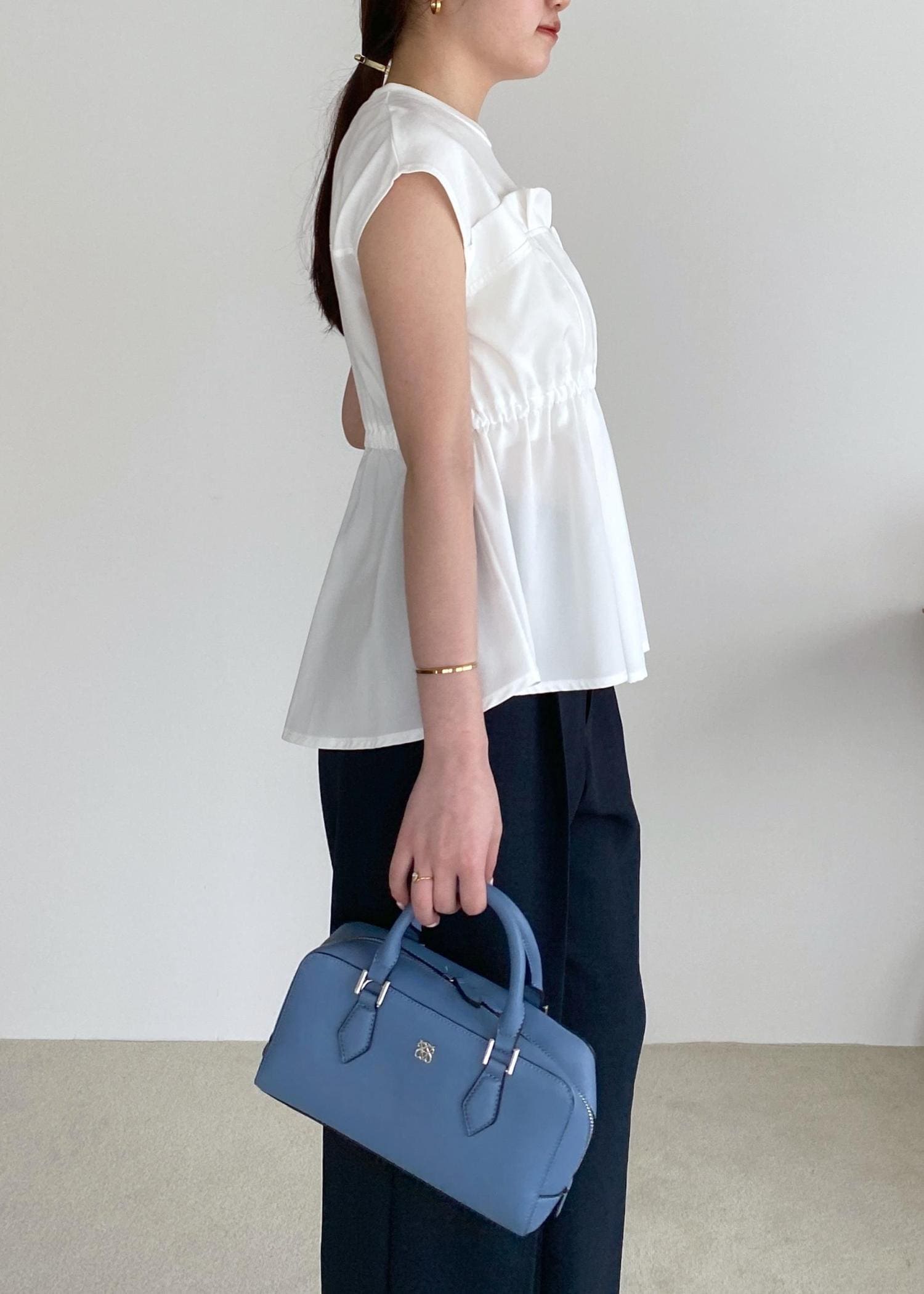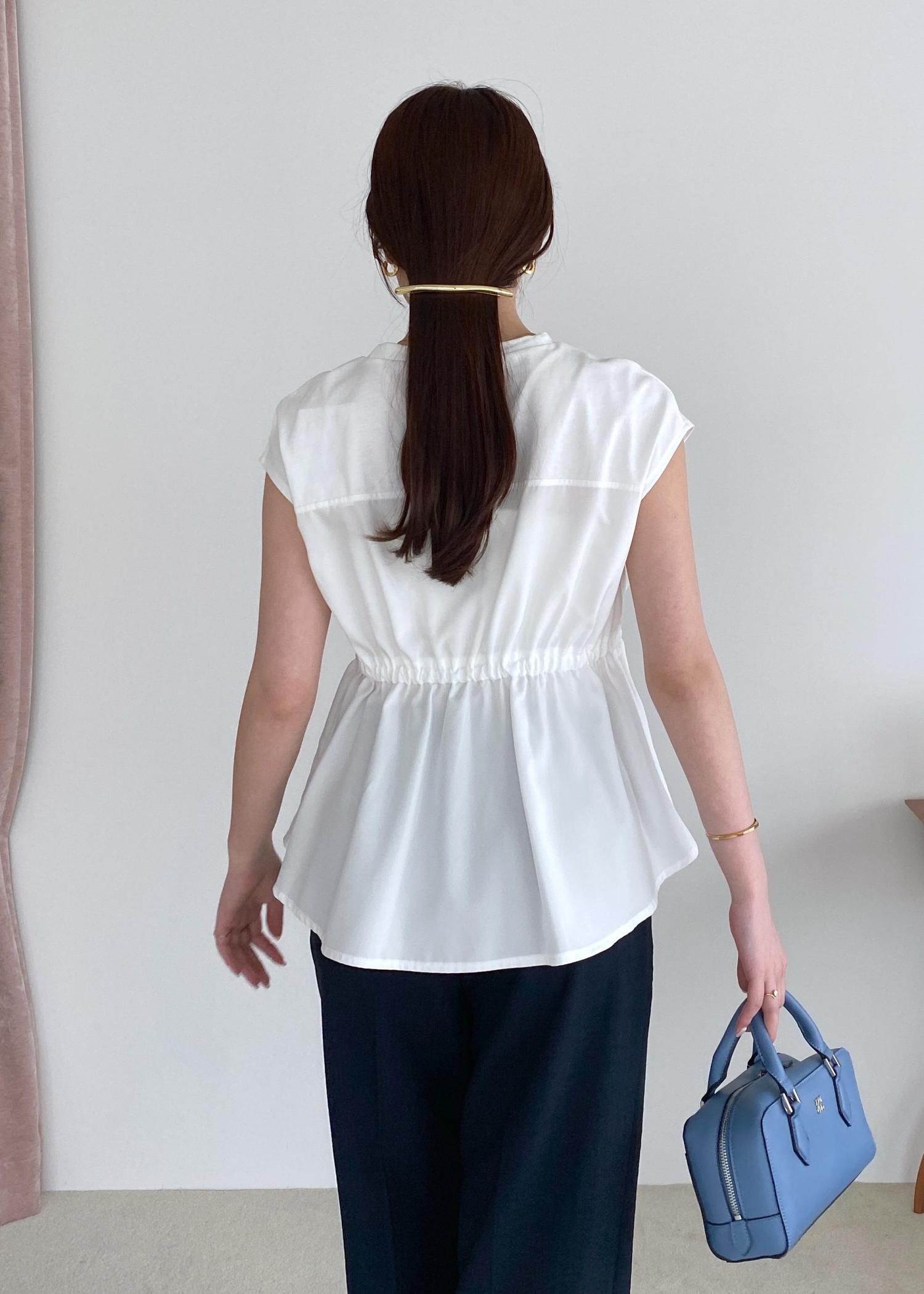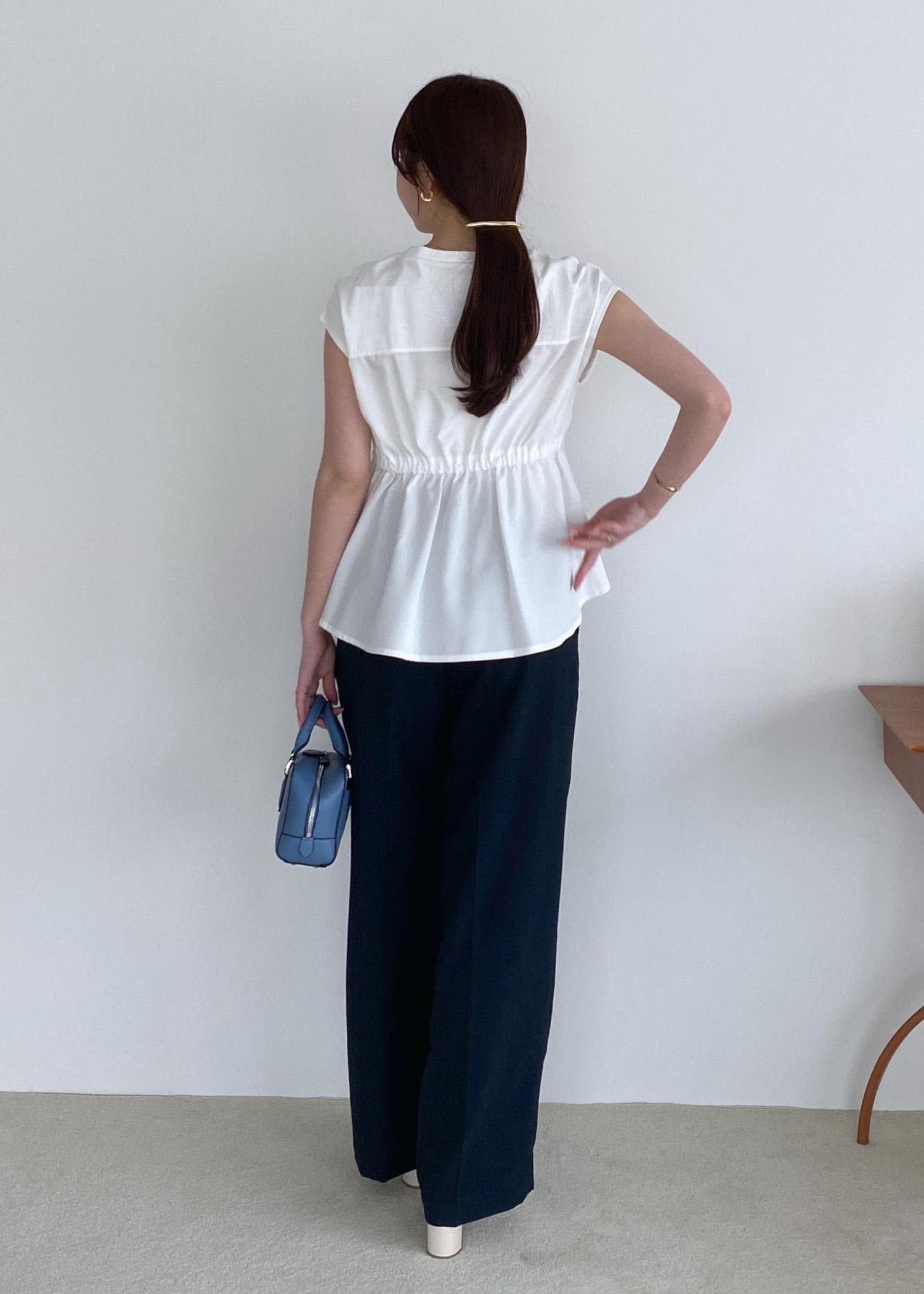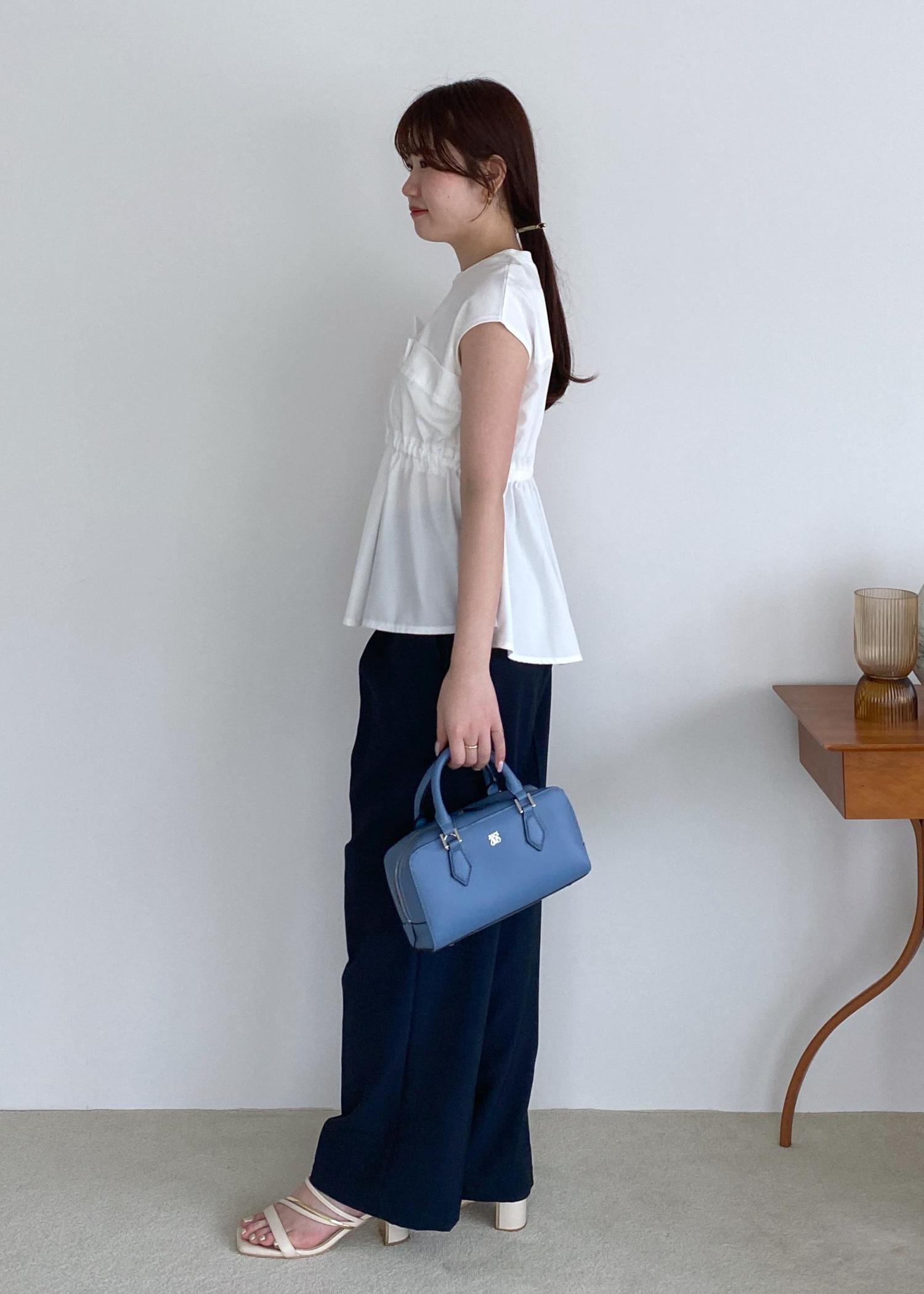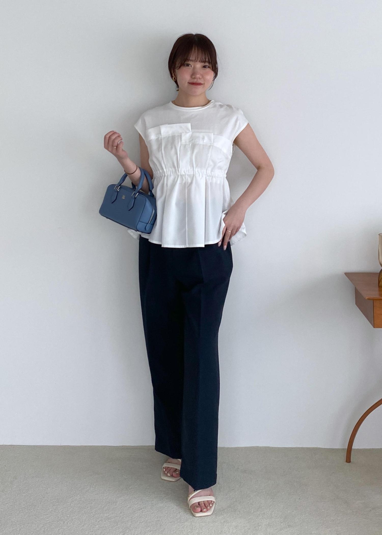 ペプラムトップスをメインにシンプルだけど、女性らしいパッと惹かれるメリハリのある爽やかなパンツスタイルに!