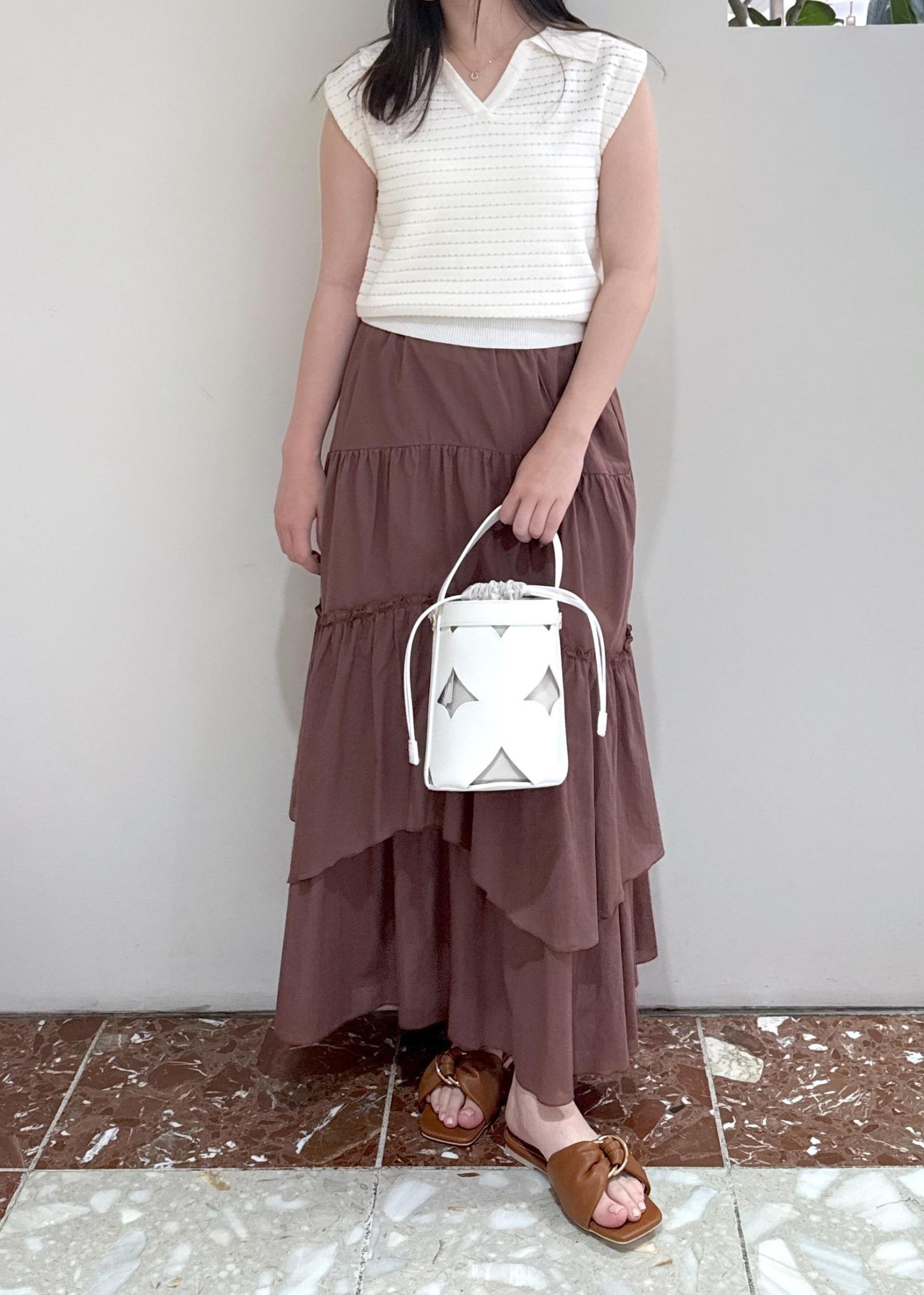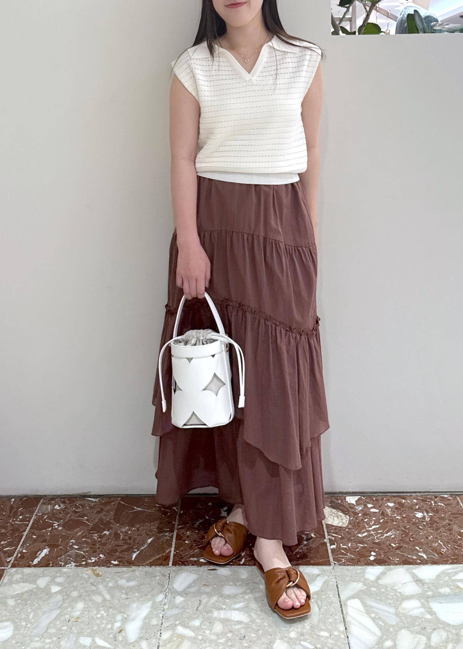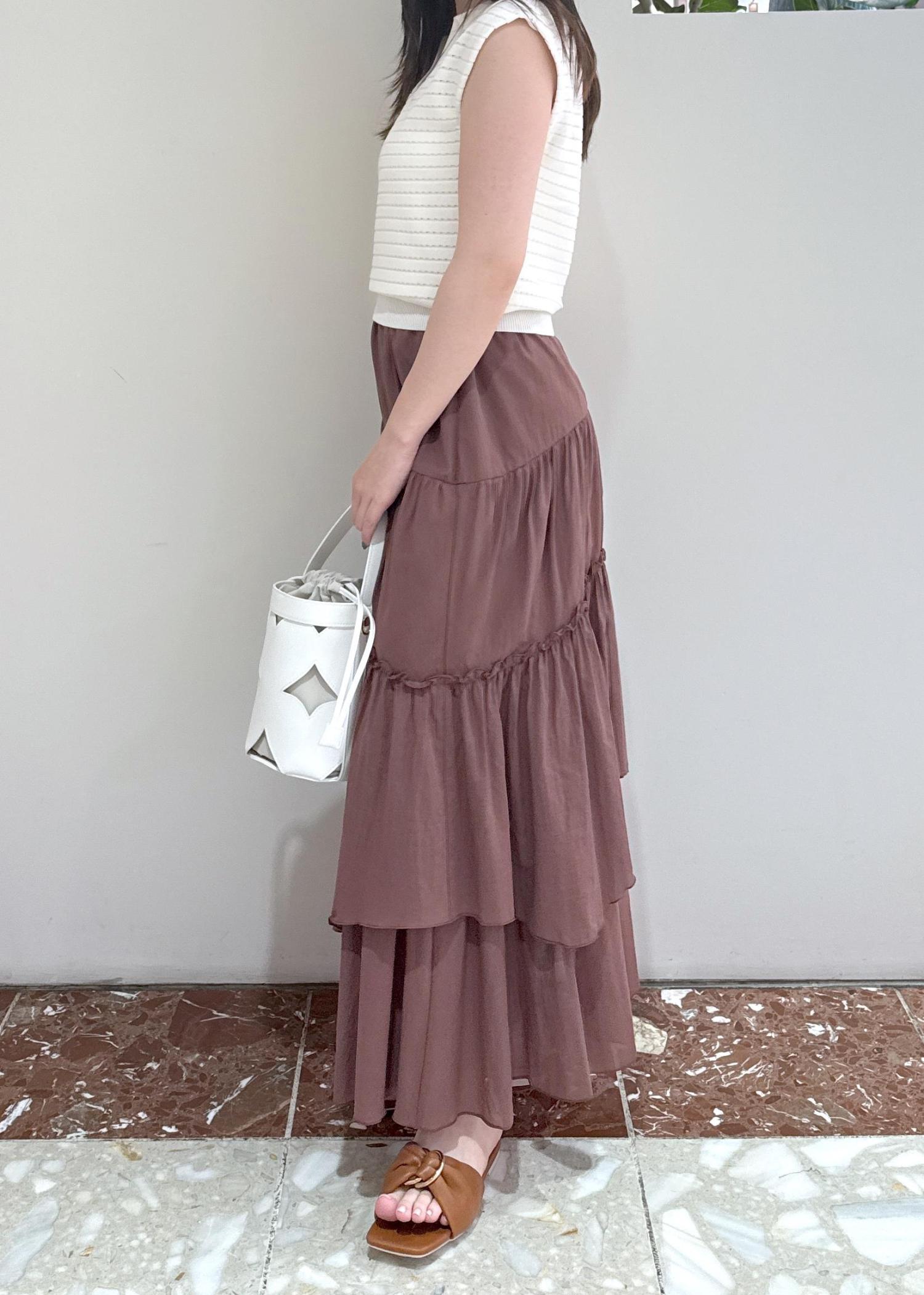 アウトレットVISボイルティアードスカートダークブラウン / F¥3,955レビュー裏地がしっかりついたティアードスカートなので