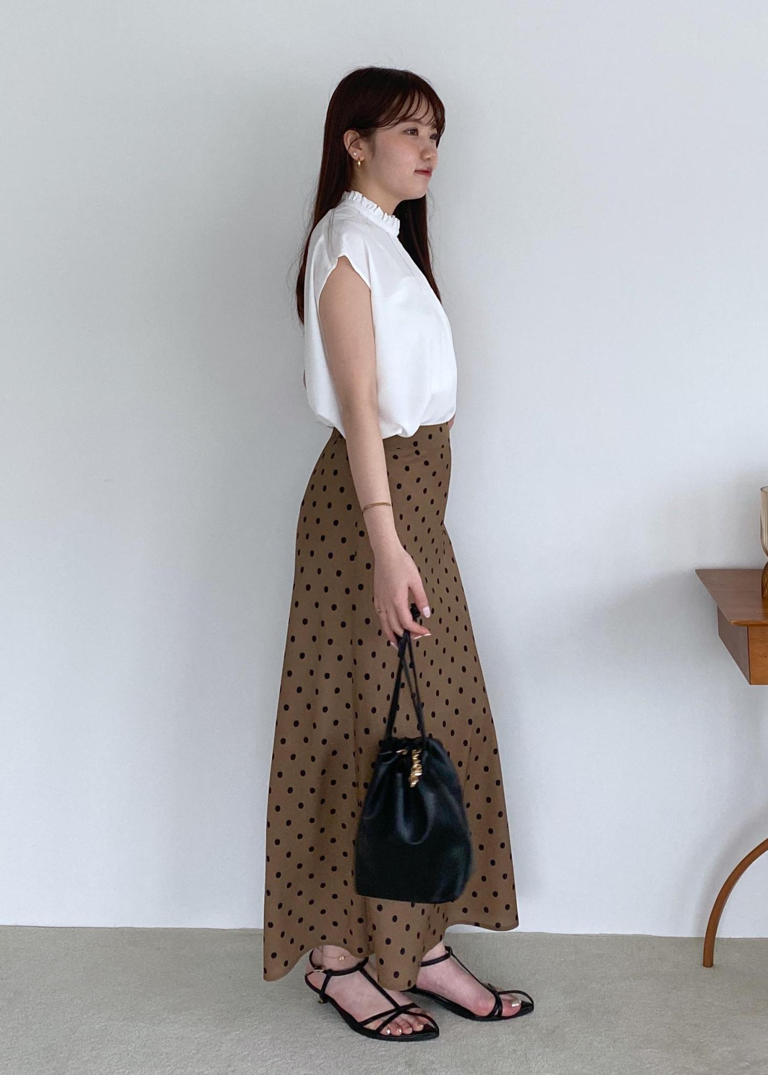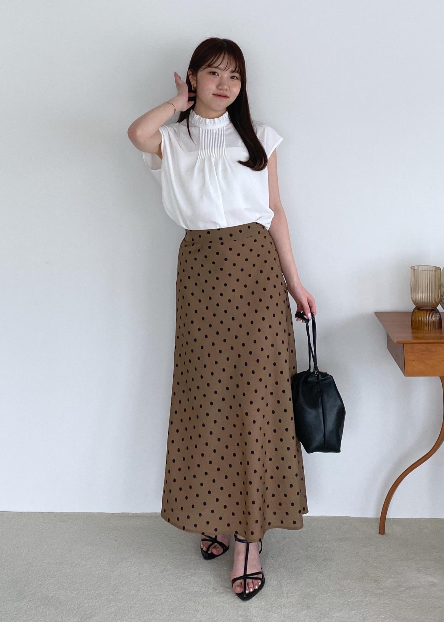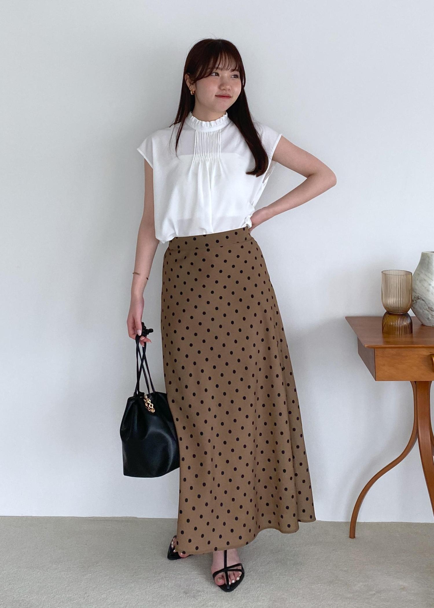 上品見えする首元がフリルのブラウスに、ブラウンカラーのドットスカートで大人ladyな気分◎