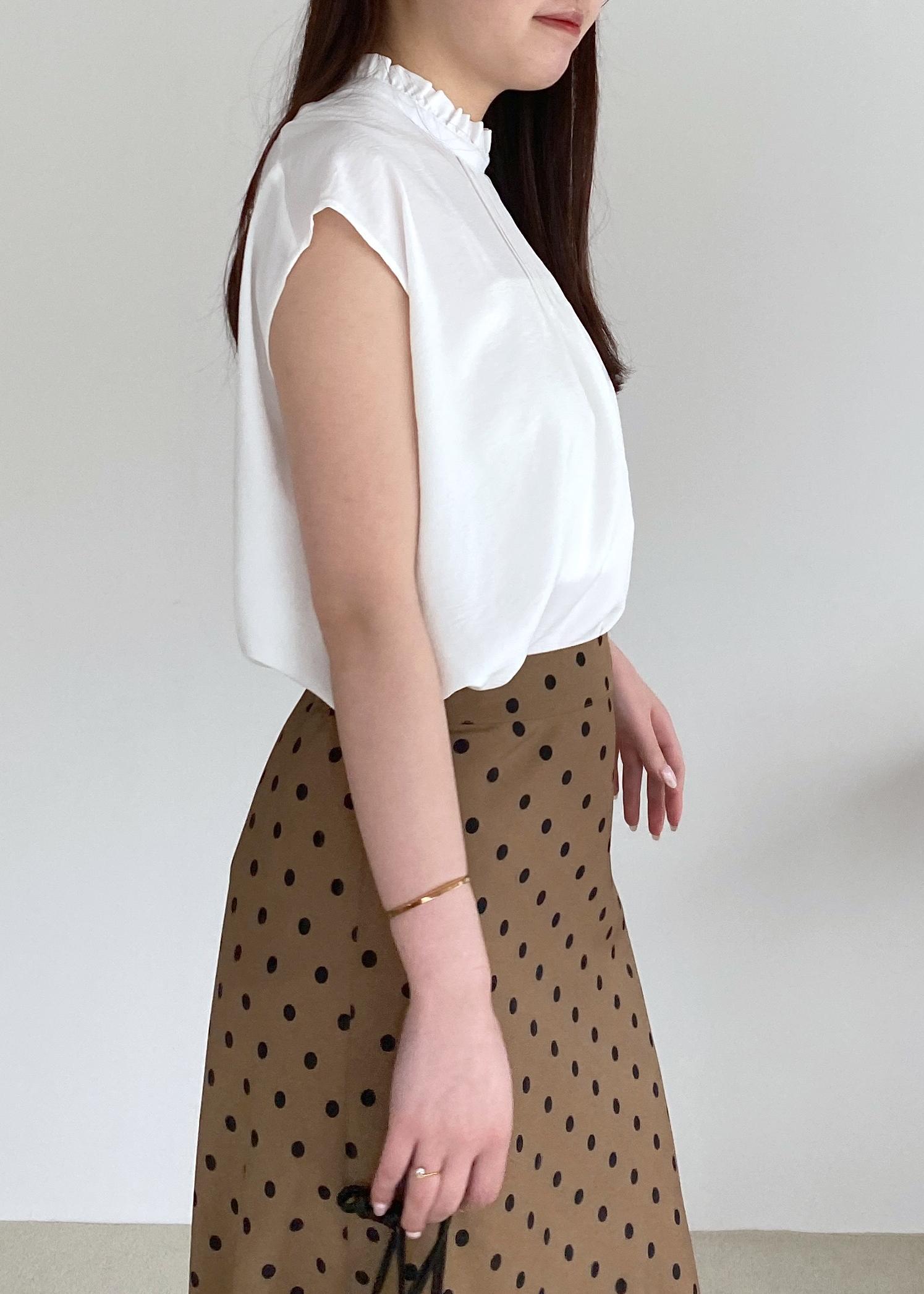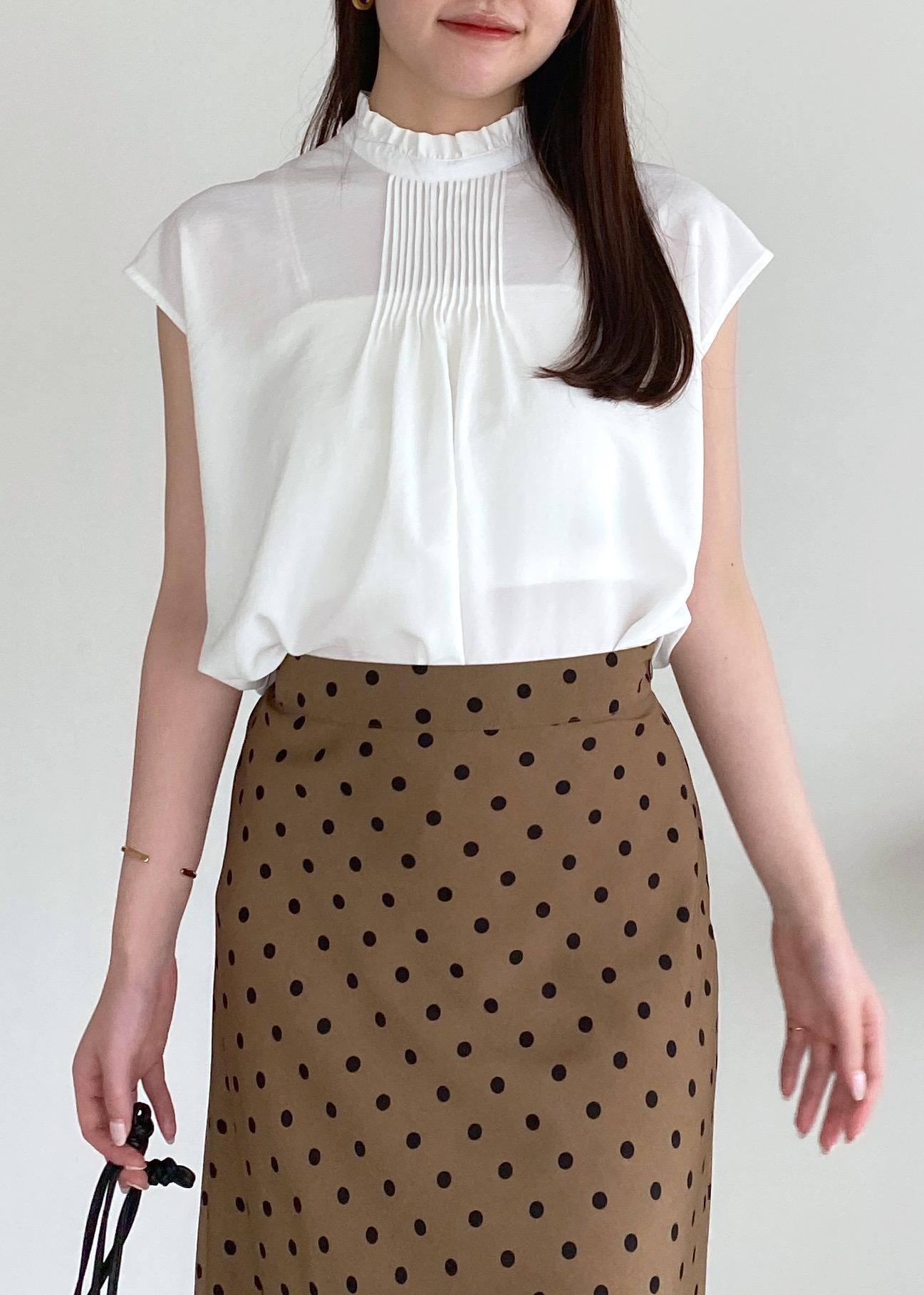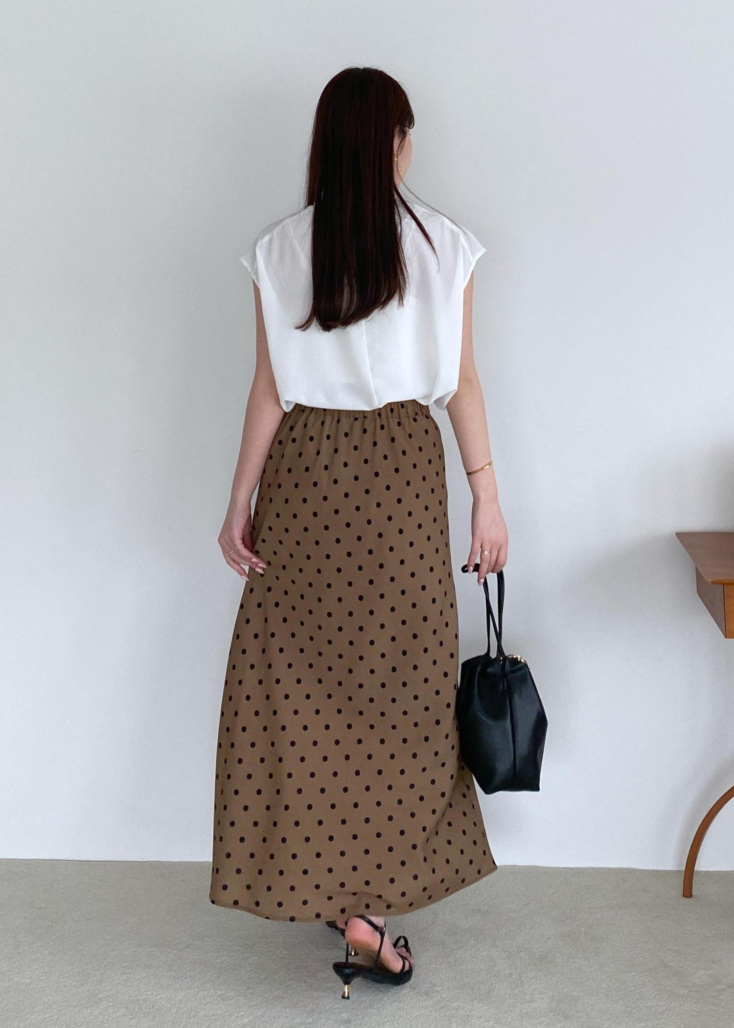 上品見えする首元がフリルのブラウスに、ブラウンカラーのドットスカートで大人ladyな気分◎