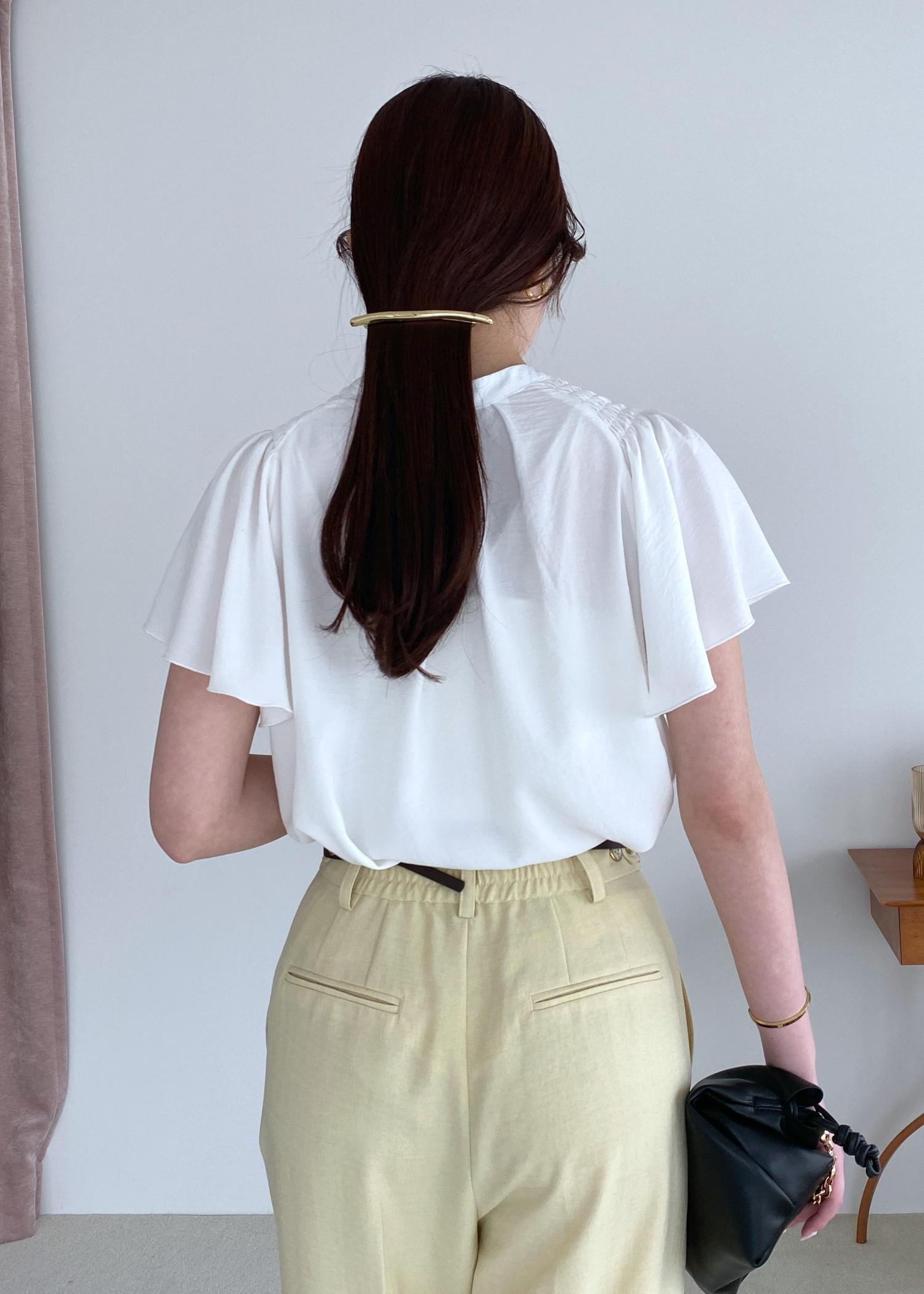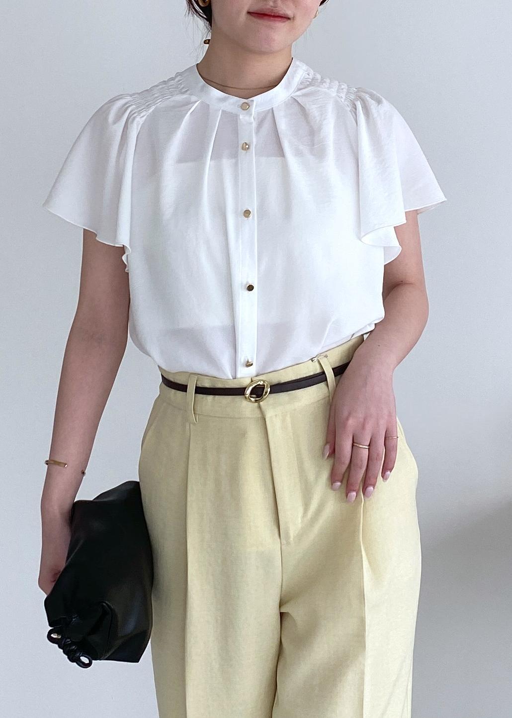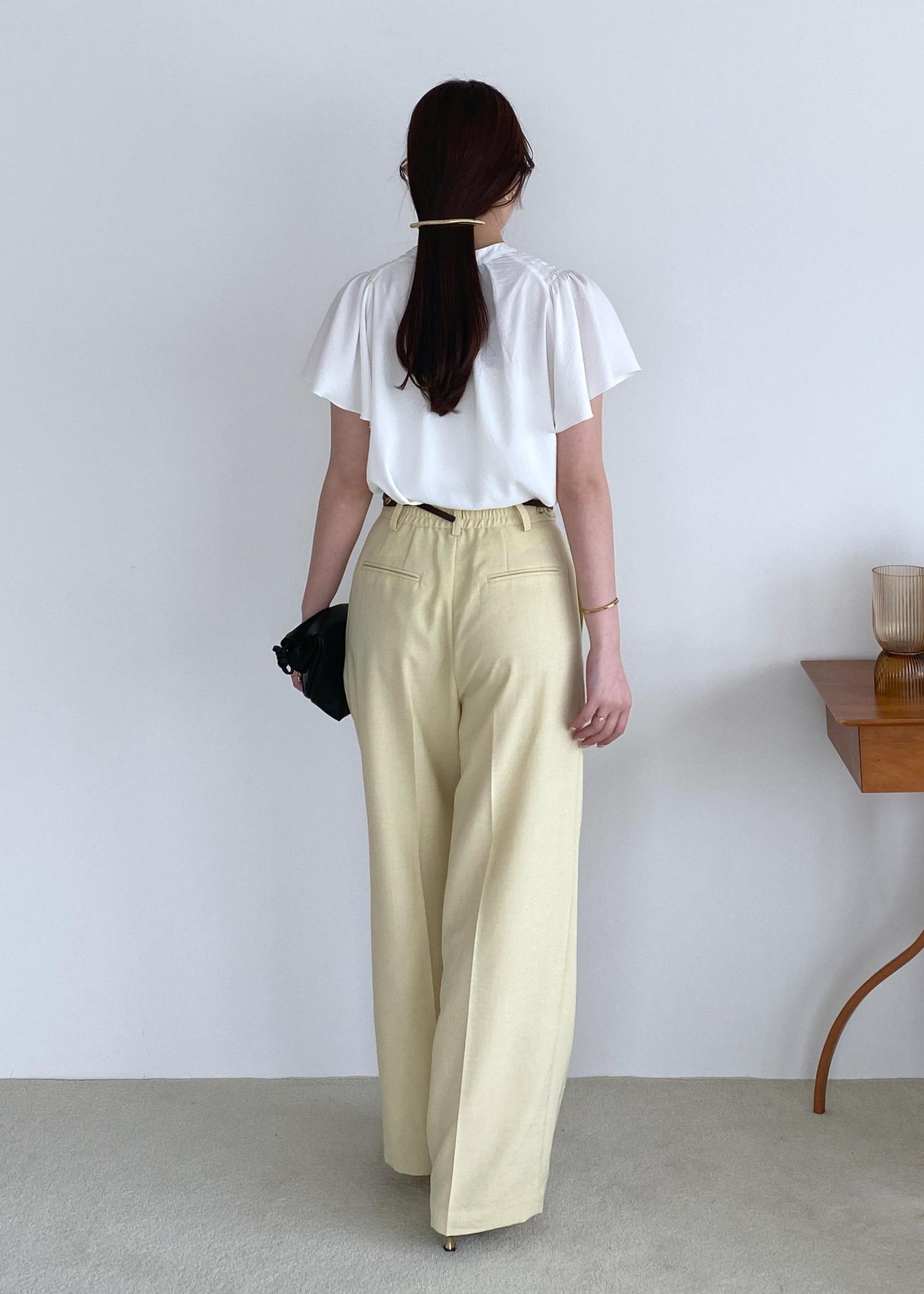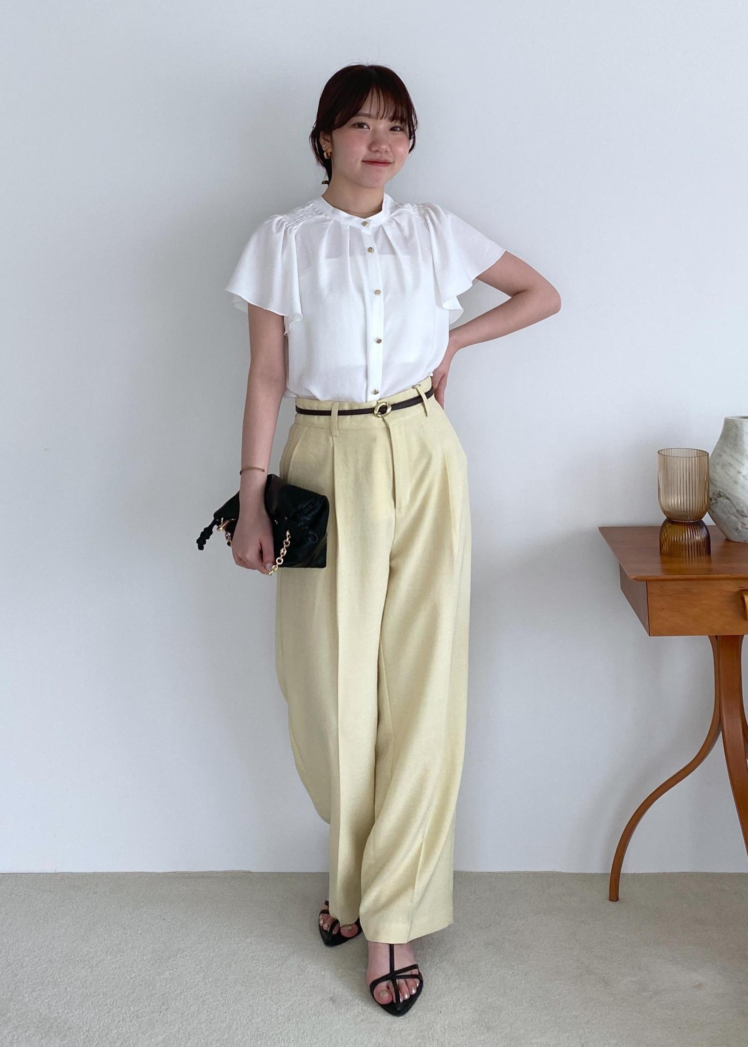 肩にギャザー、袖にはフリルが入ったシンプルだけどフェミニンな女性らしいブラウスに、イエローカラーのパンツを合わせてきれいめに♡ お呼ばれホテルランチコーデにも◎