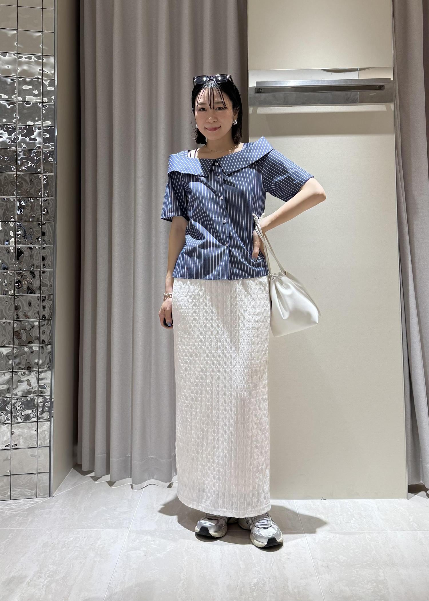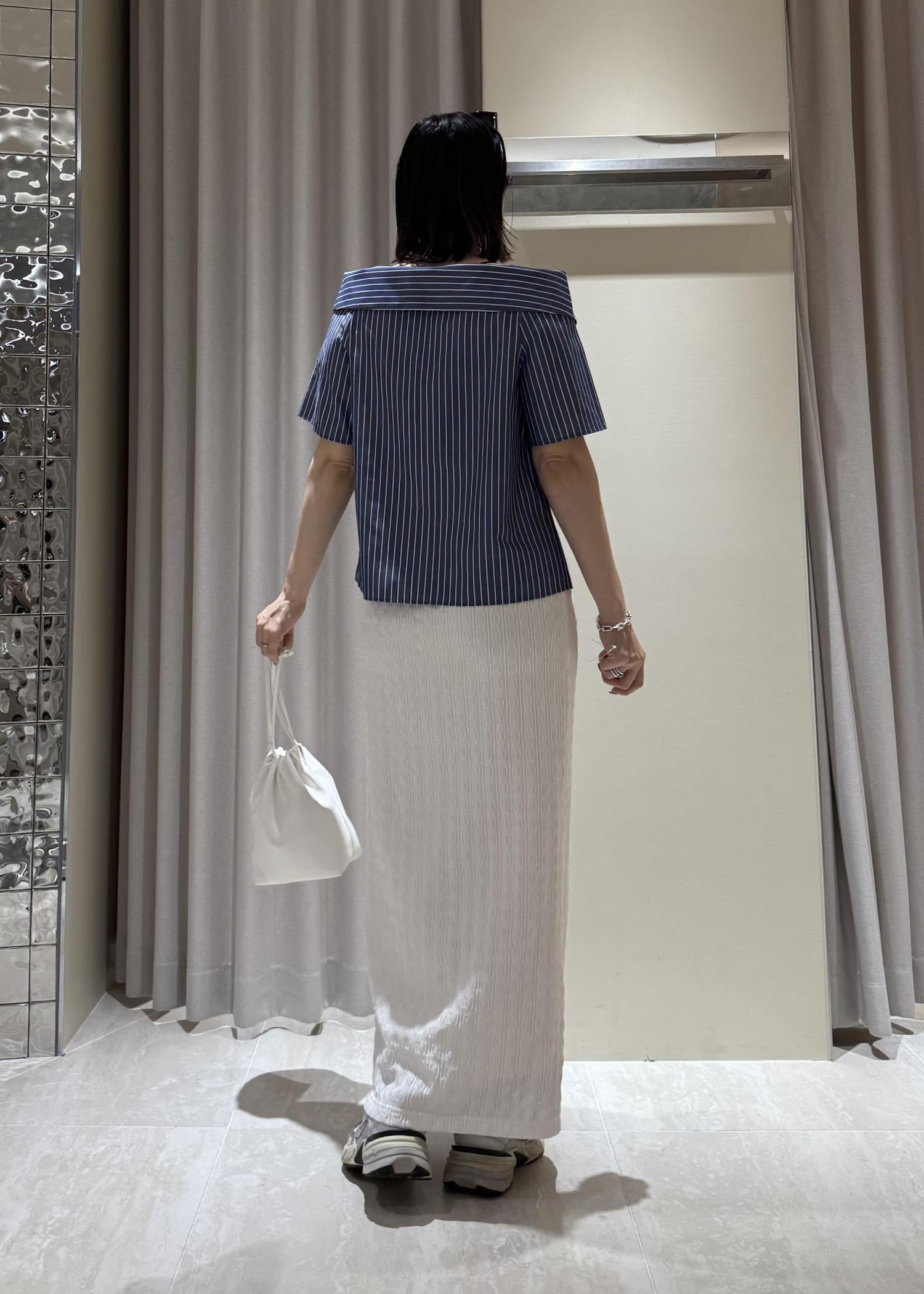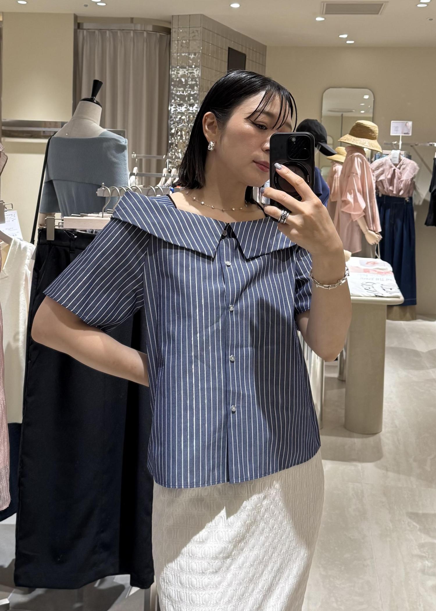予約の時点で人気だった、オフショル風シャツが入荷しました!ストライプにはラメが入っていてさりげなく光るのが涼しげで夏らしいシャツです♪