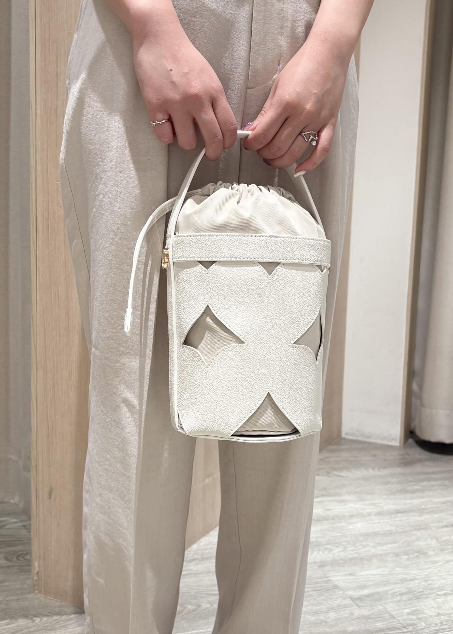 アウトレットVISカットワーク2WAYバッグホワイト系 / F¥4,843レビューショルダーもついているため、2wayで使用できます。中は二つ折り財布が入る大きさで高さがあるため、小さめのペットボトルも入りそうです。