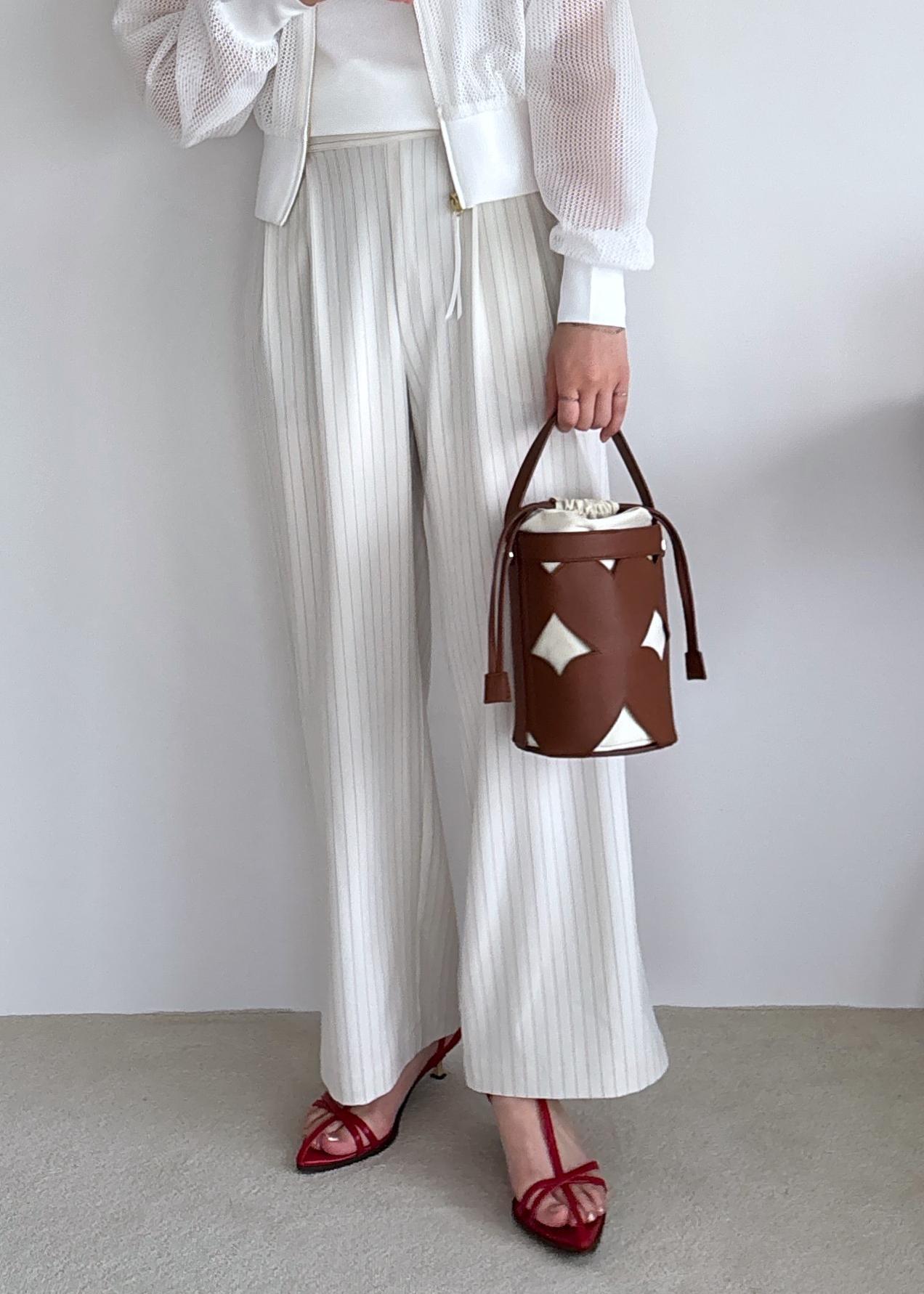 アウトレットVIS【接触冷感/UVケア】ピンストライプリラックスワイドパンツキナリ / M¥2,636レビューボディラインをを拾いづらいワイドパンツ。