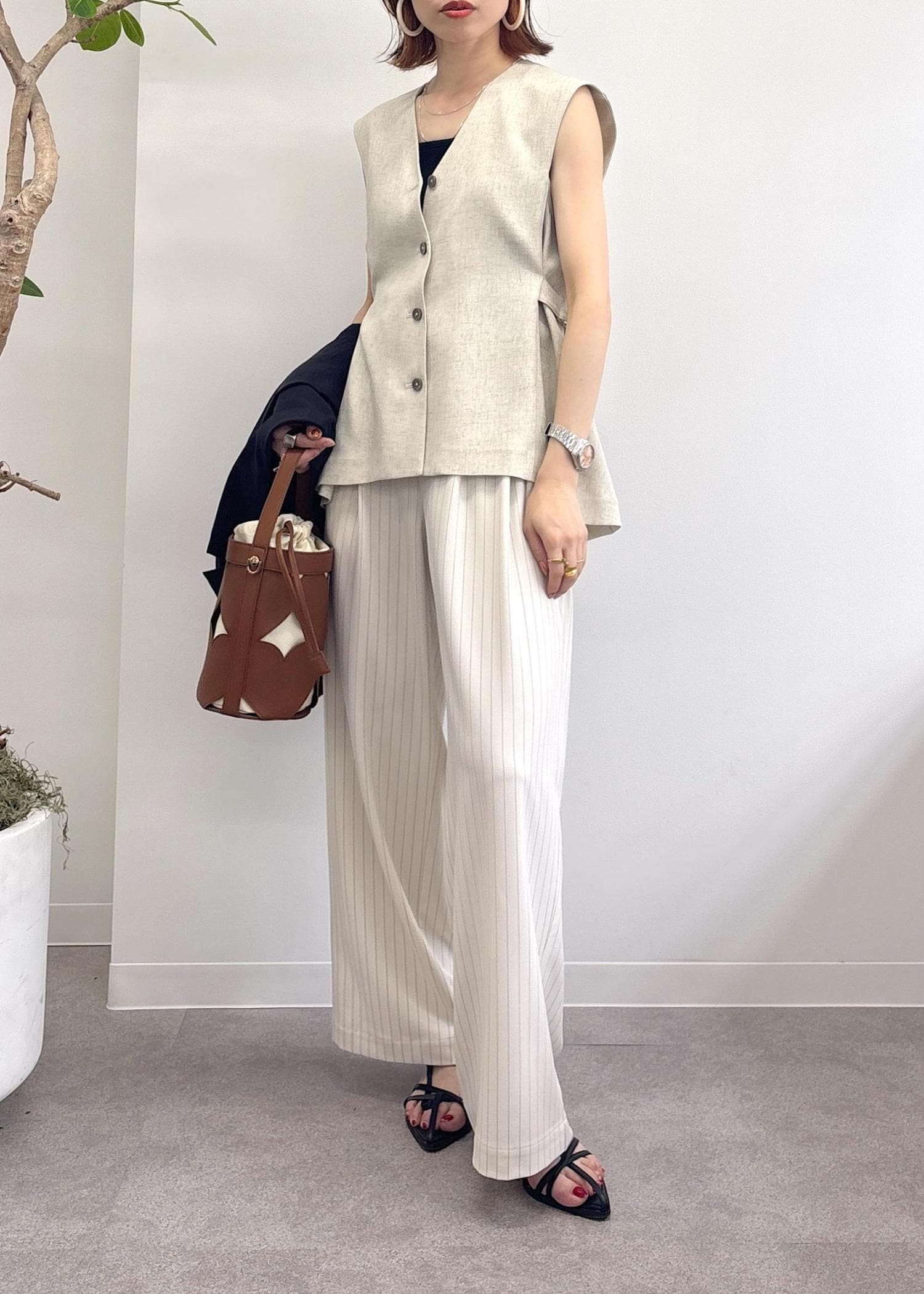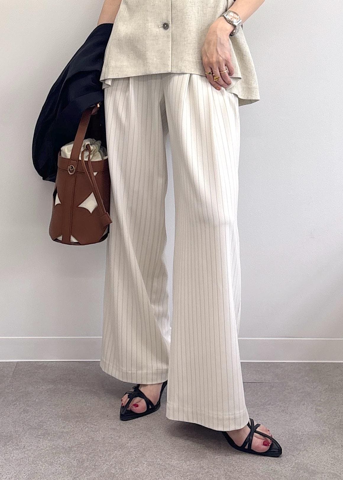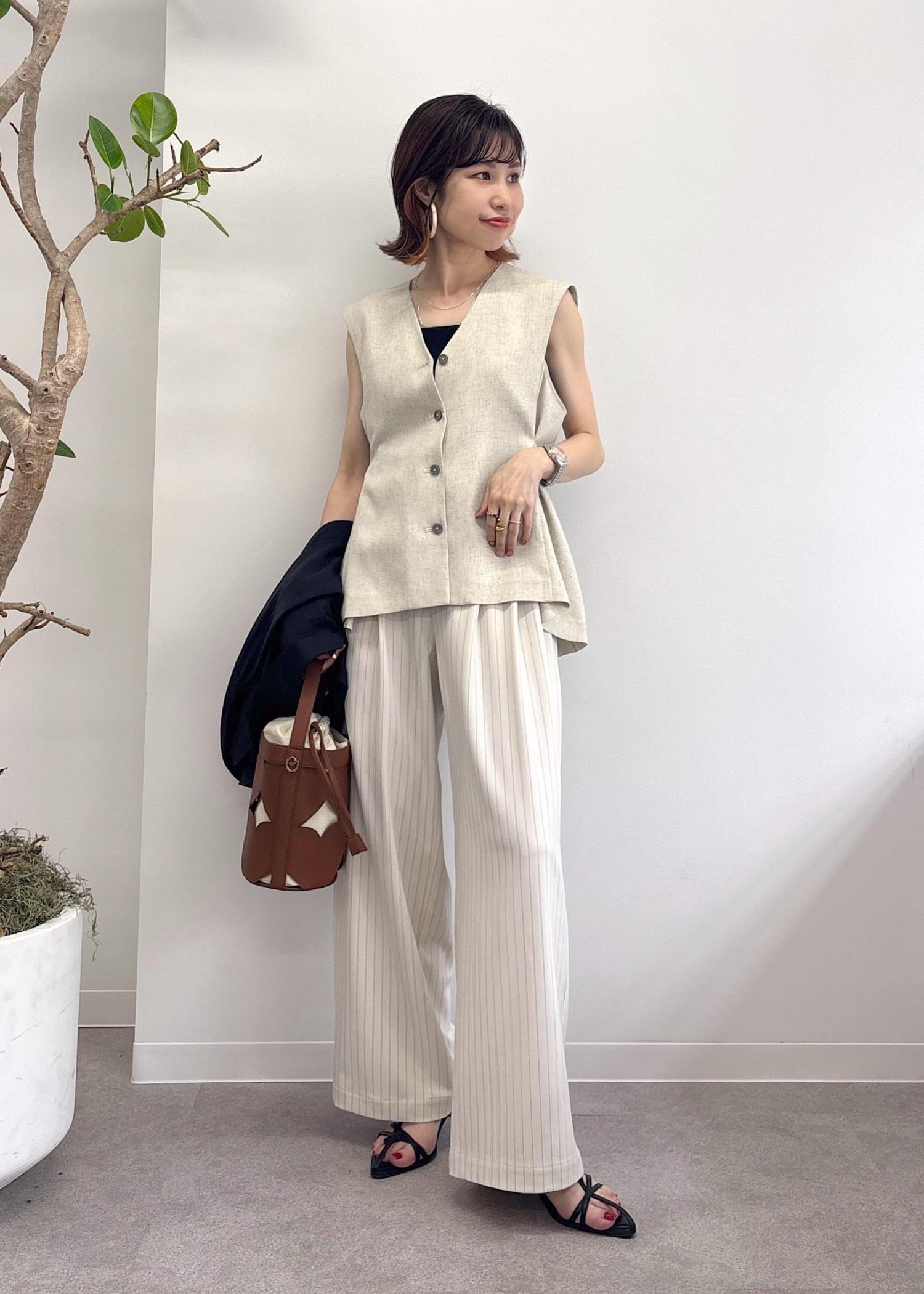 汗ばむ季節を爽やかな印象見えする淡色スタイルは、お仕事でも好印象に♪大人可愛いサマージレとストライプのワイドパンツ、インナーに合わせてサンダルもブラックにすることでスッキリとした甘くなり過ぎない雰囲気になって好みでした◎