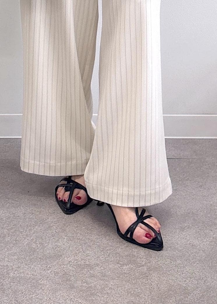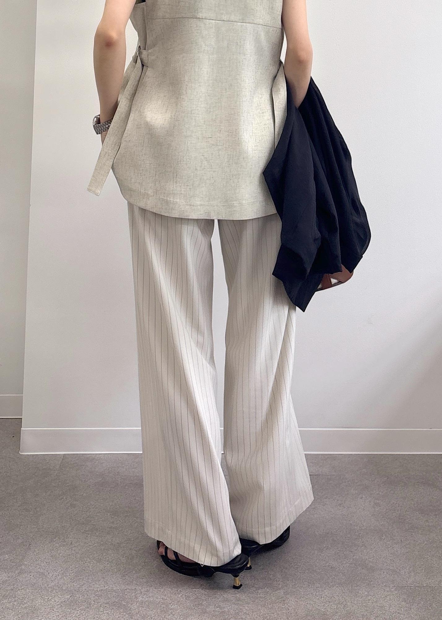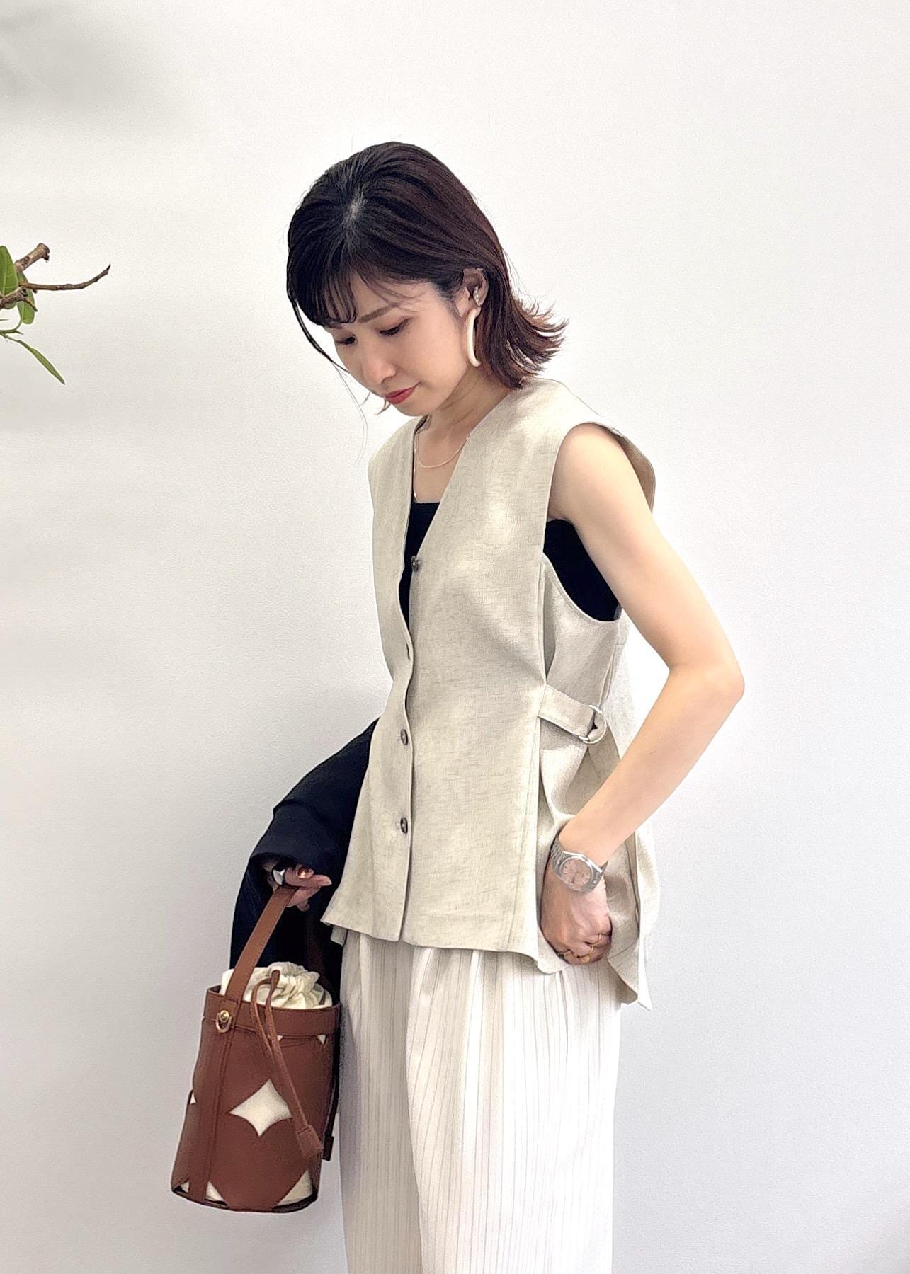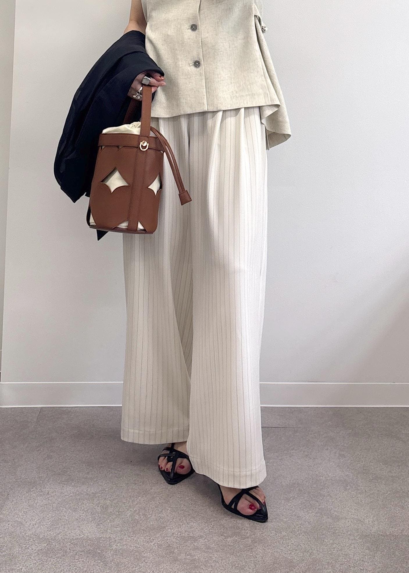 汗ばむ季節を爽やかな印象見えする淡色スタイルは、お仕事でも好印象に♪大人可愛いサマージレとストライプのワイドパンツ、インナーに合わせてサンダルもブラックにすることでスッキリとした甘くなり過ぎない雰囲気になって好みでした◎