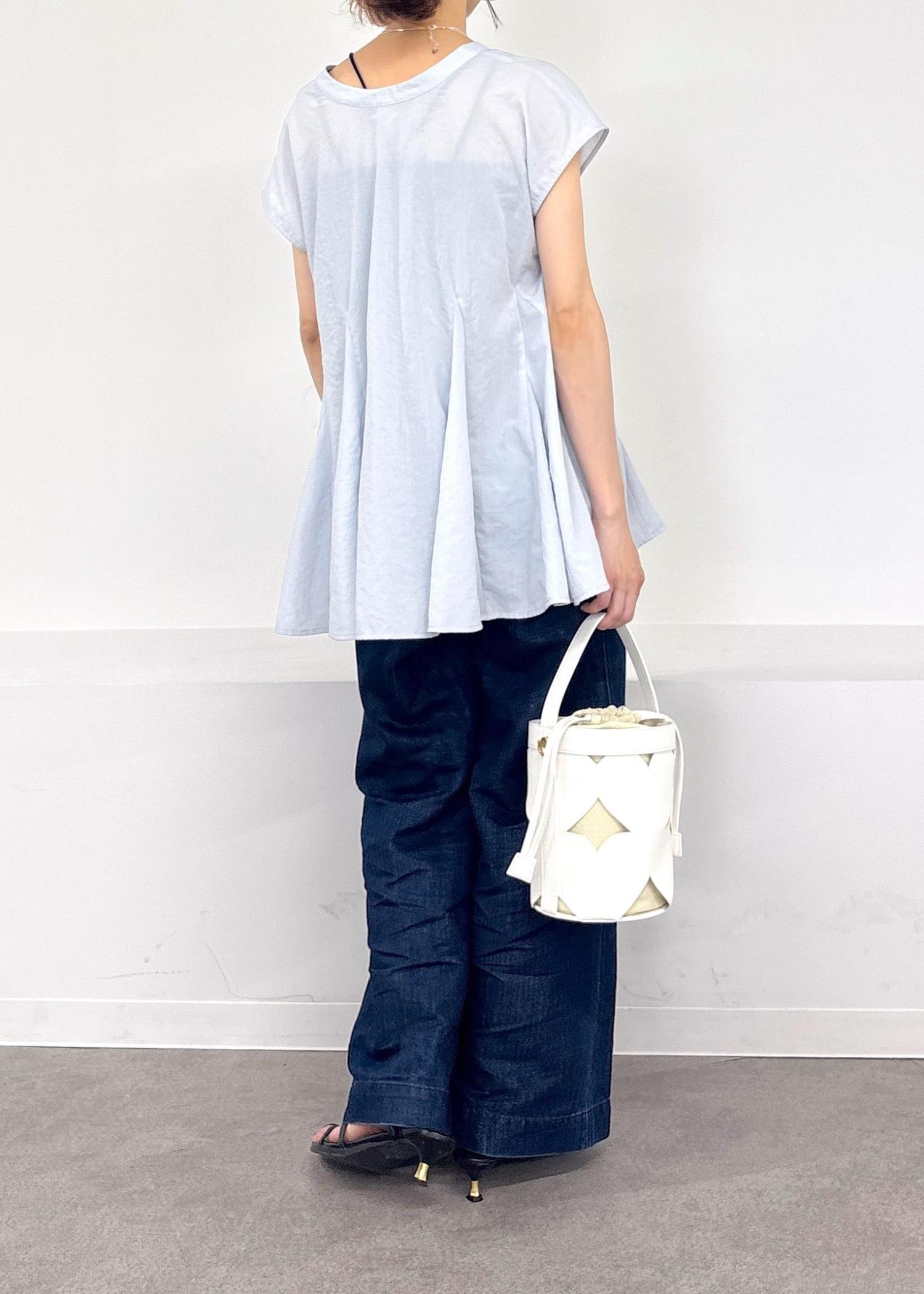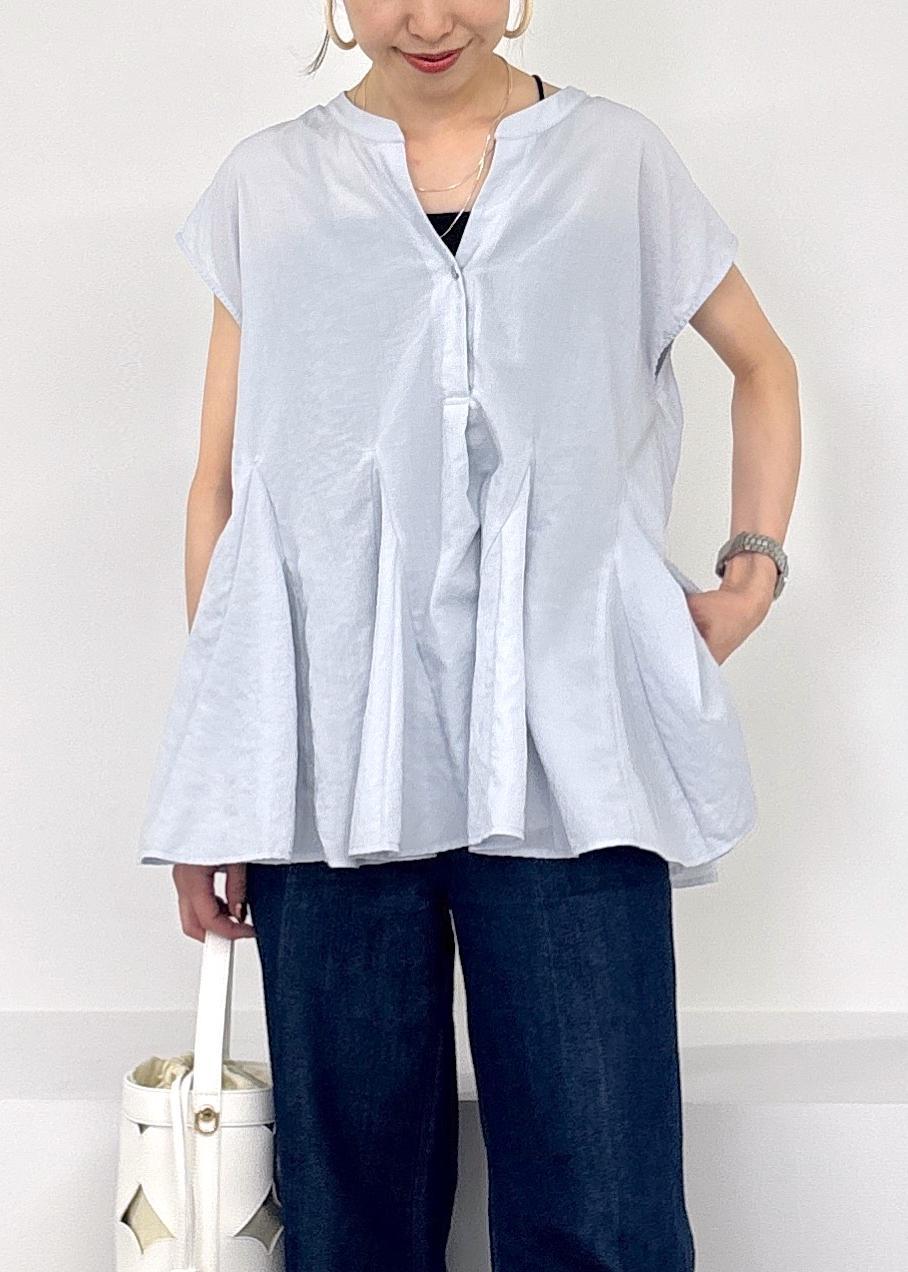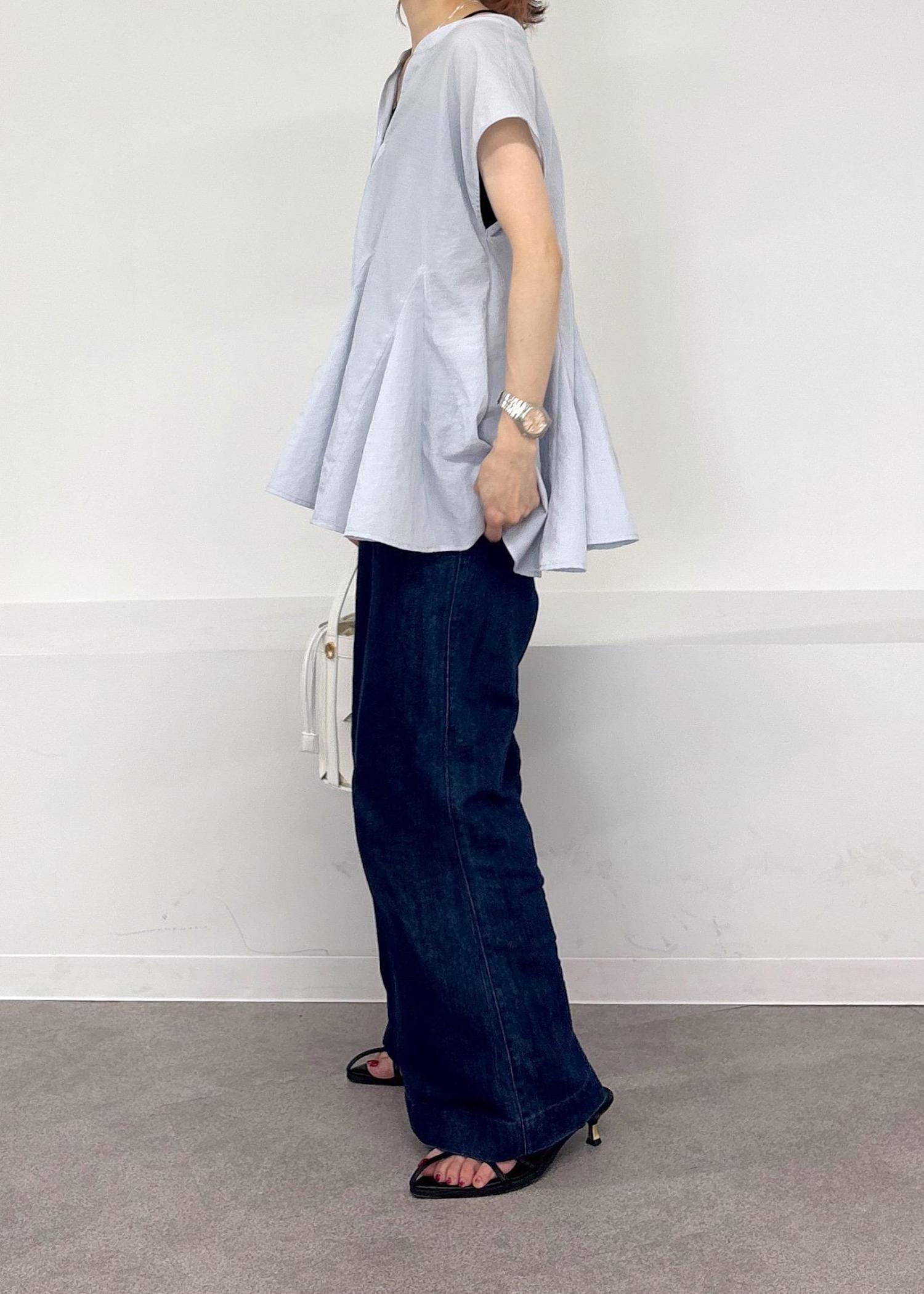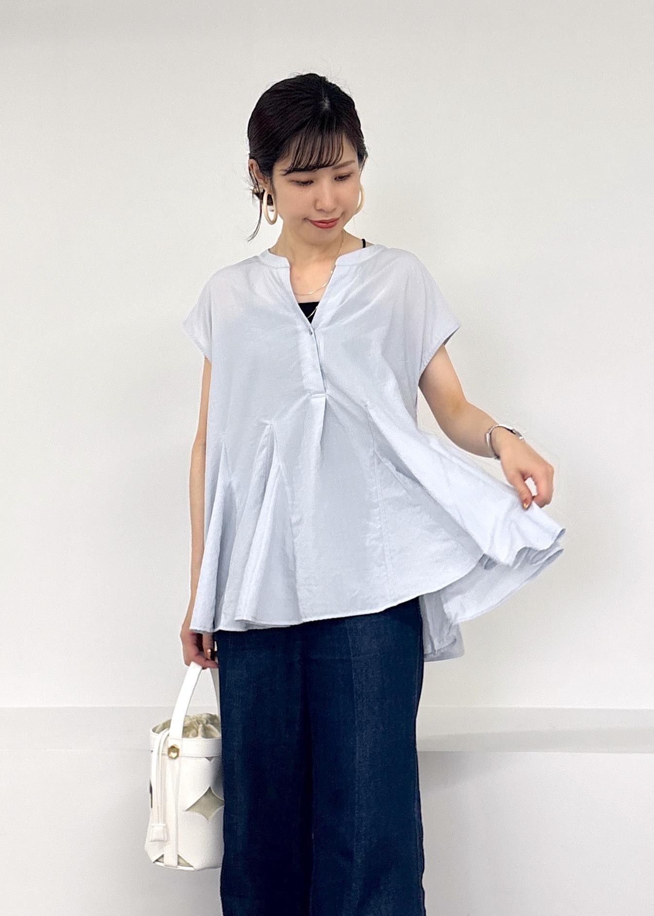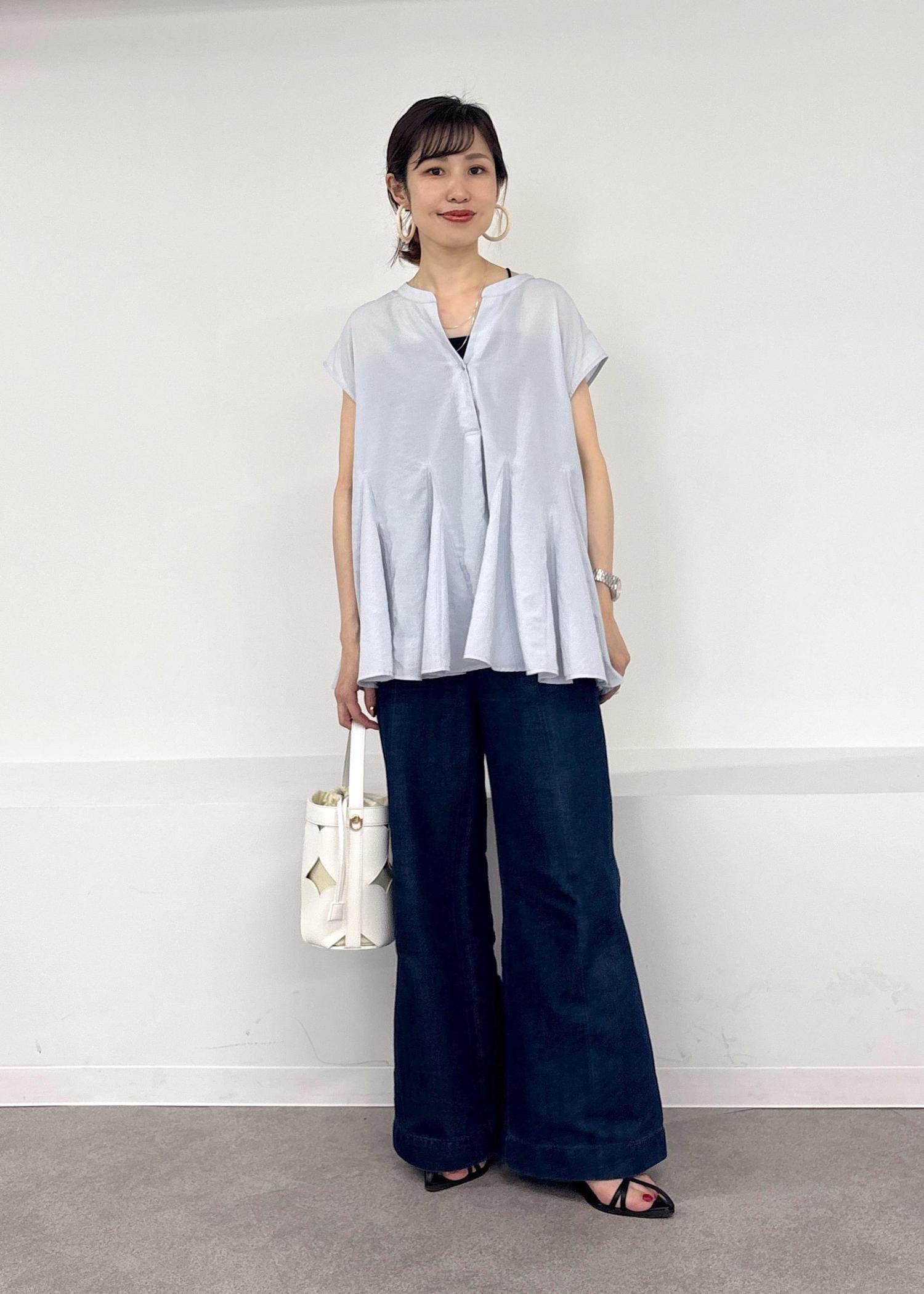 ふわっと柔らかな大人可愛いチュニックブラウスは、お尻まで隠れて体型カバーできる優秀アイテム♪胸下でフレアラインが切り替わっているので、ワイドパンツとの合わせもバランス良くまとまります◎デニムとサンダルで休日スタイルにもぴったりな大人カジュアルコーデ。