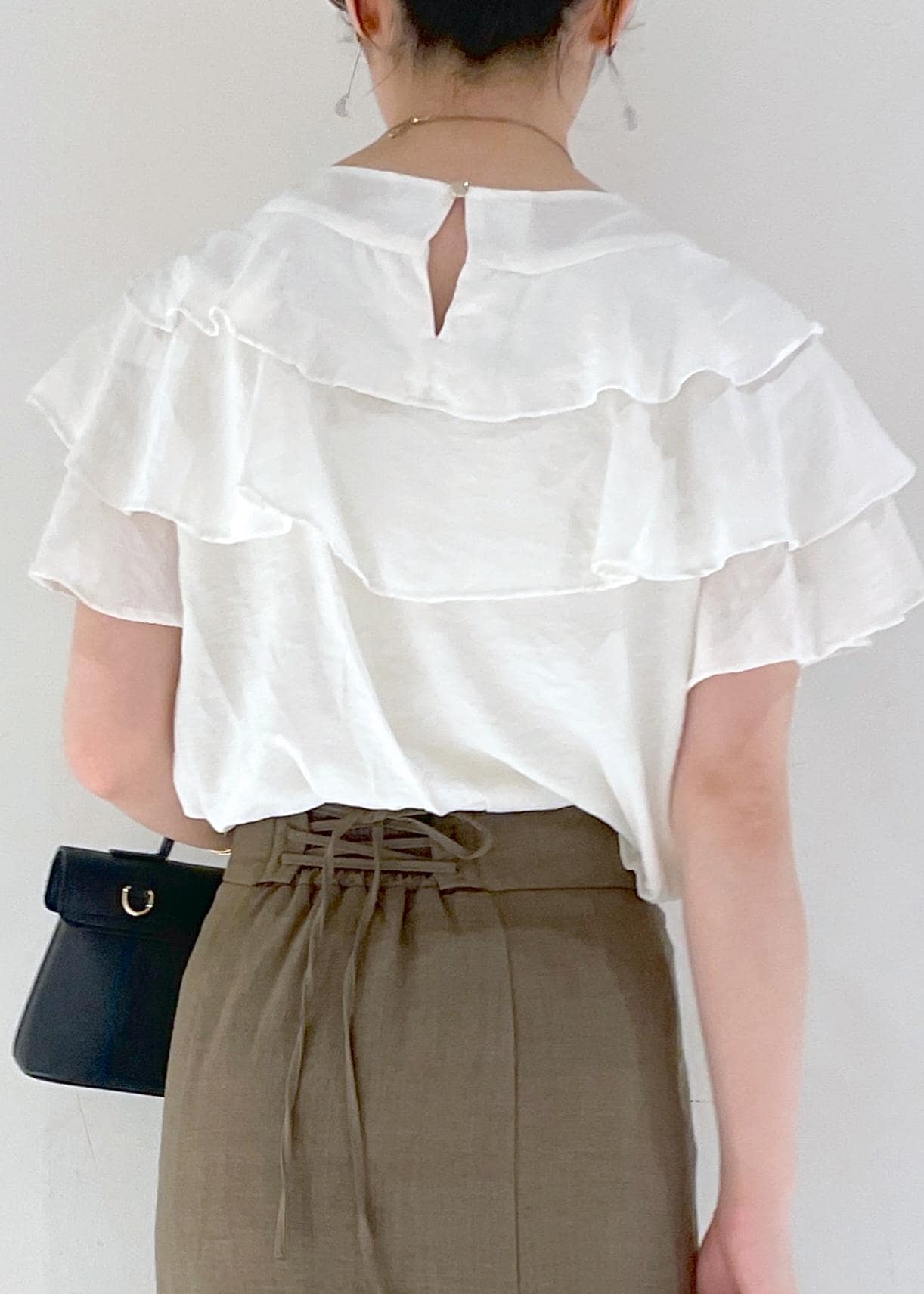 アウトレットVISフリルティアードブラウスオフホワイト / F¥4,391レビュー柔らかい生地感で肩のラインに沿うようなデザインなので、フリルのボリューム感が出過ぎず良かったです。