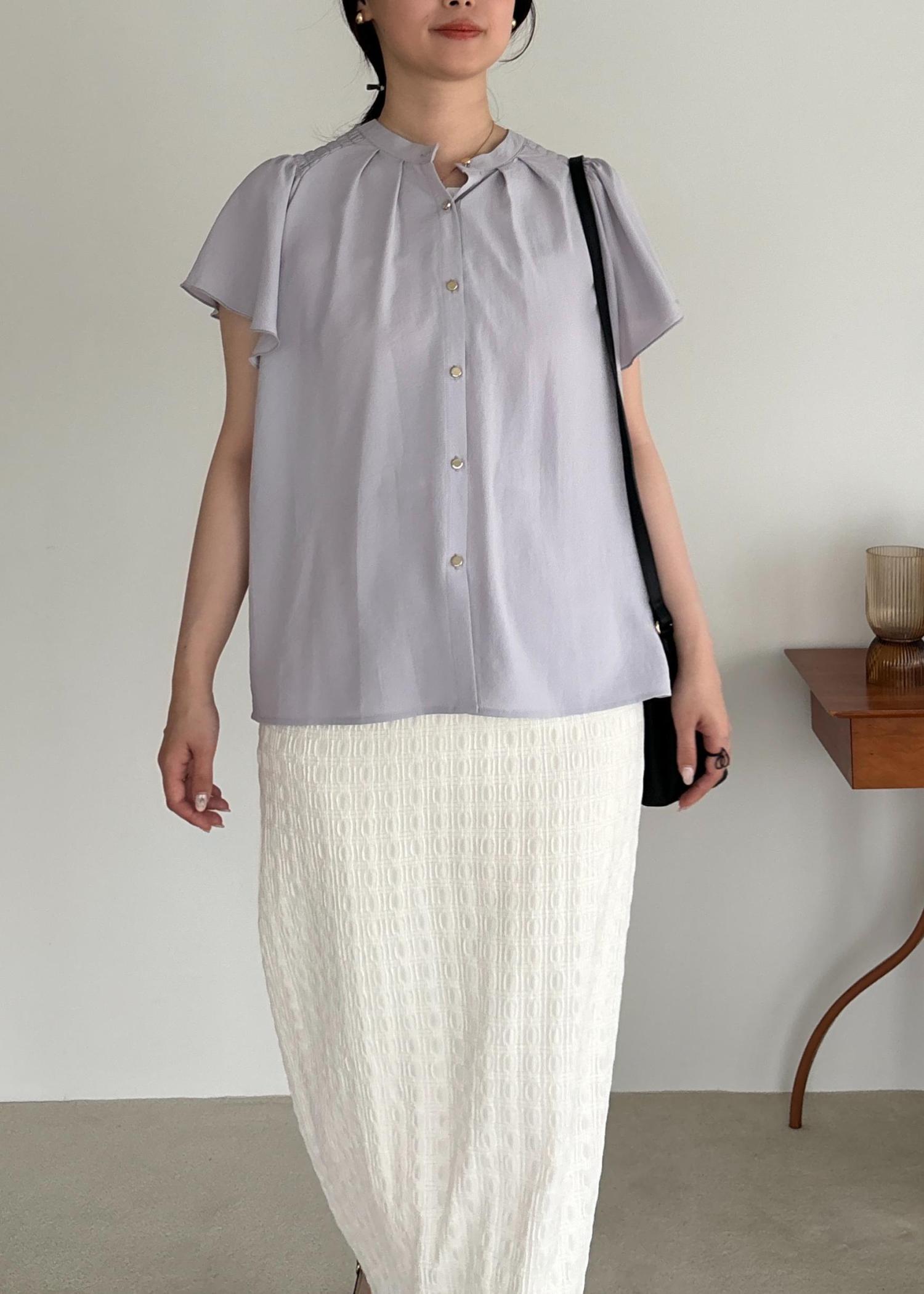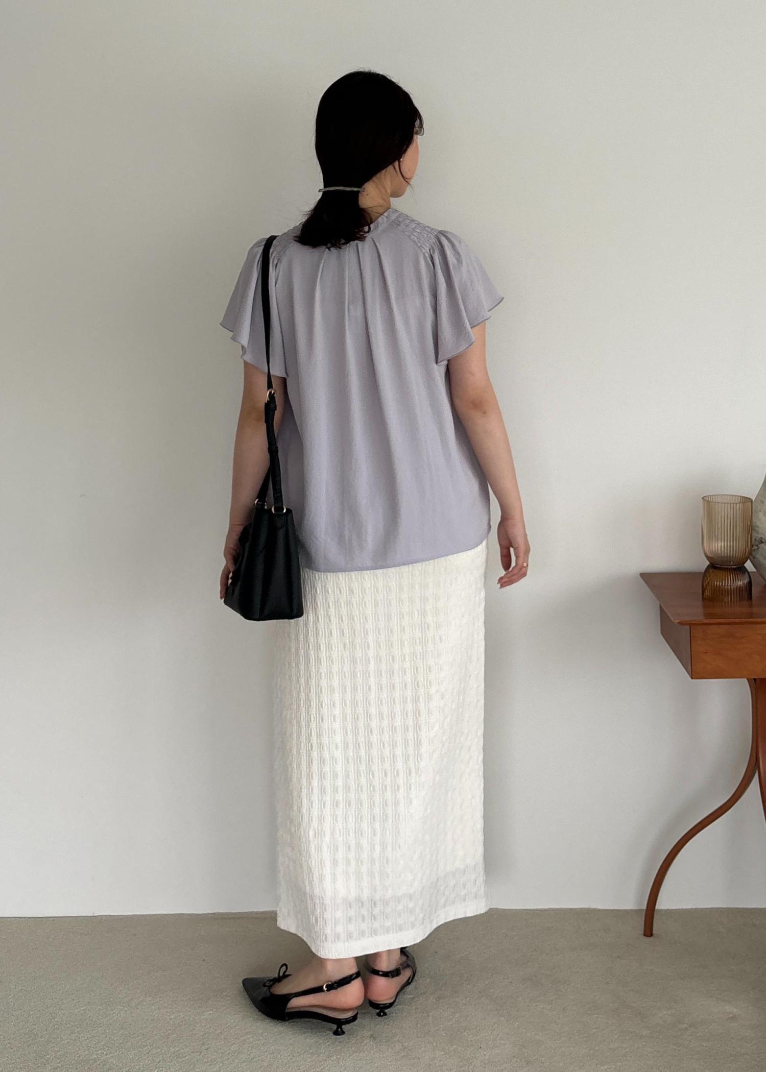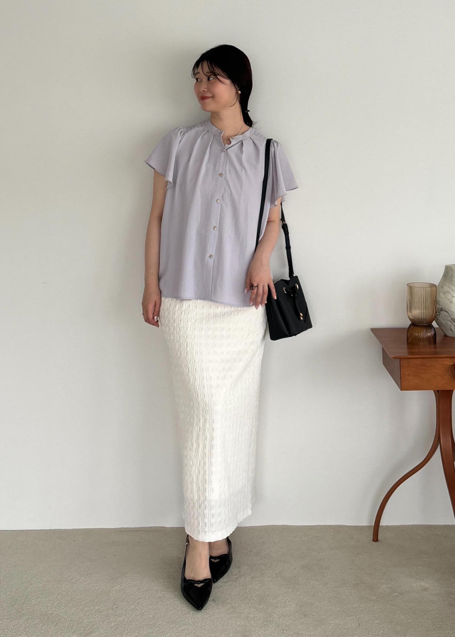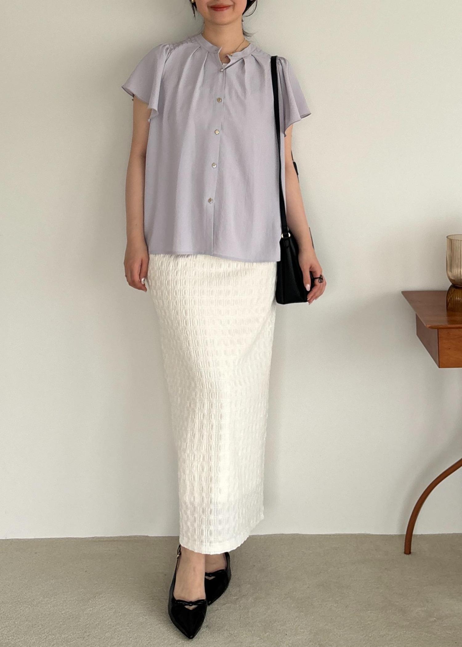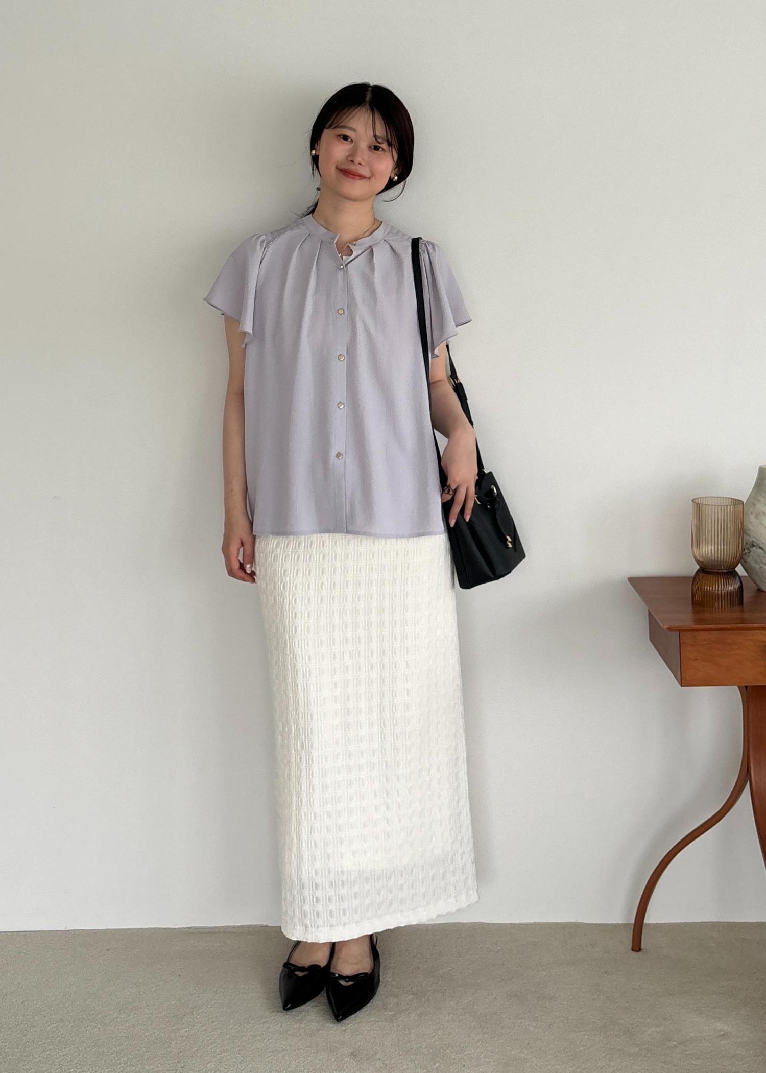 二の腕を綺麗にカバーしてくれるブラウスに、タイトスカートを合わせ、小物はブラックでしまりあるコーディネートにしてみました。