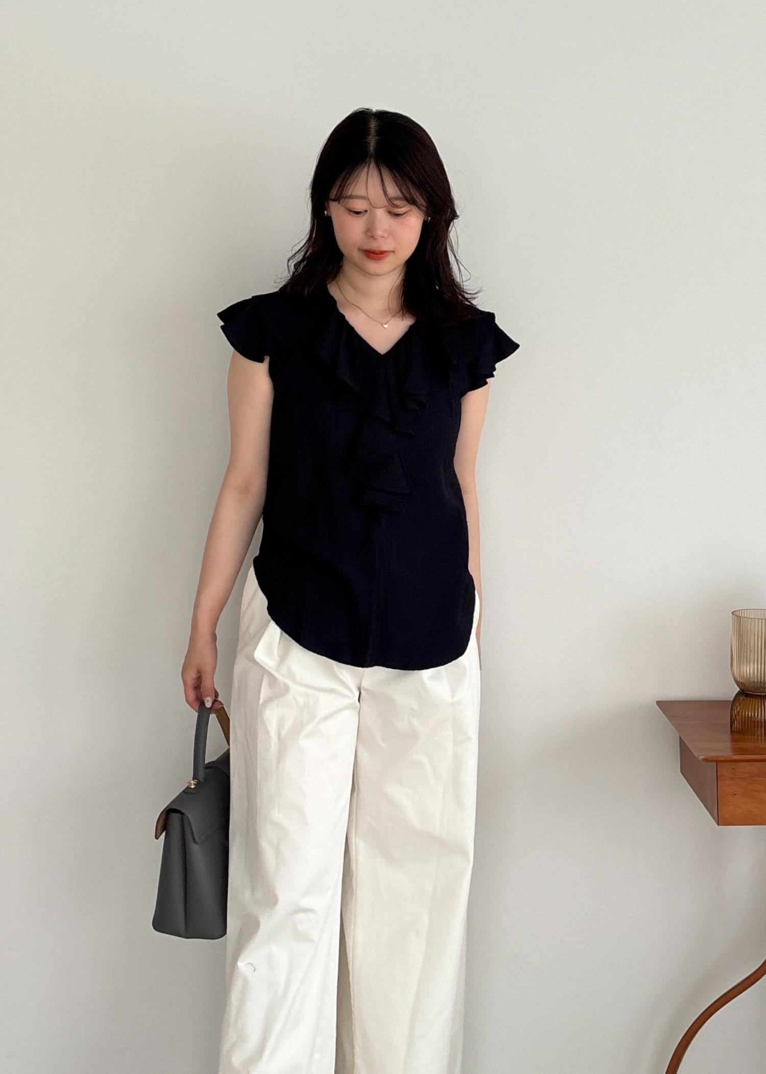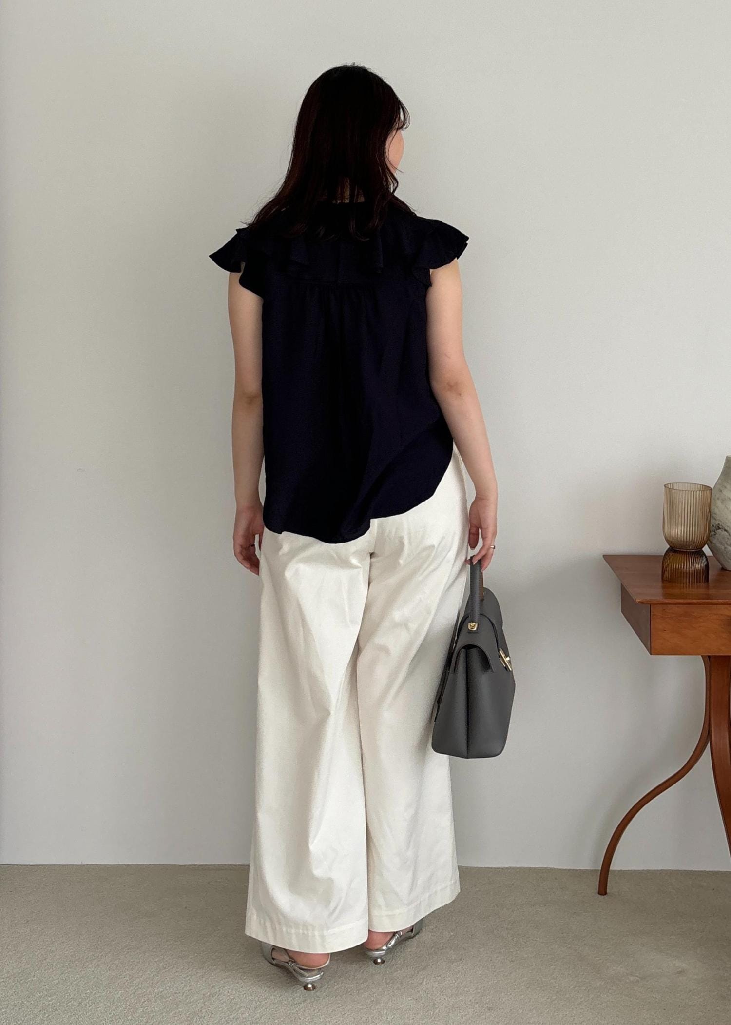 トレンドライクな縦フリルのトップスに、張り感のあるデニムパンツできれいめカジュアルなスタイルに!