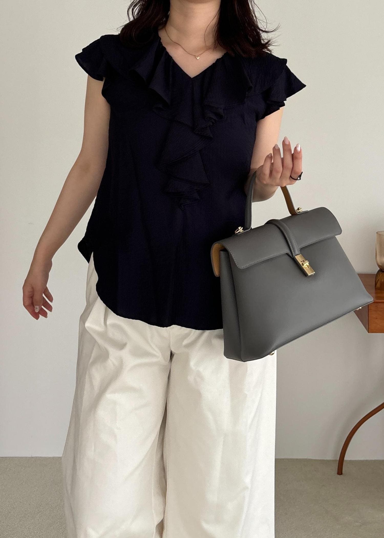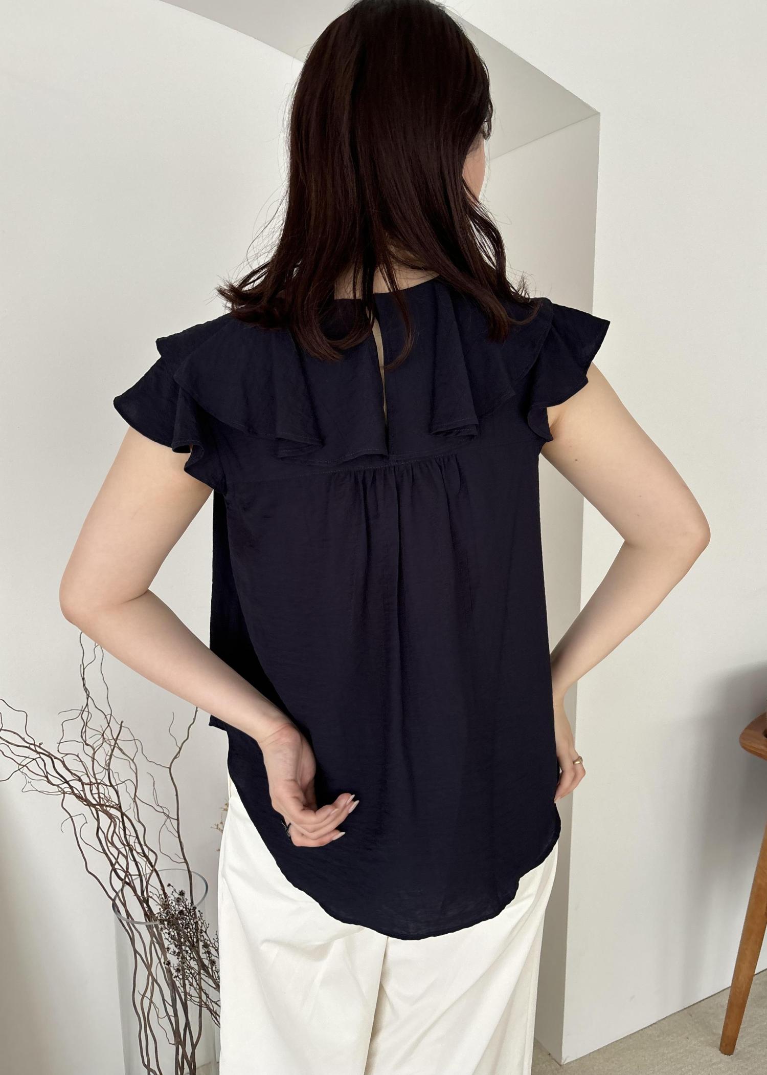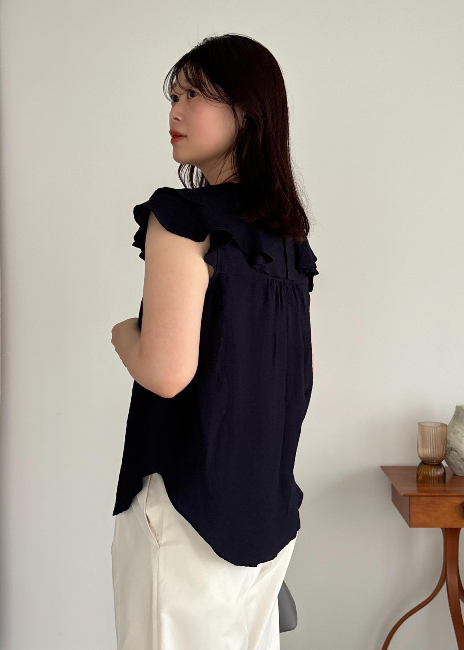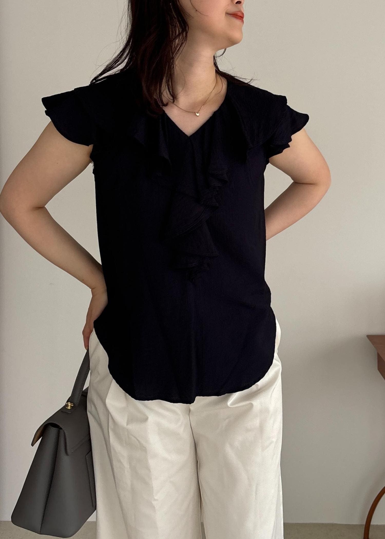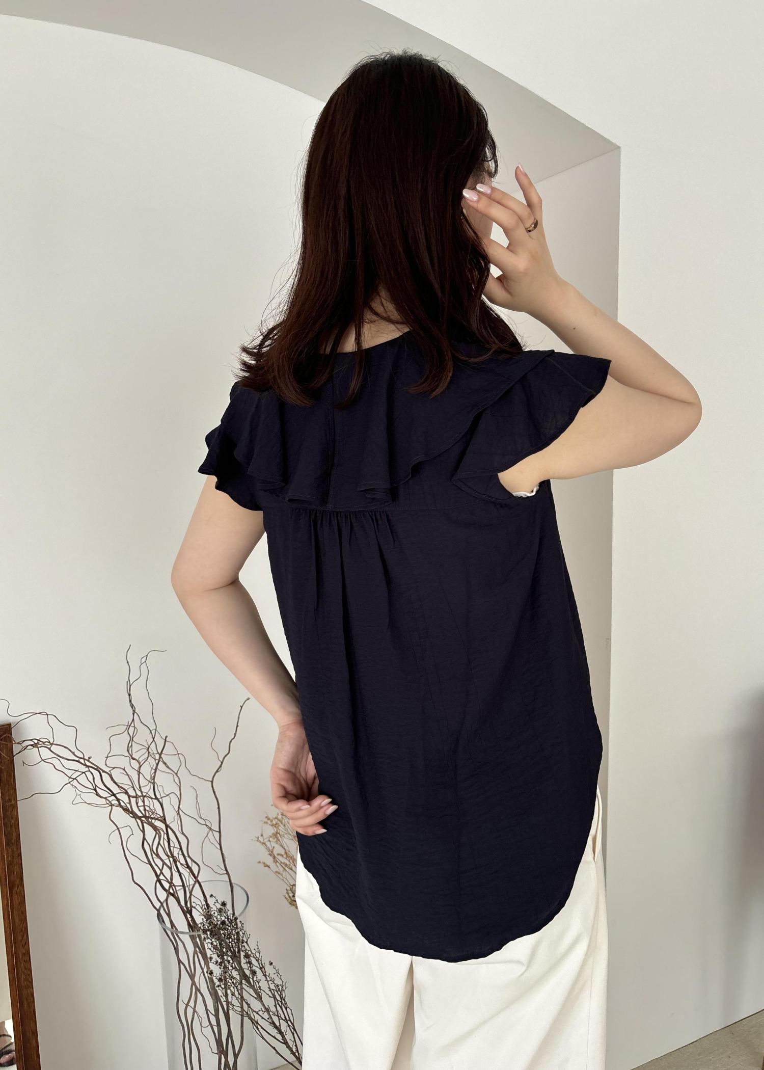 アウトレットVIS【WEB限定】ラッフルフリルフレンチスリーブブラウスネイビー / F¥3,457レビュー縦フリルの華やかなデザインで、着心地は窮屈感ないサイズで涼しいです。