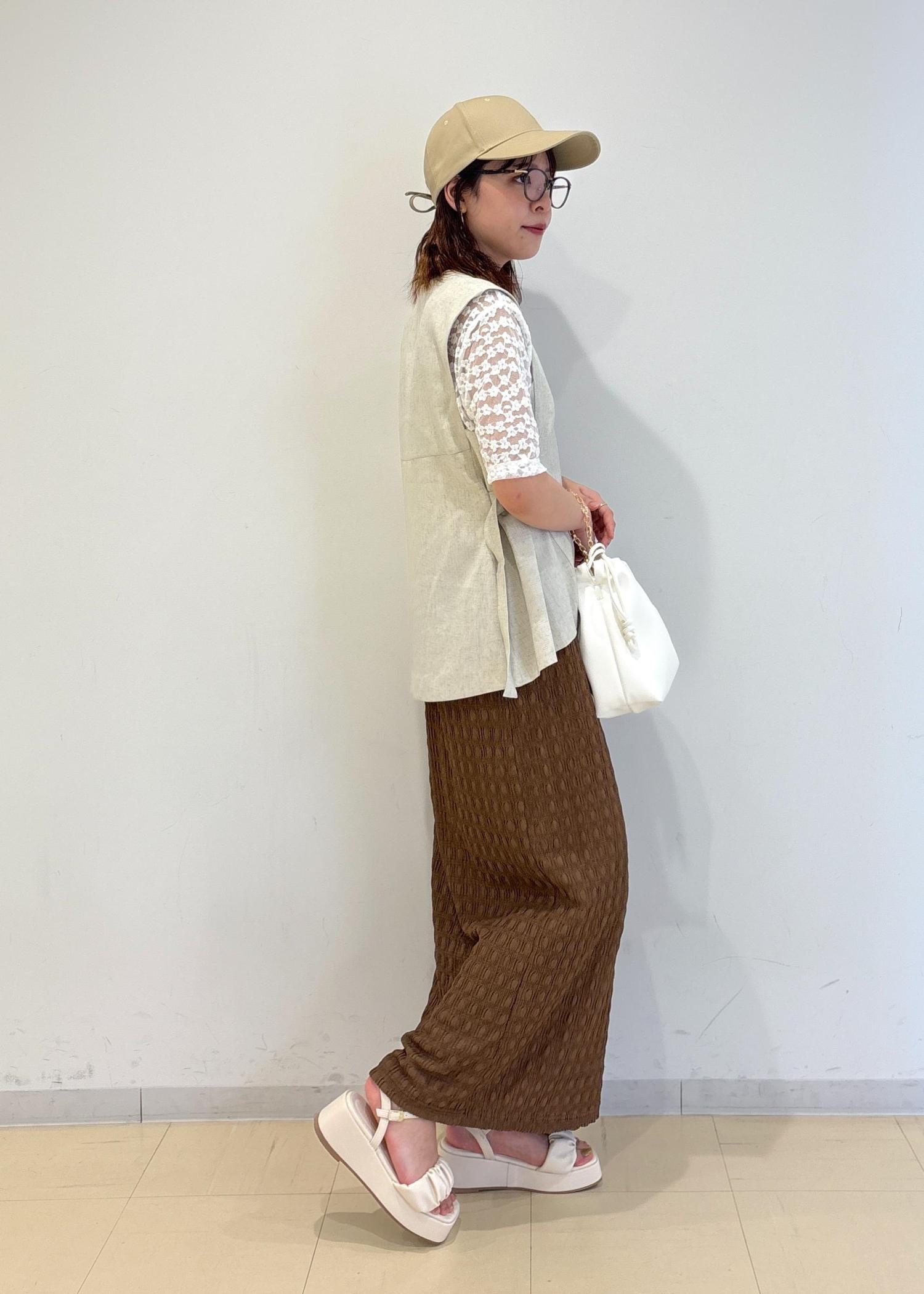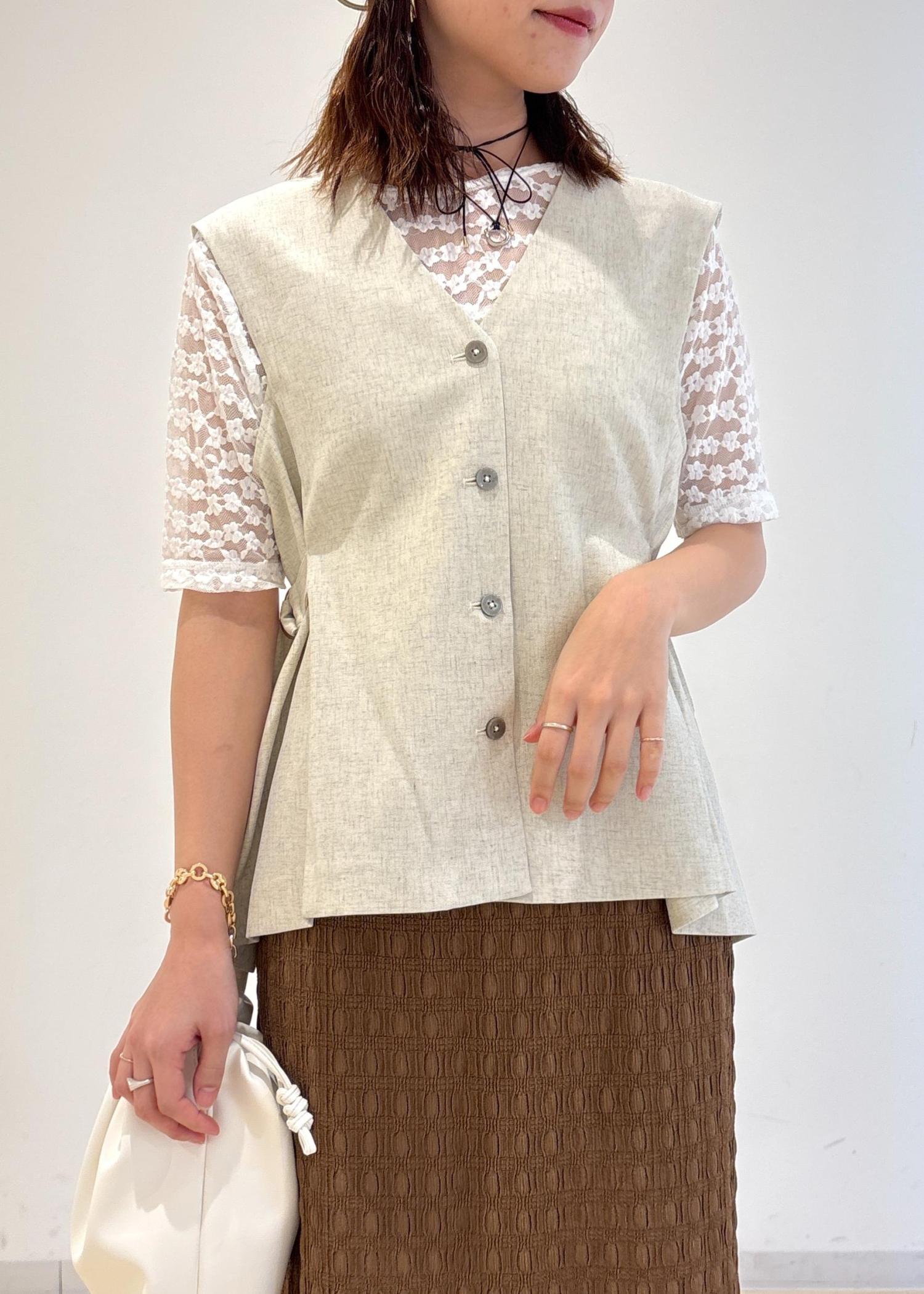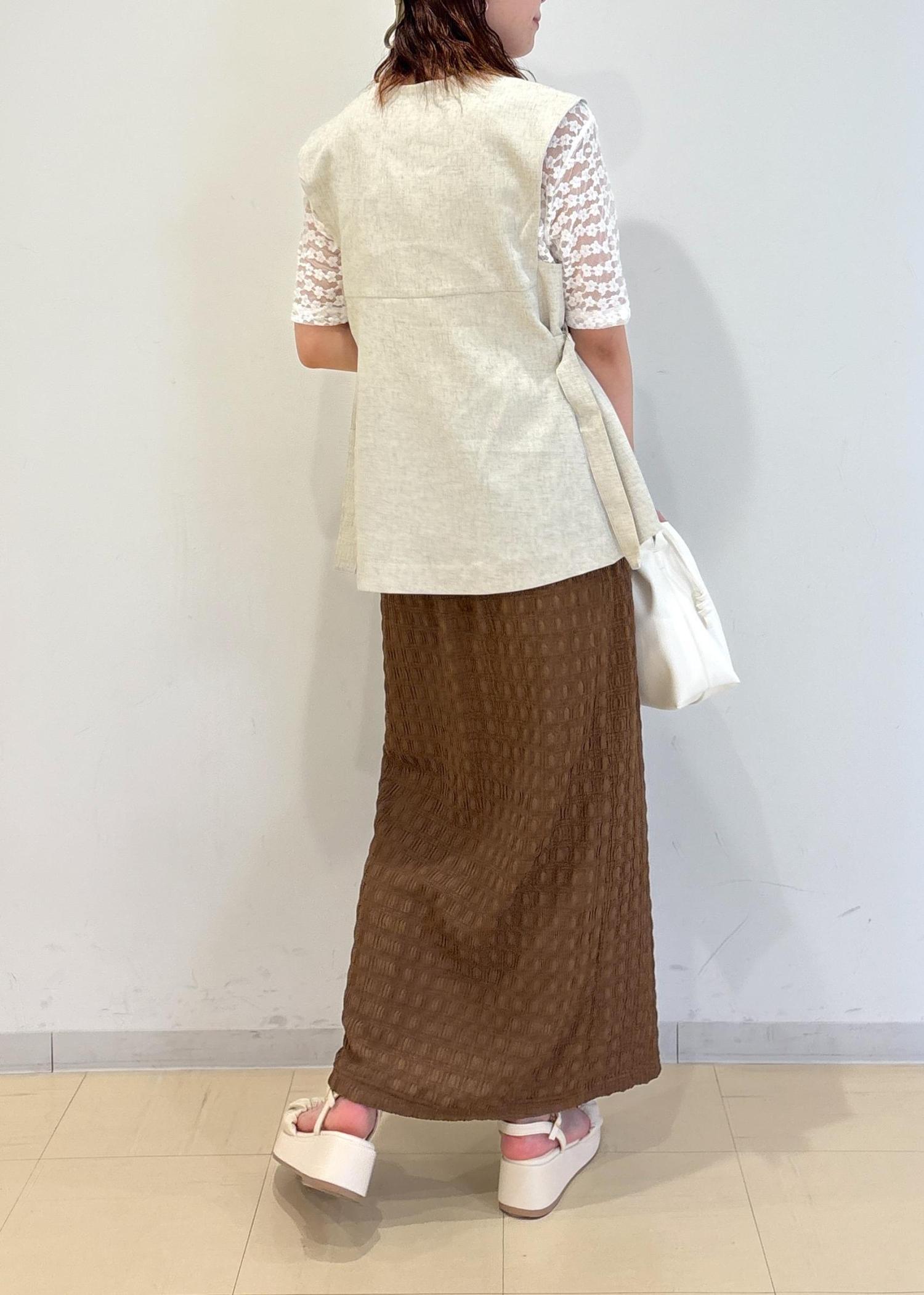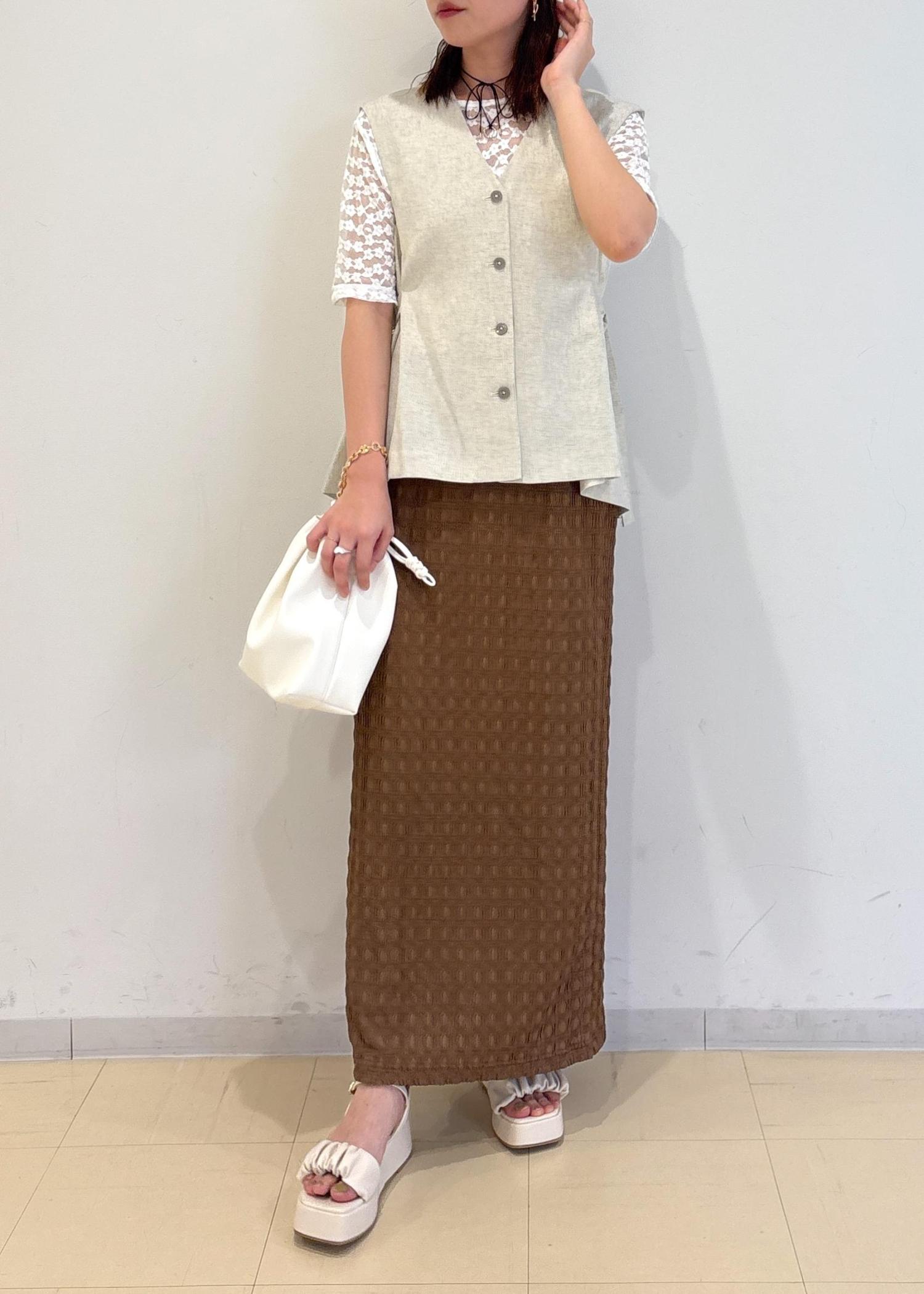 レースのインナーは日差しが強い時期でも涼しく二の腕もカバーしながら着ていただけ、ジレとタイトスカートで女性らしさをプラスしました◎
