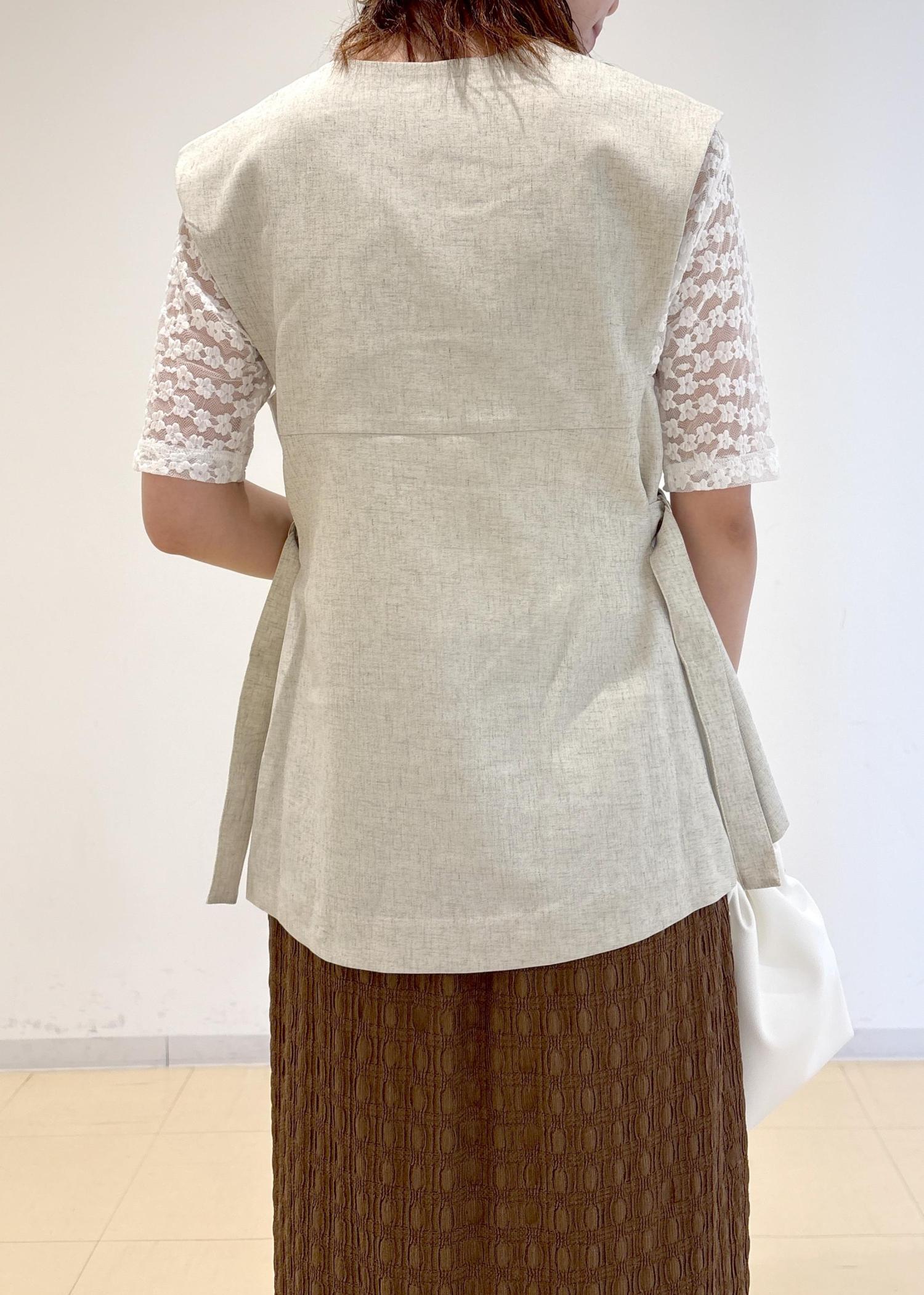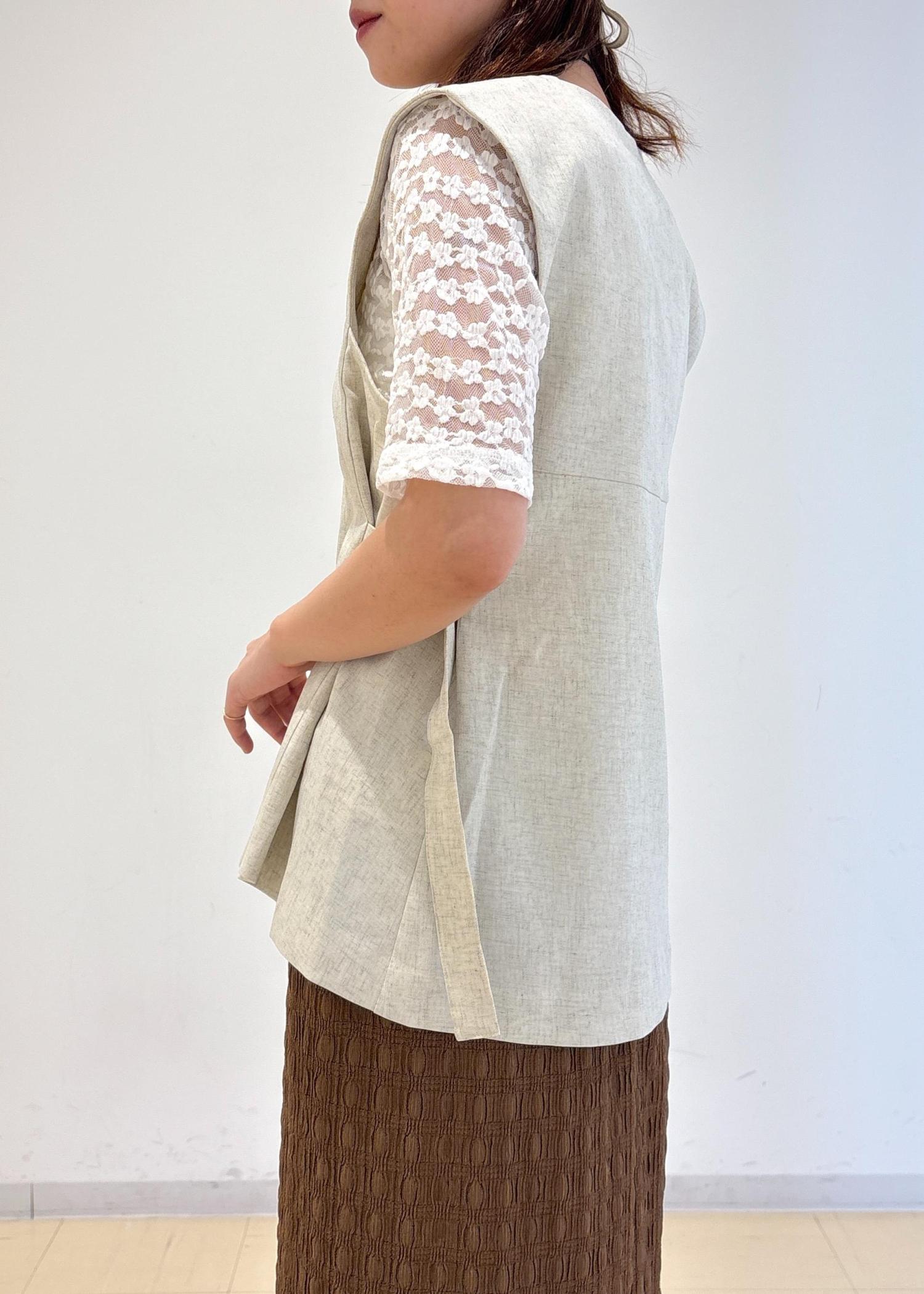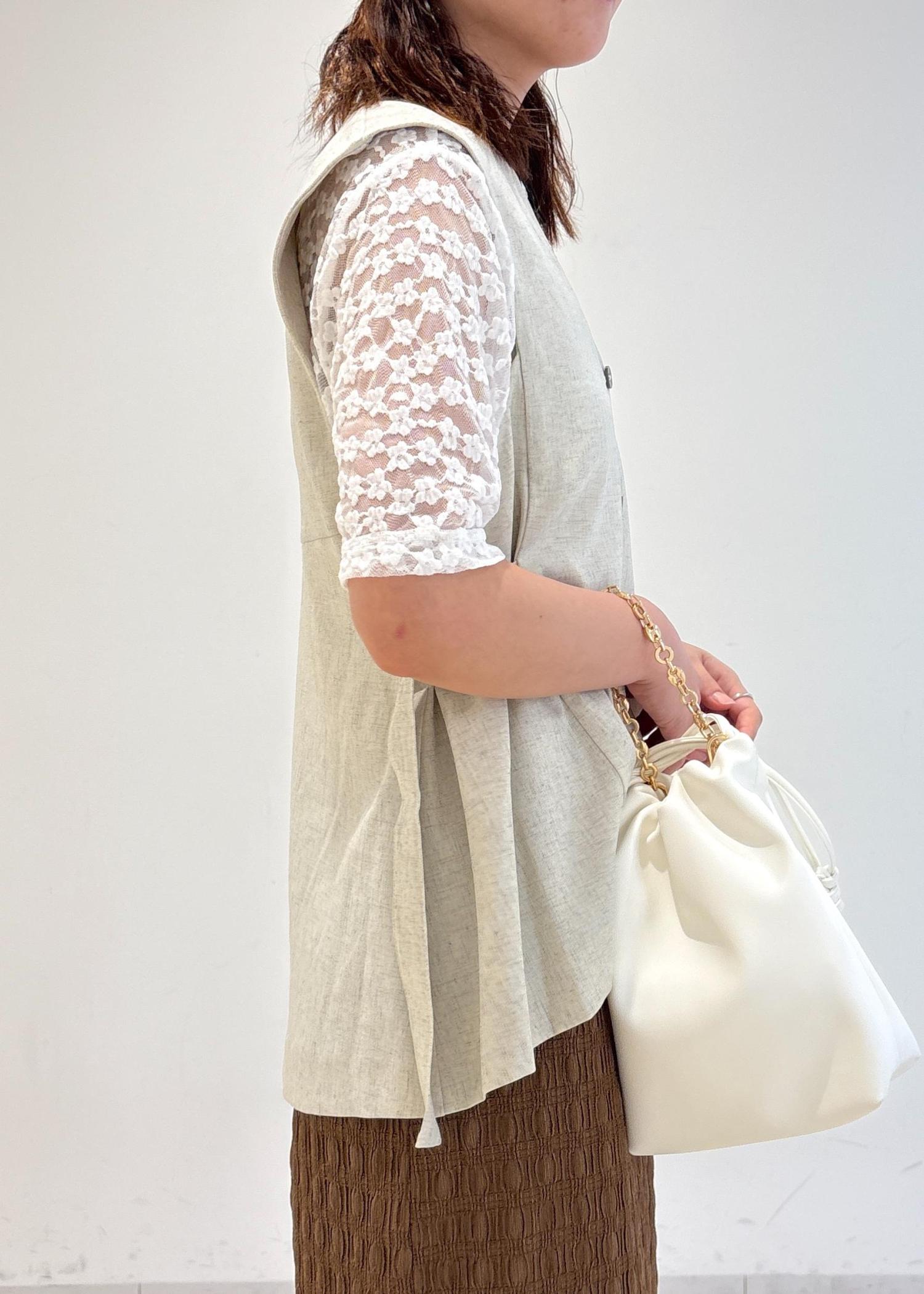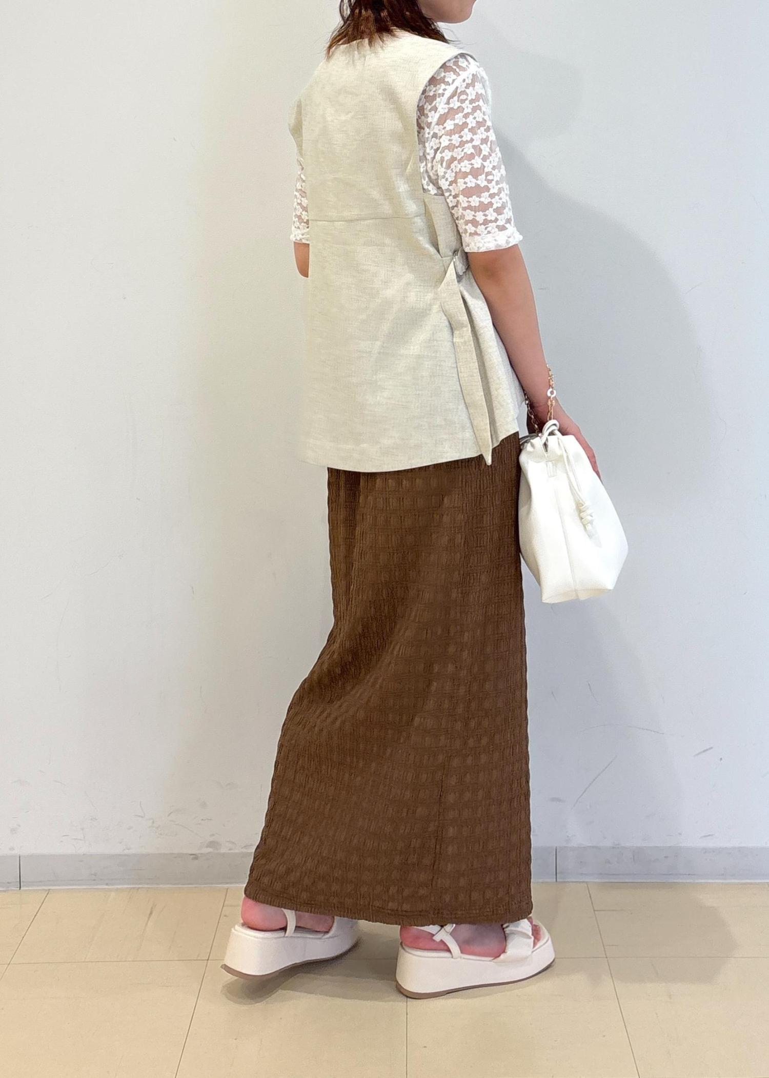 レースのインナーは日差しが強い時期でも涼しく二の腕もカバーしながら着ていただけ、ジレとタイトスカートで女性らしさをプラスしました◎
