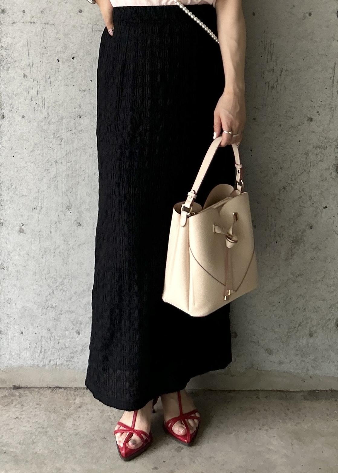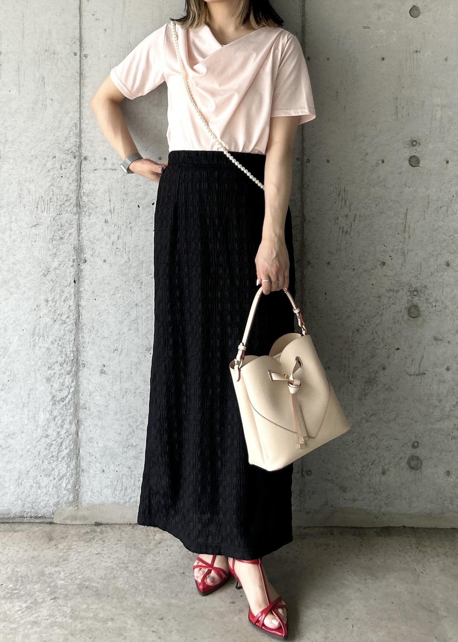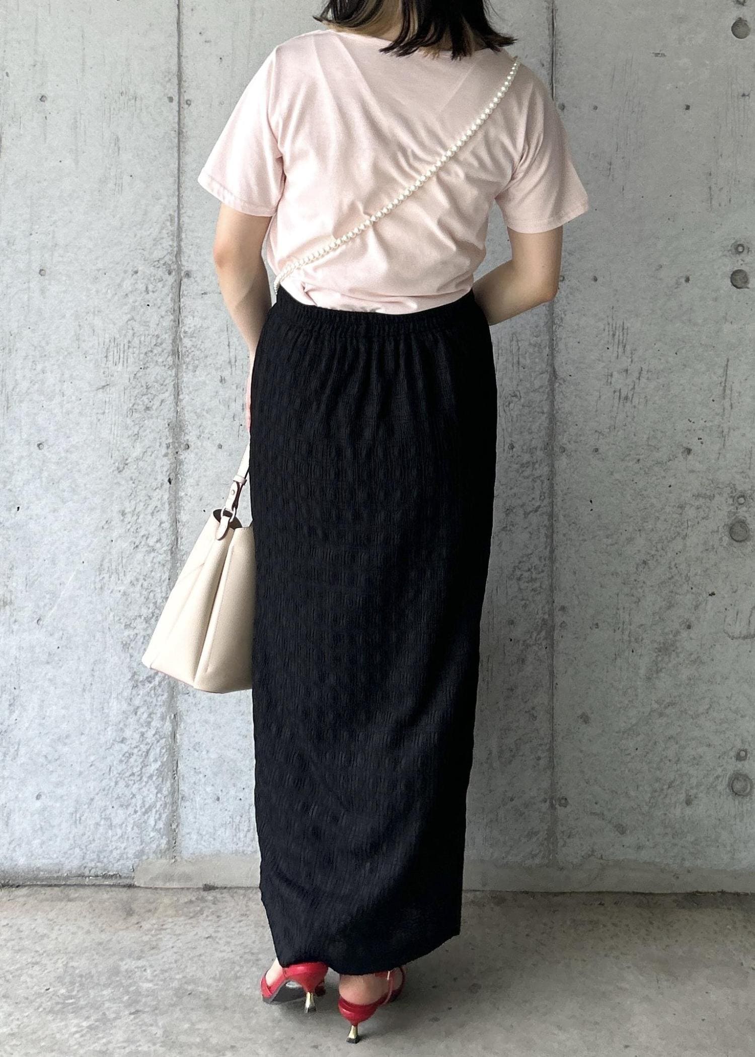 アウトレットVIS【新色追加】【接触冷感】膨れジャガードナロースカートブラック / F¥3,293レビュー157cmでおへそが隠れるくらいのハイウエストで履くと、くるぶしにかかる着丈でした。