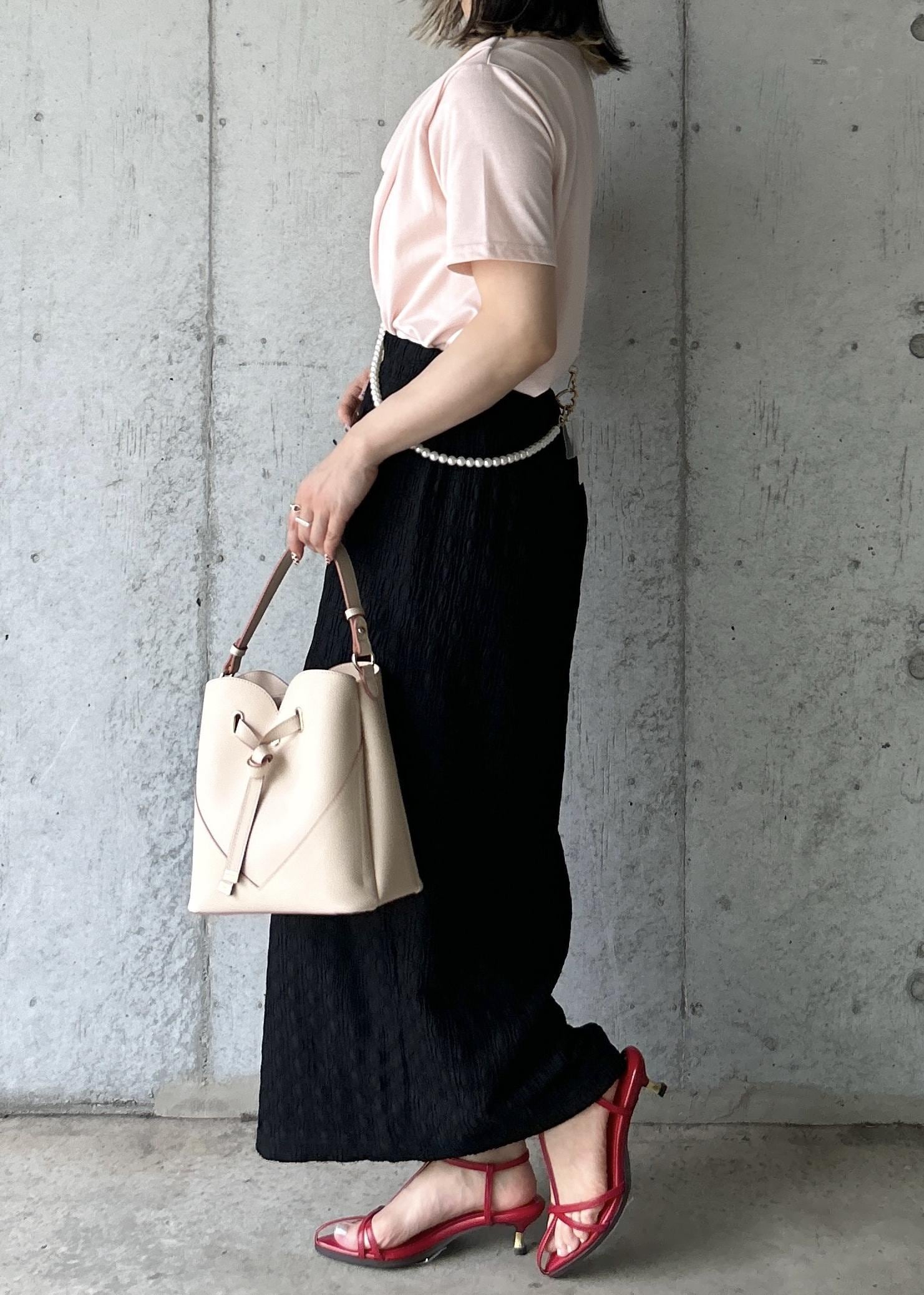 フラットシューズでも裾を引きずらない長さでしたが、3〜5cmくらいのヒールがあるとより綺麗なシルエットで着用できそうです◎(画像は4.5cmヒールあわせです)
