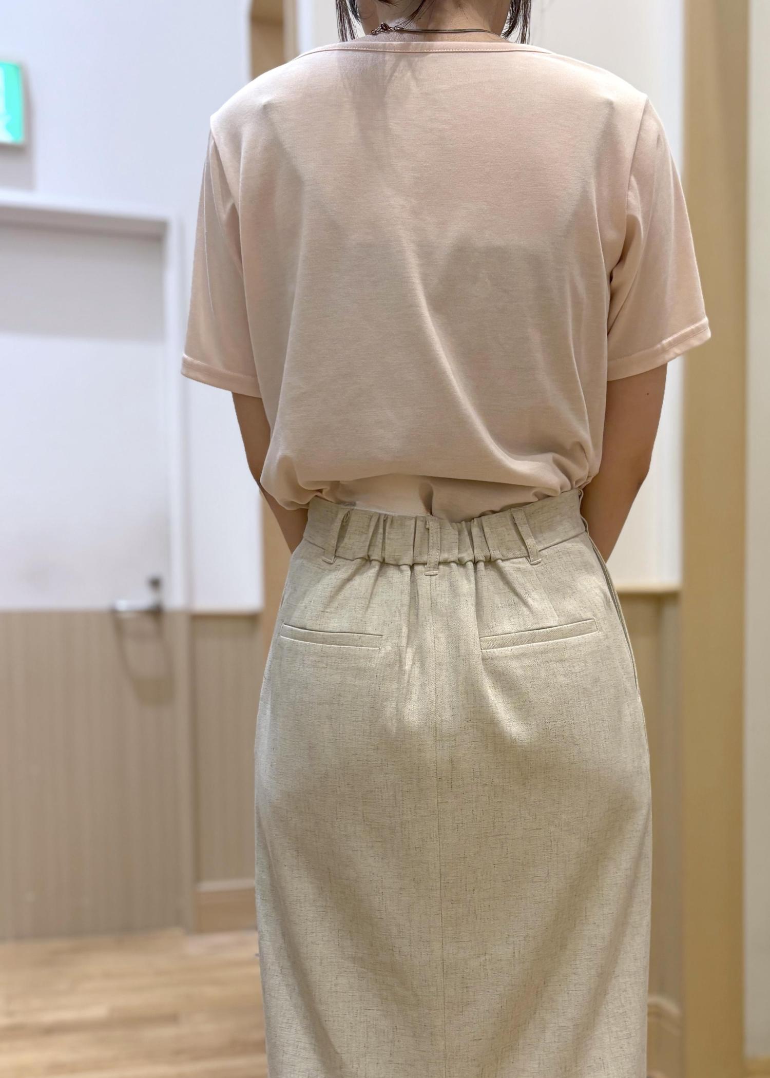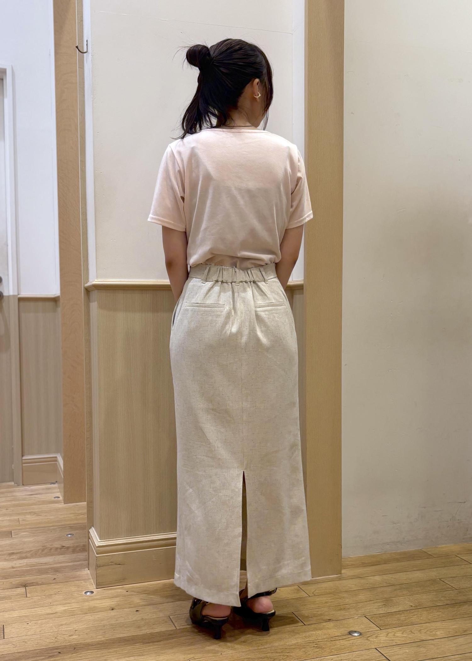 スリットは後ろに入っており、膝下くらいまであります。 -