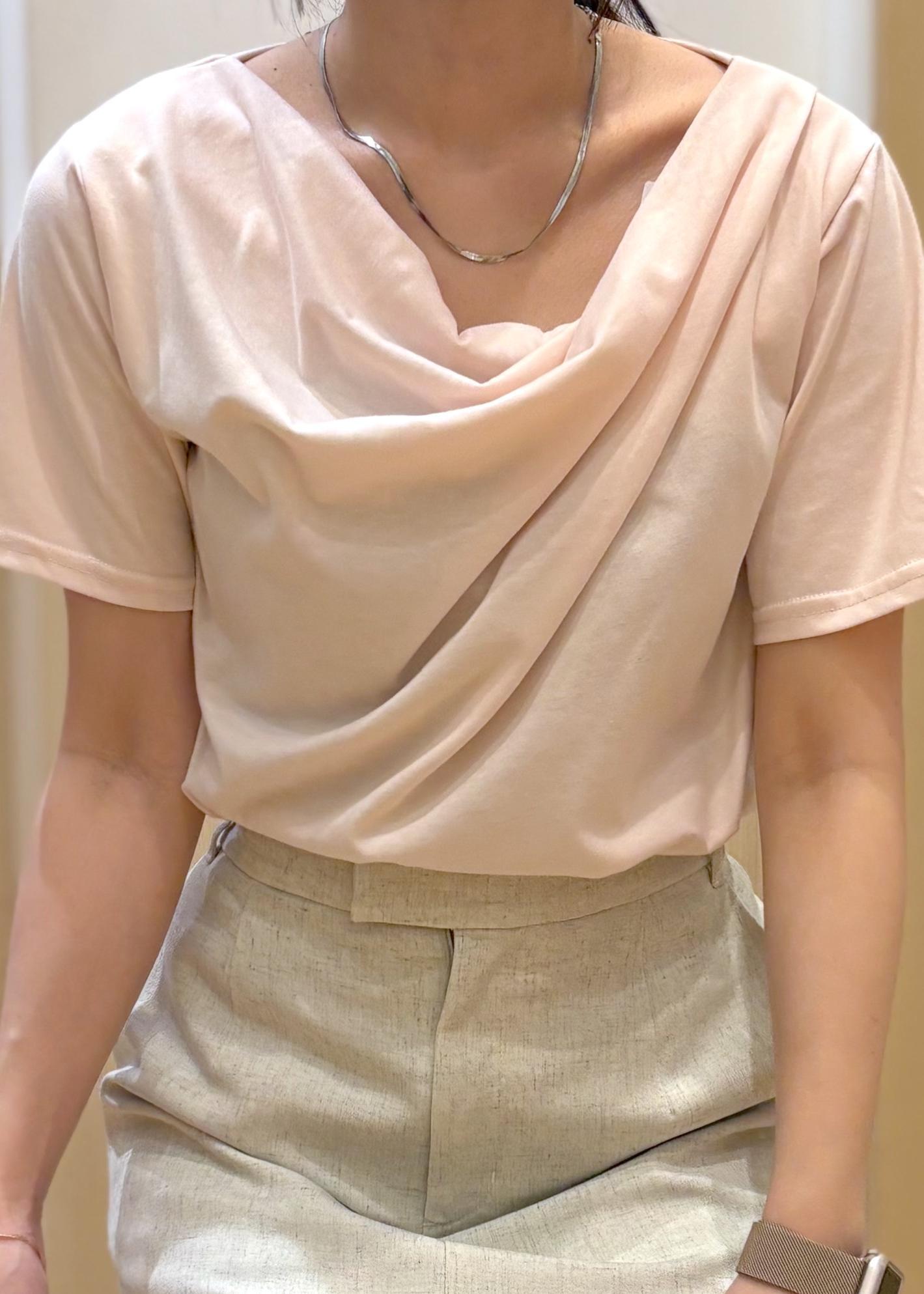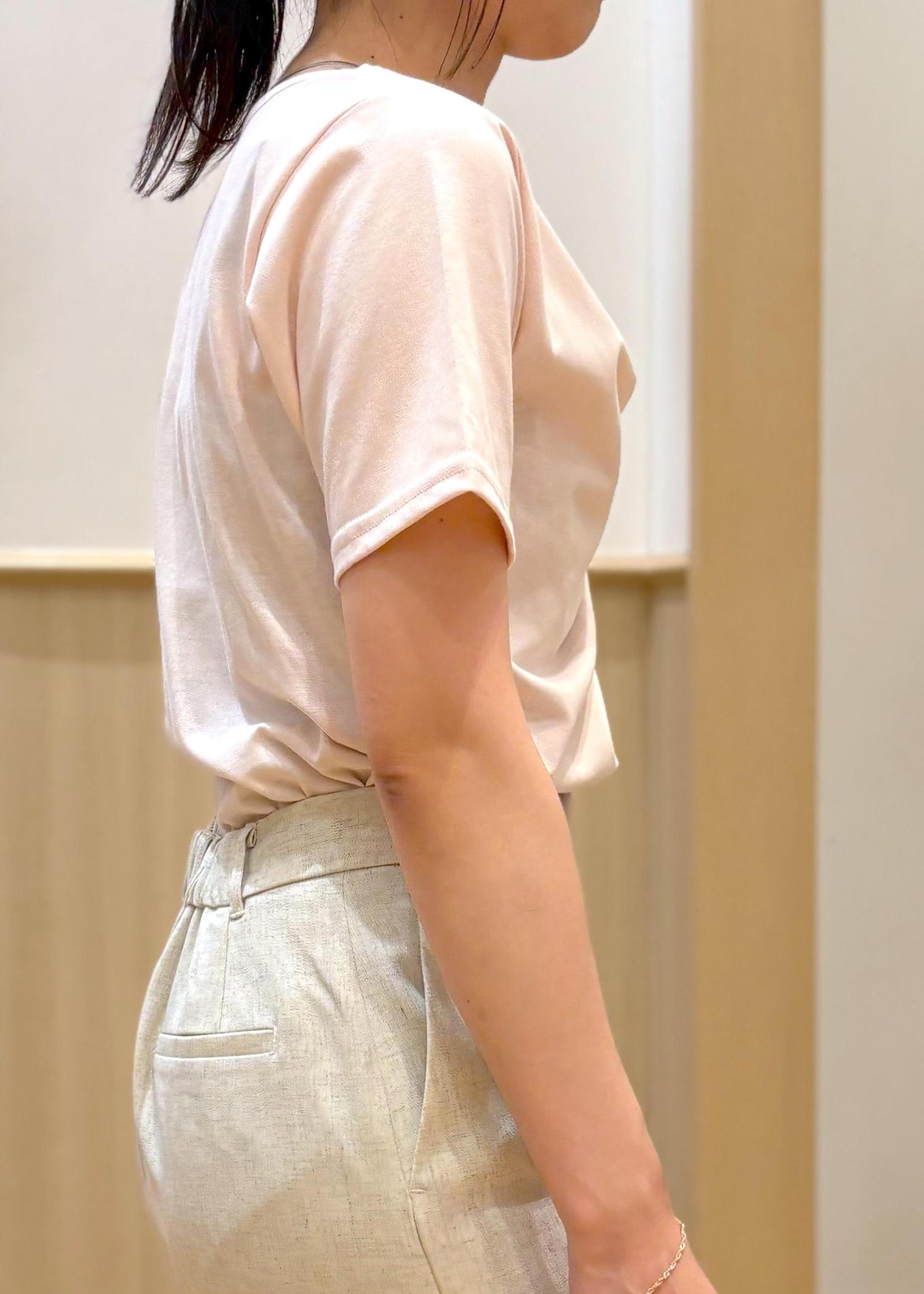 胸元はドレープのデザインが施されていて、首の開きが広めに見えますが、肩幅がしっかりあるタイプの方でしたらぎりぎりインナーの肩紐が見えないくらいで着用できます。