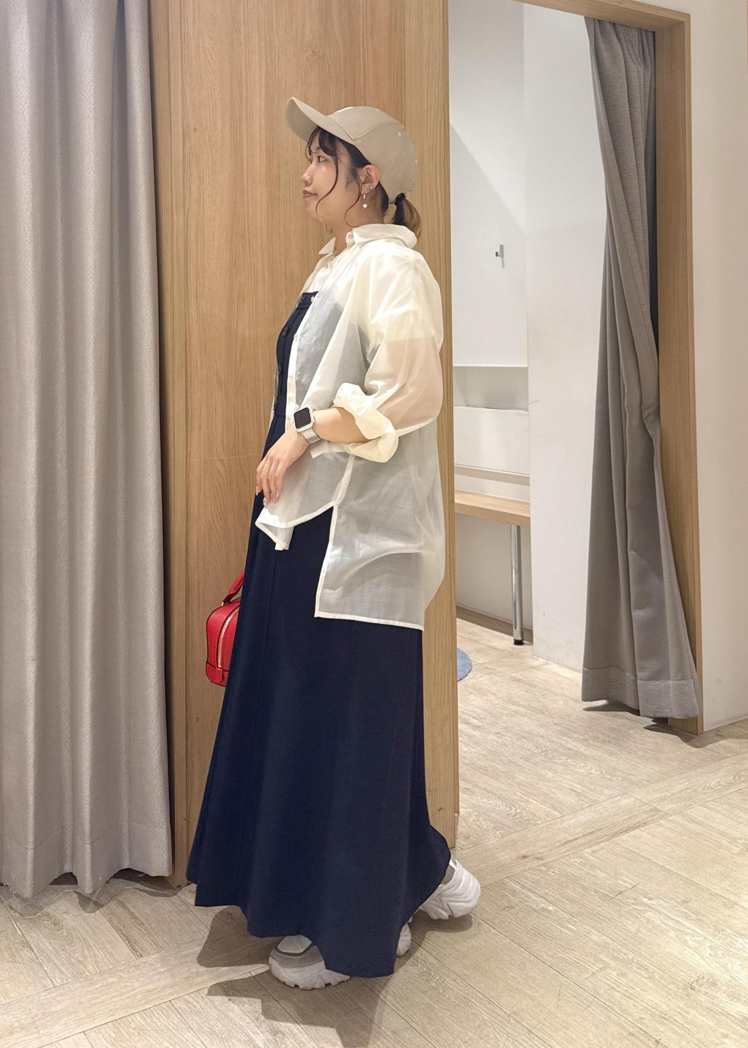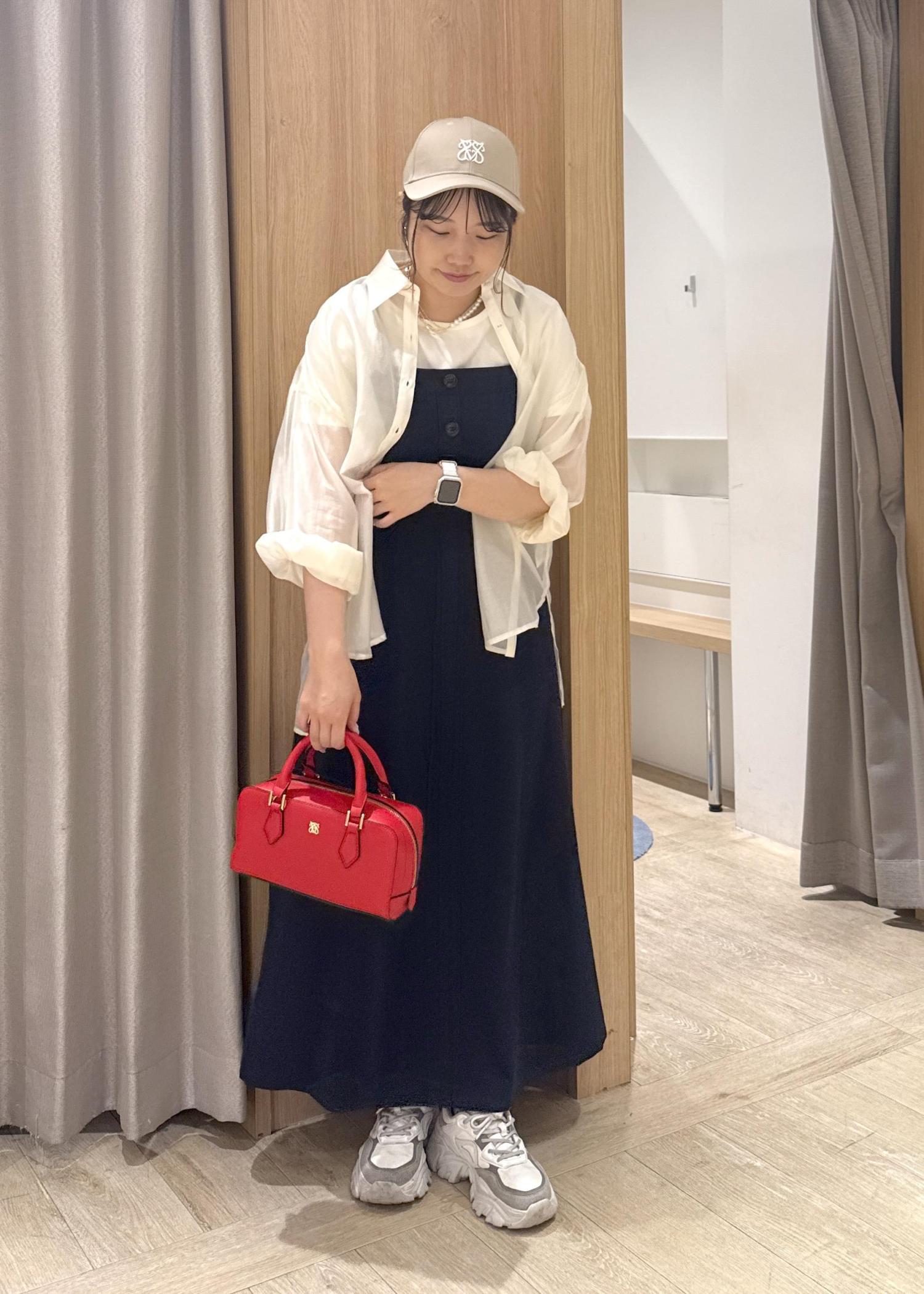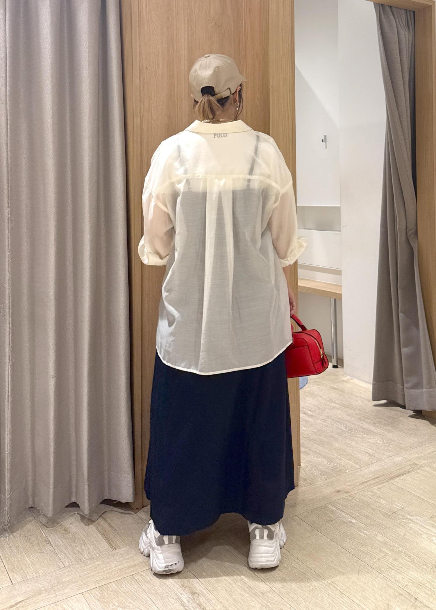 冷房対策、少しの日焼け対策としても使えるシアーシャツを羽織り、POLO感を出すために赤のバッグを合わせました!