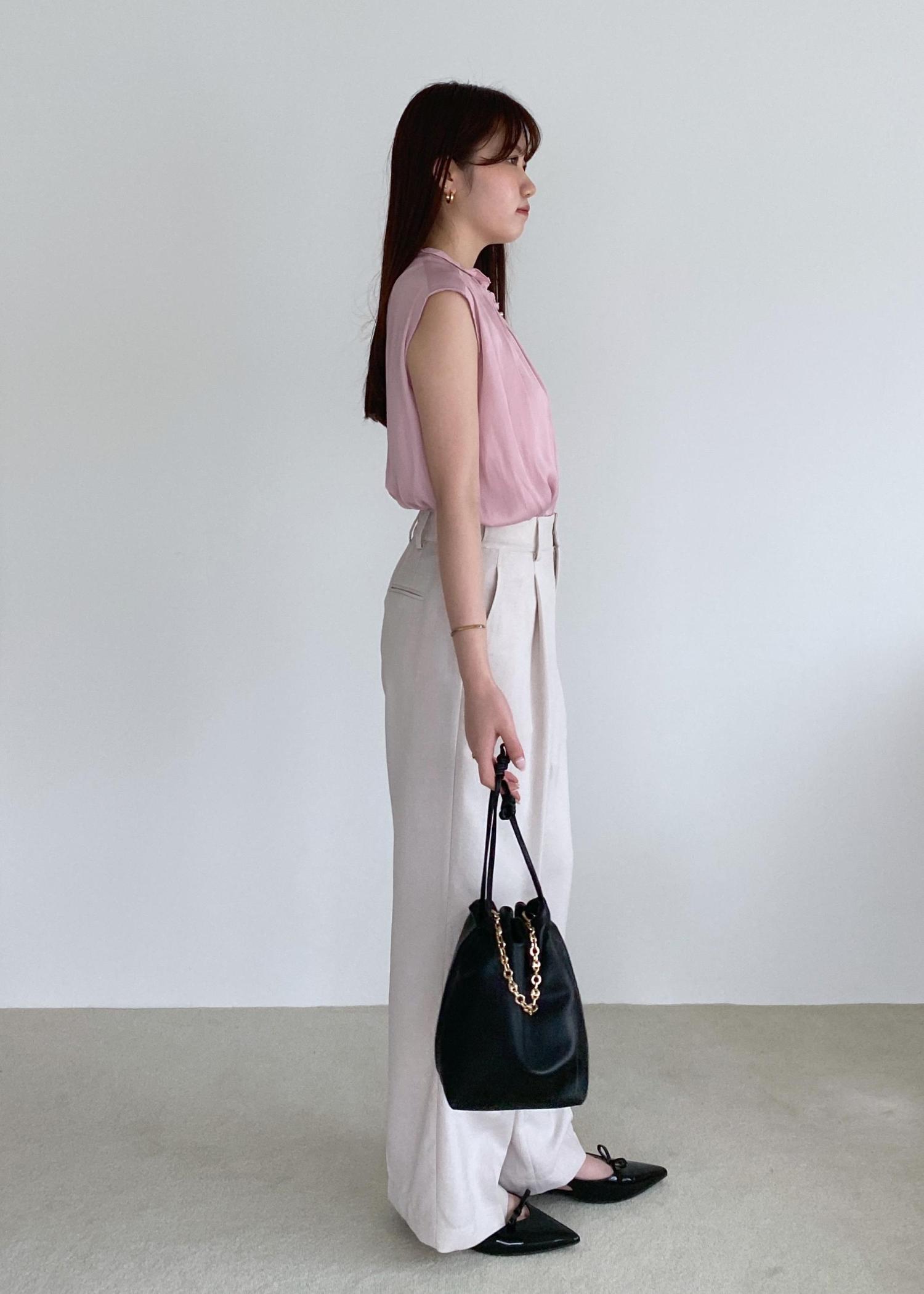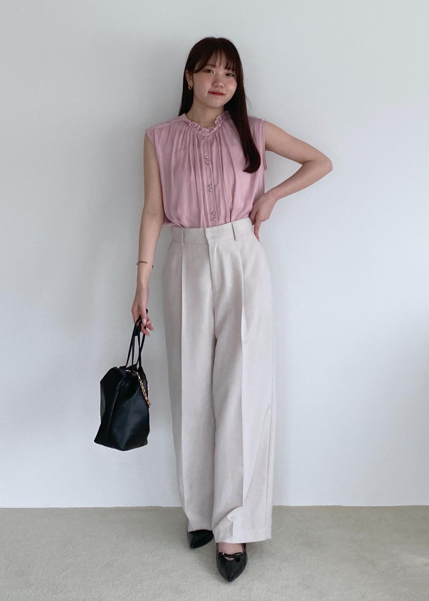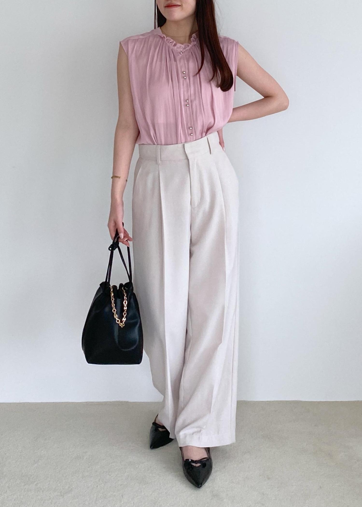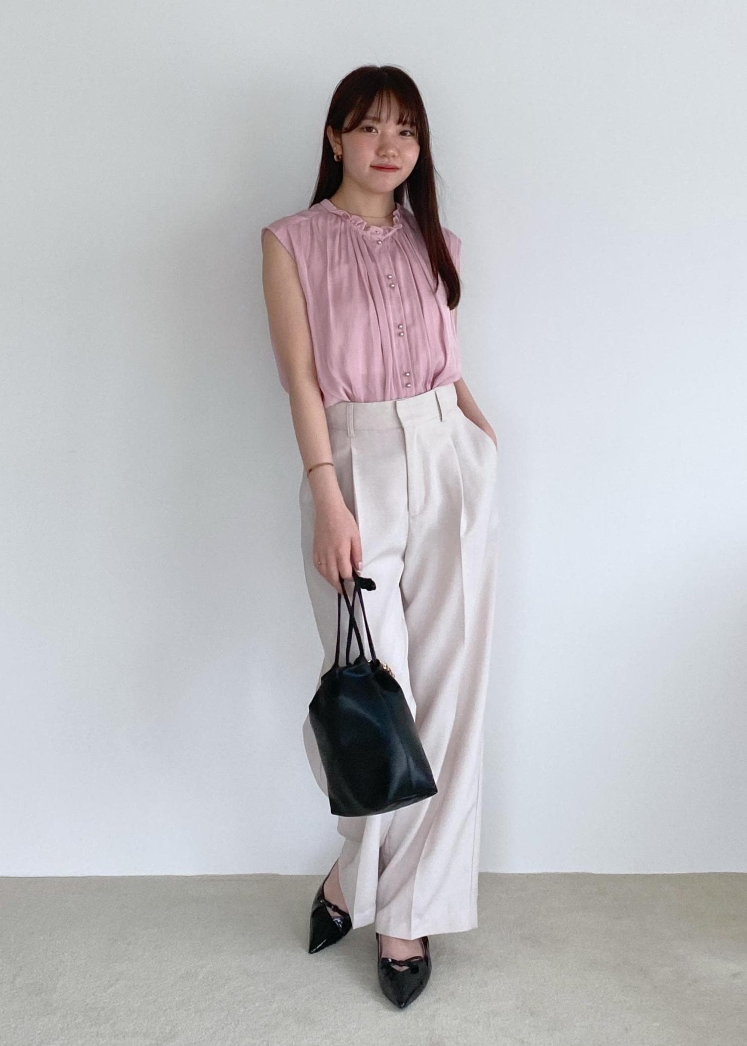 ピンクの上品なブラウスに、美easyワイドパンツを合わせて大人フェミニンなスタイリングに!