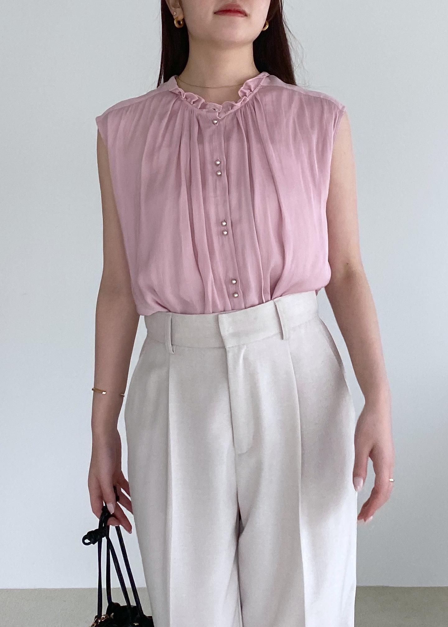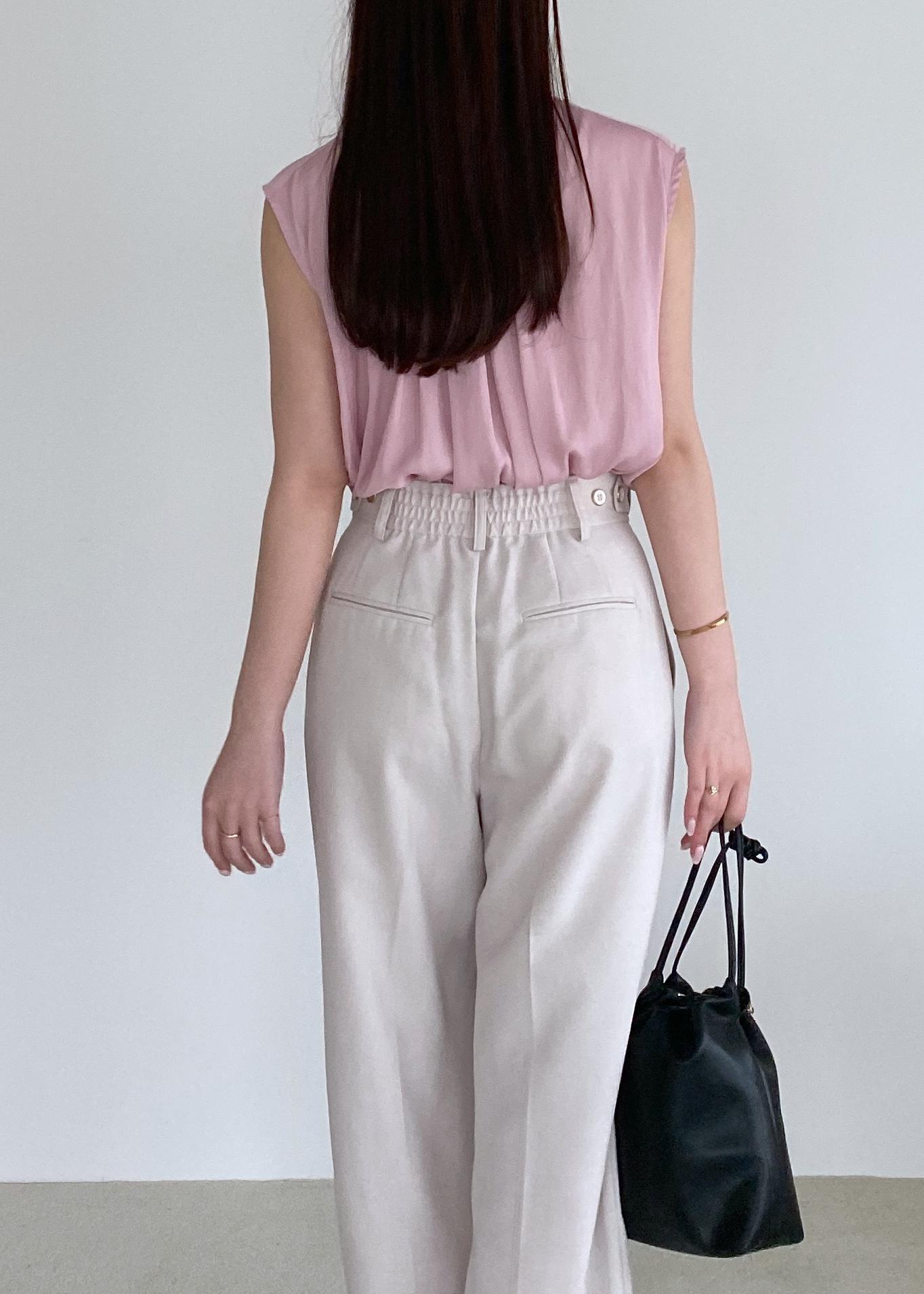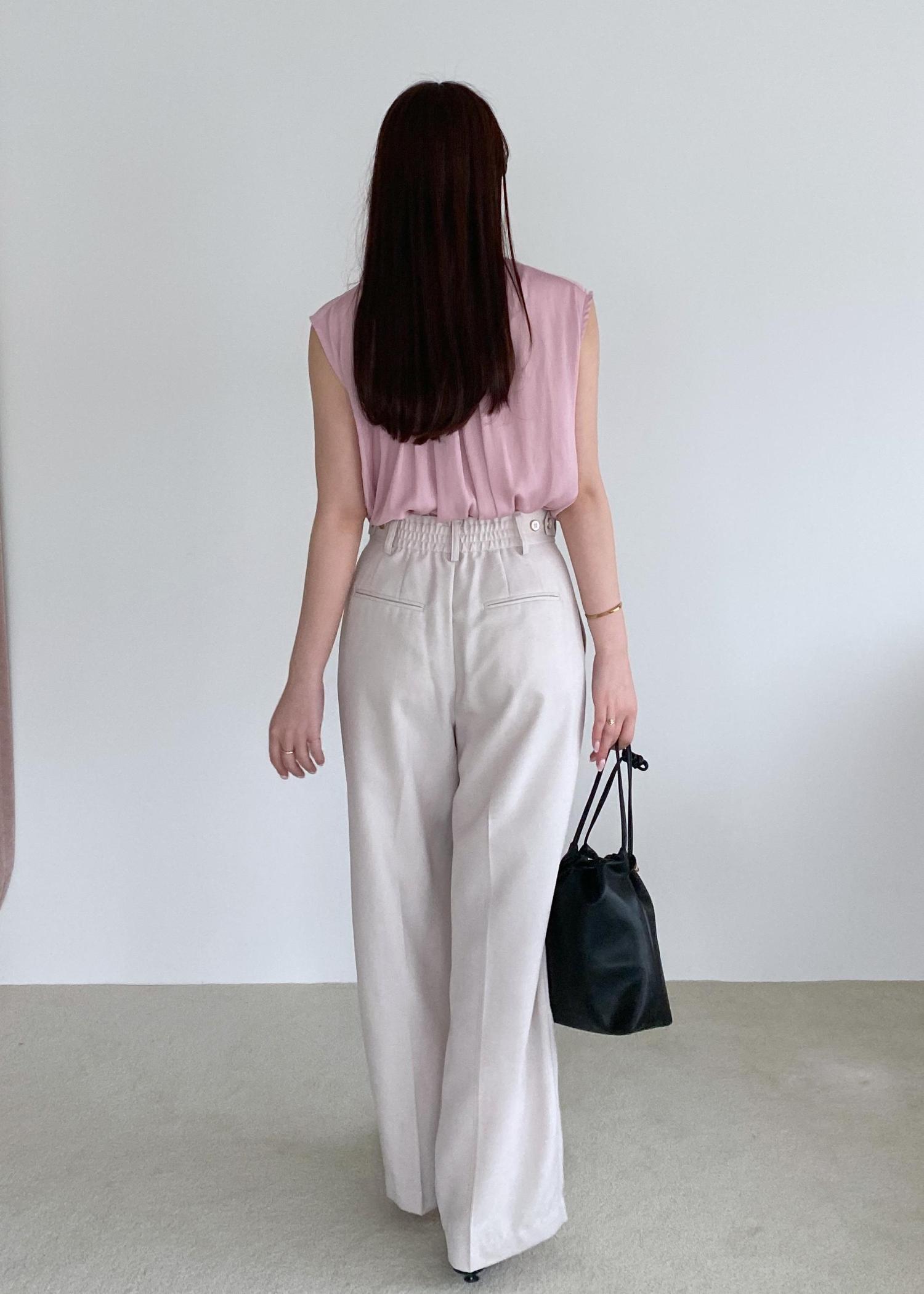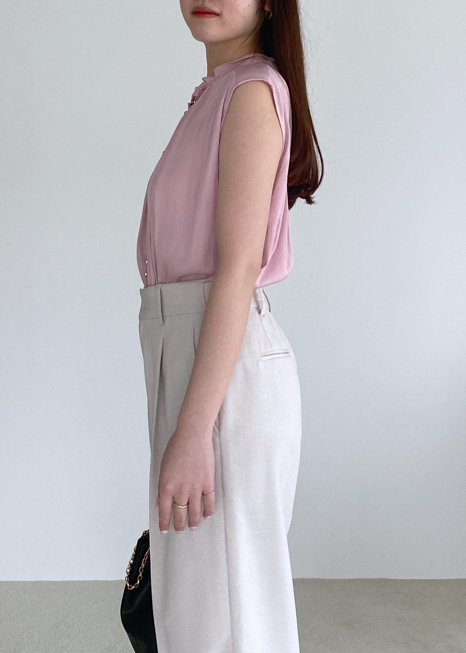 ピンクの上品なブラウスに、美easyワイドパンツを合わせて大人フェミニンなスタイリングに!