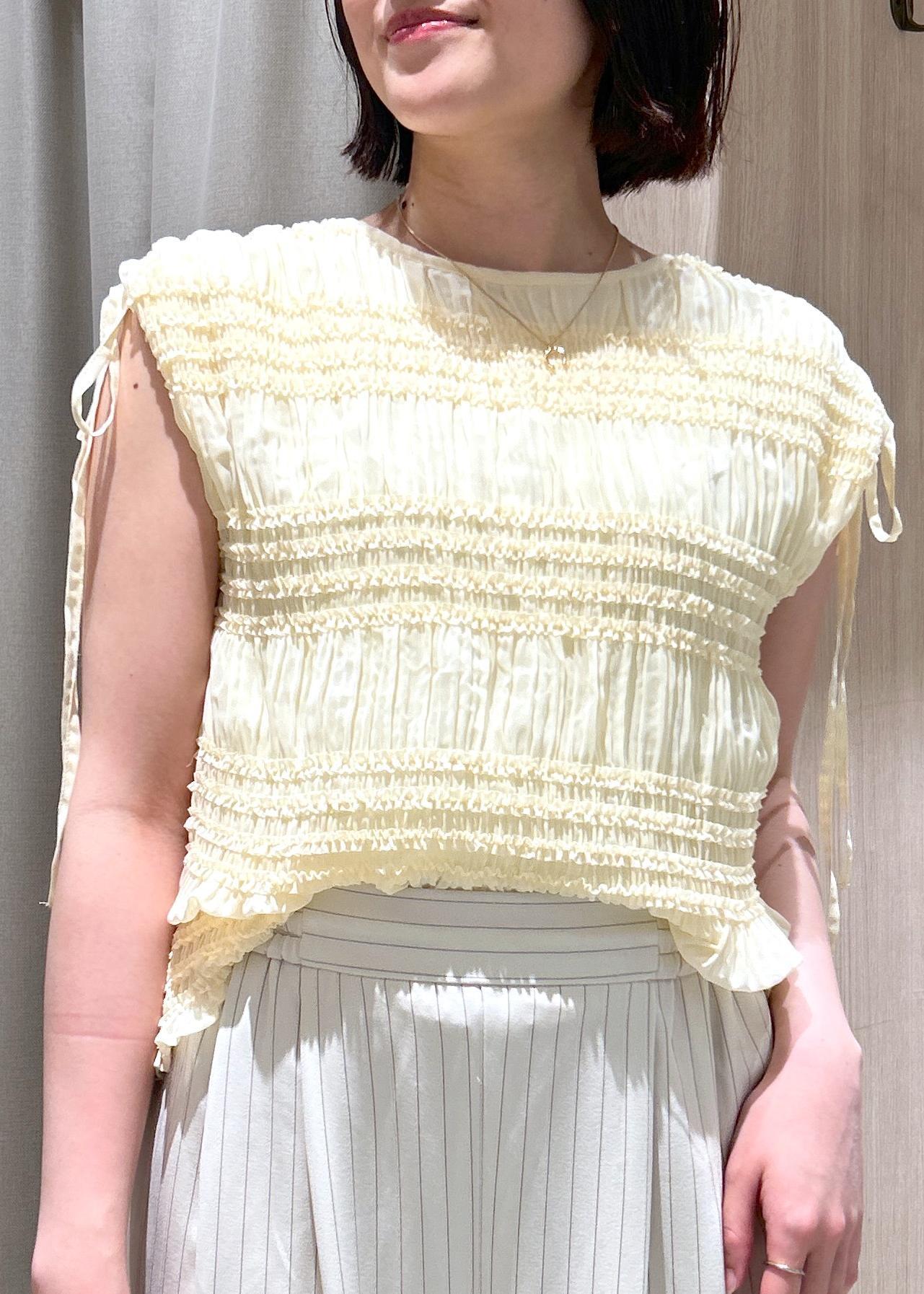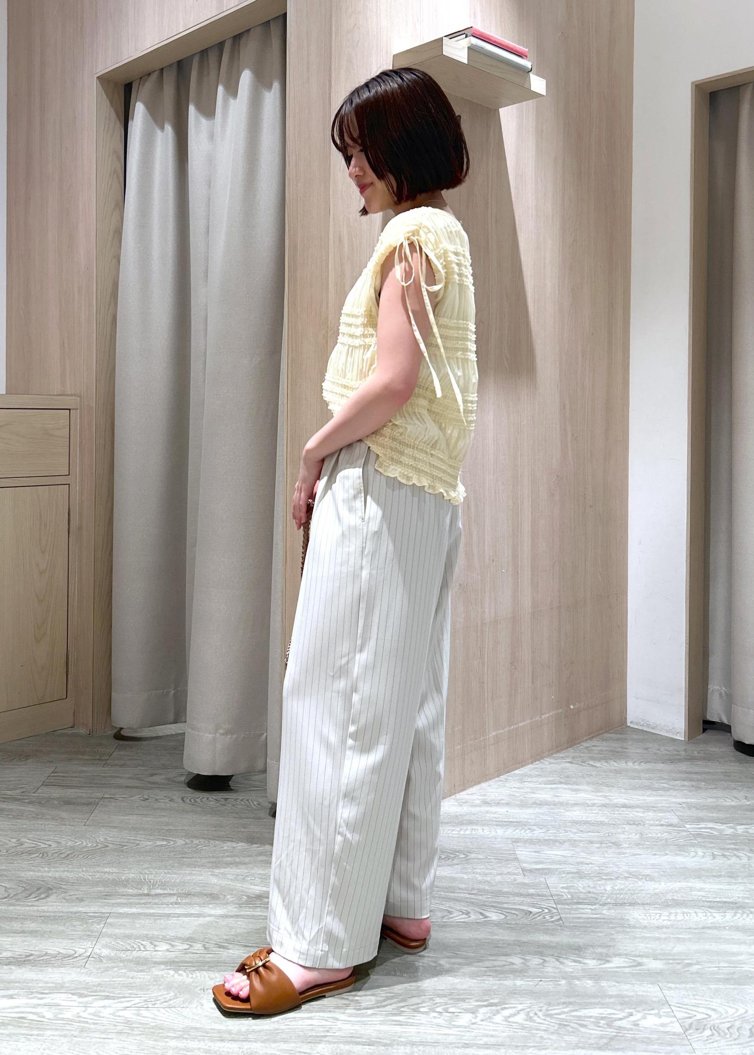 ブラウスの肩のリボンがチラッと見えるので女性らしい印象に♪