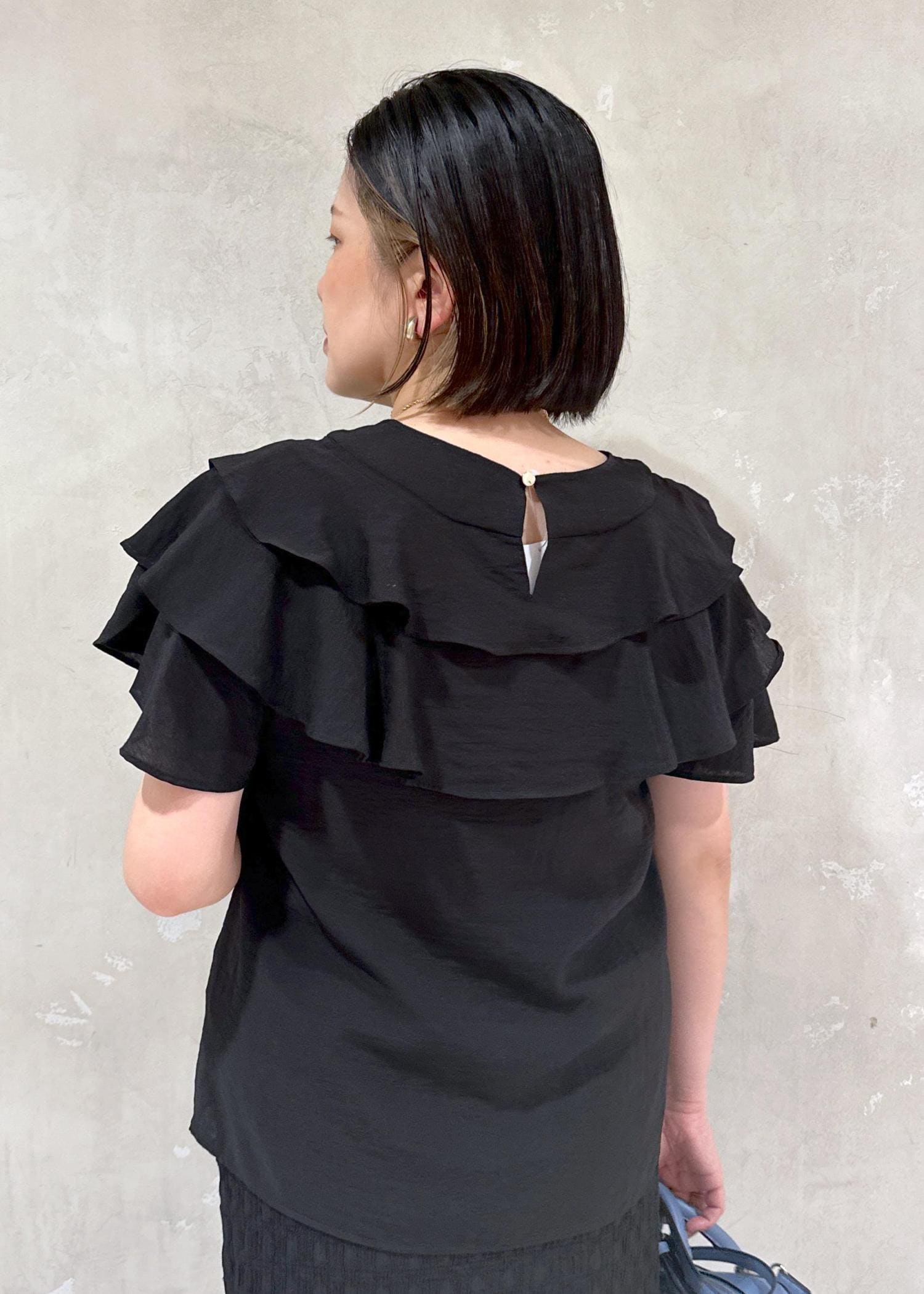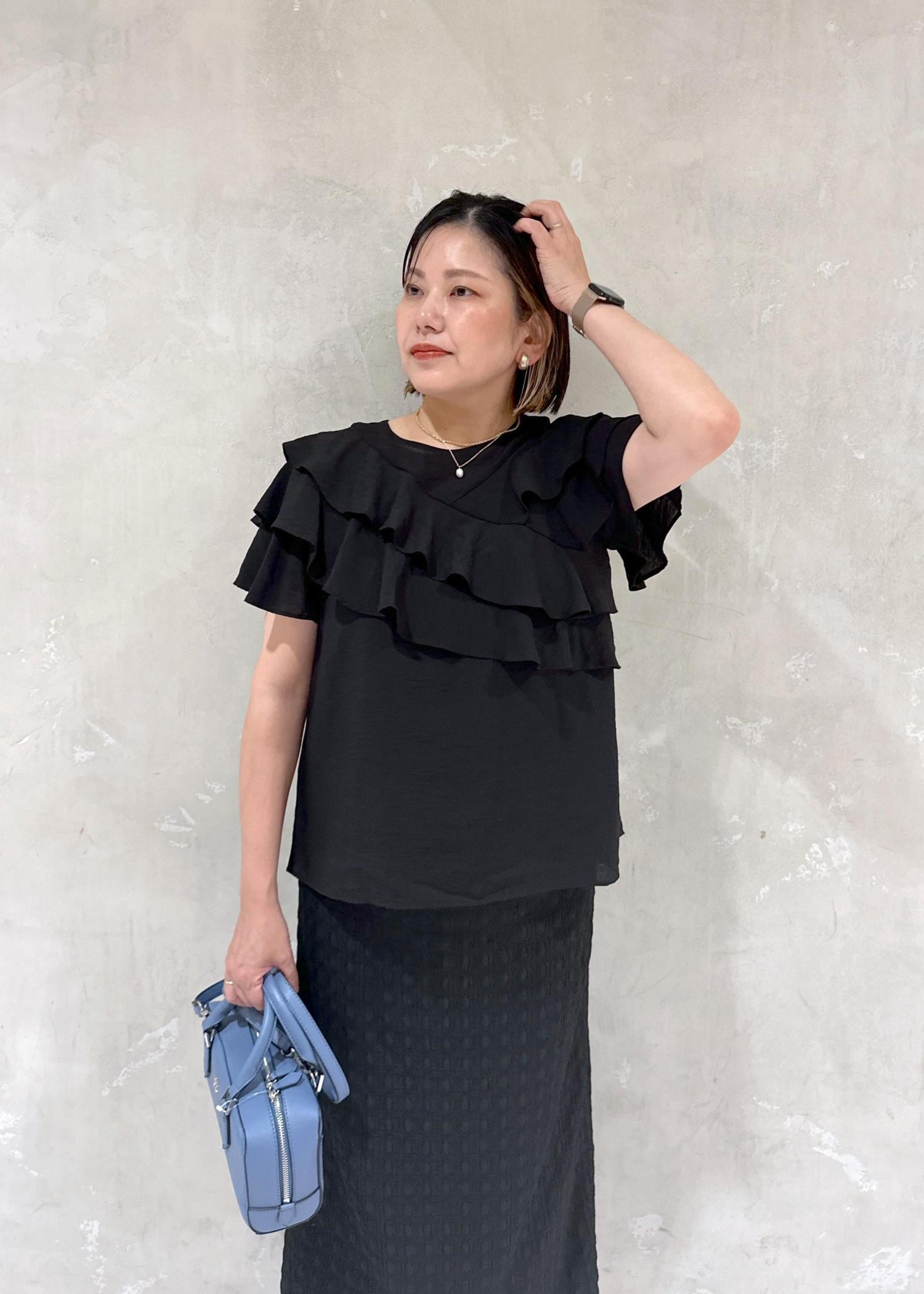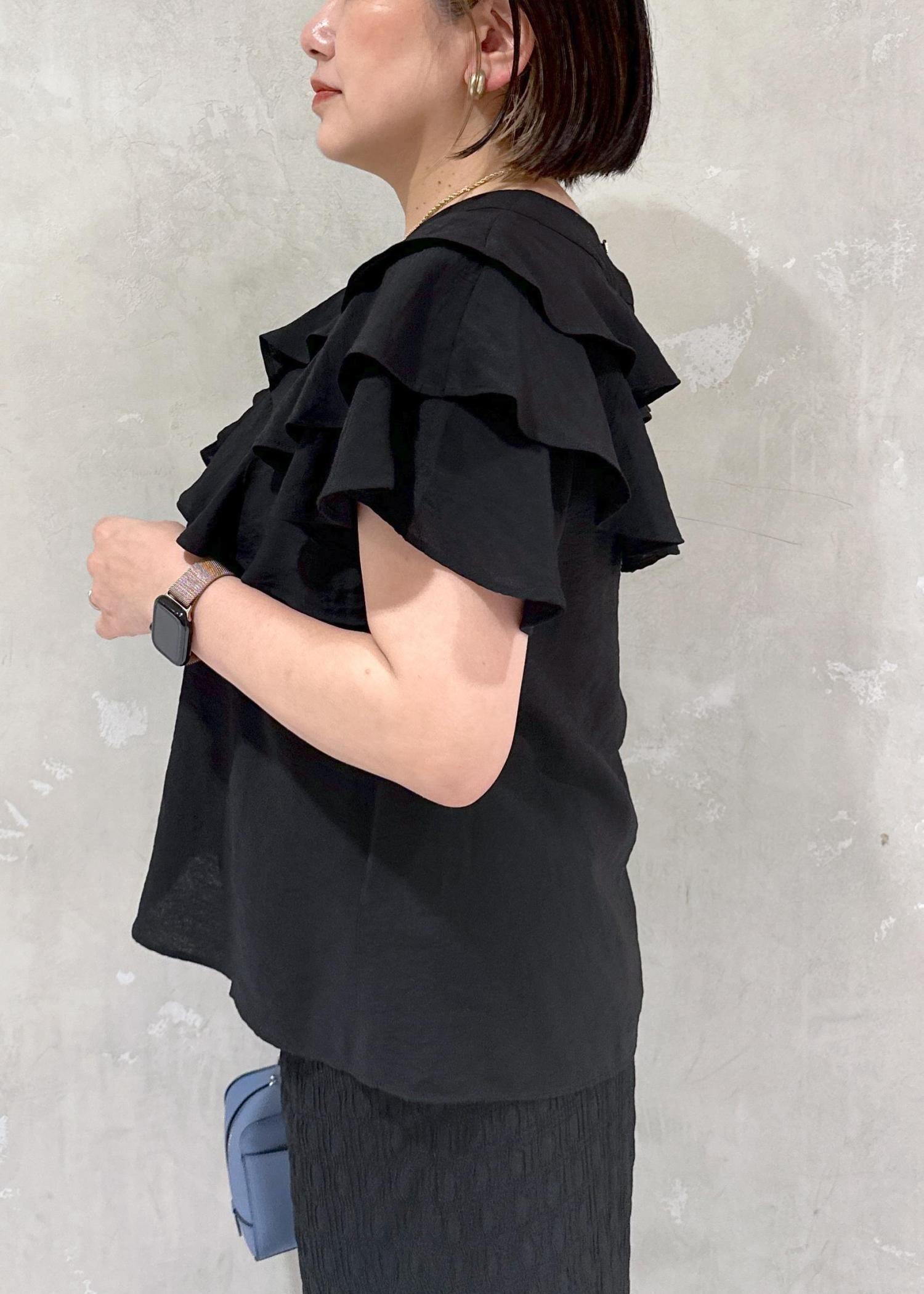 アウトレットVISフリルティアードブラウスブラック /¥4,391レビュー見た目より胸辺りも身幅もゆったりしていて涼しい。