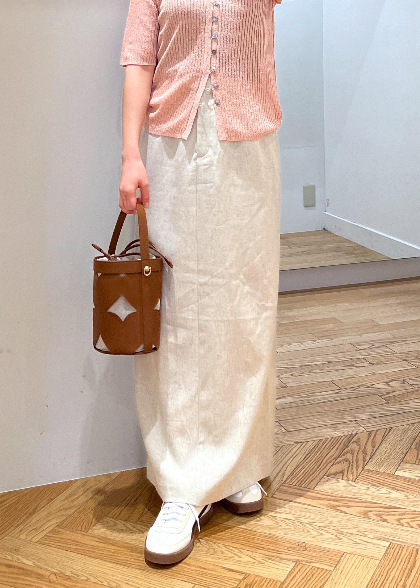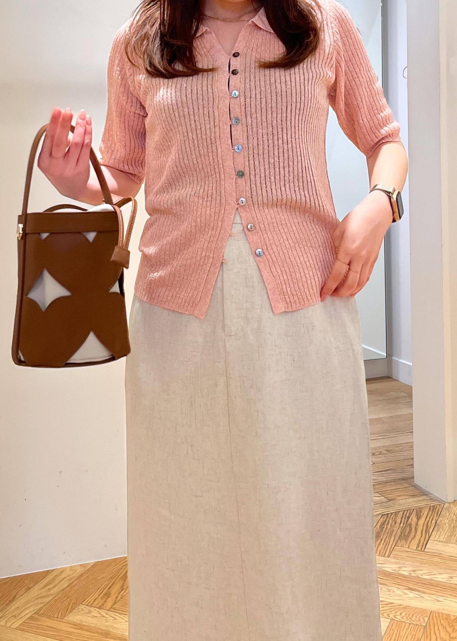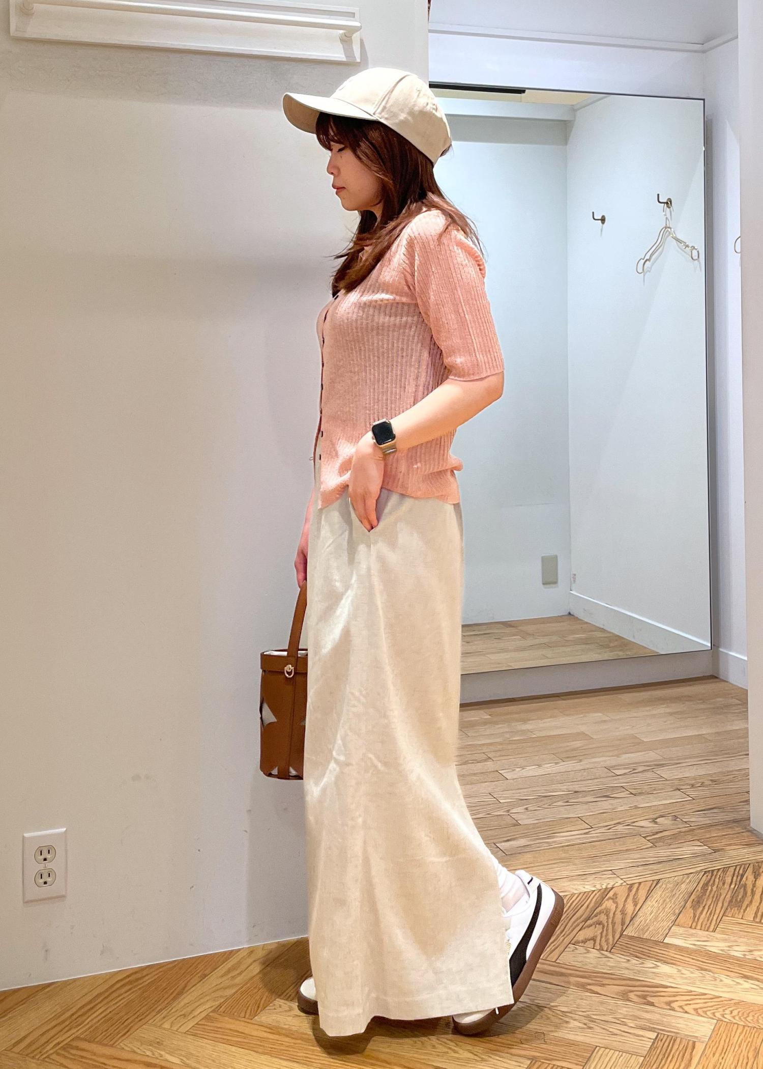 スッキリしたシルエットのカーデを合わせて女性らしさも。