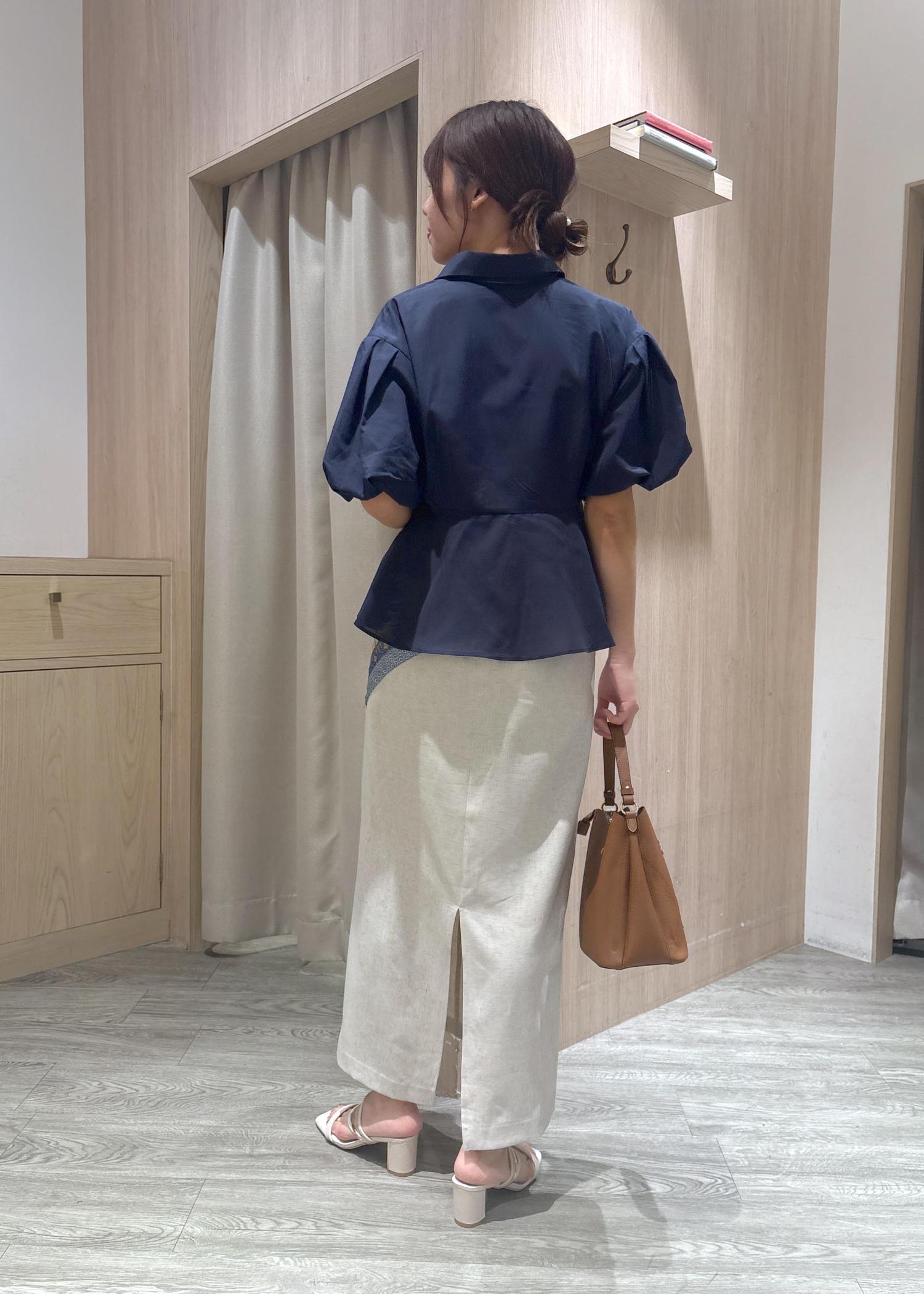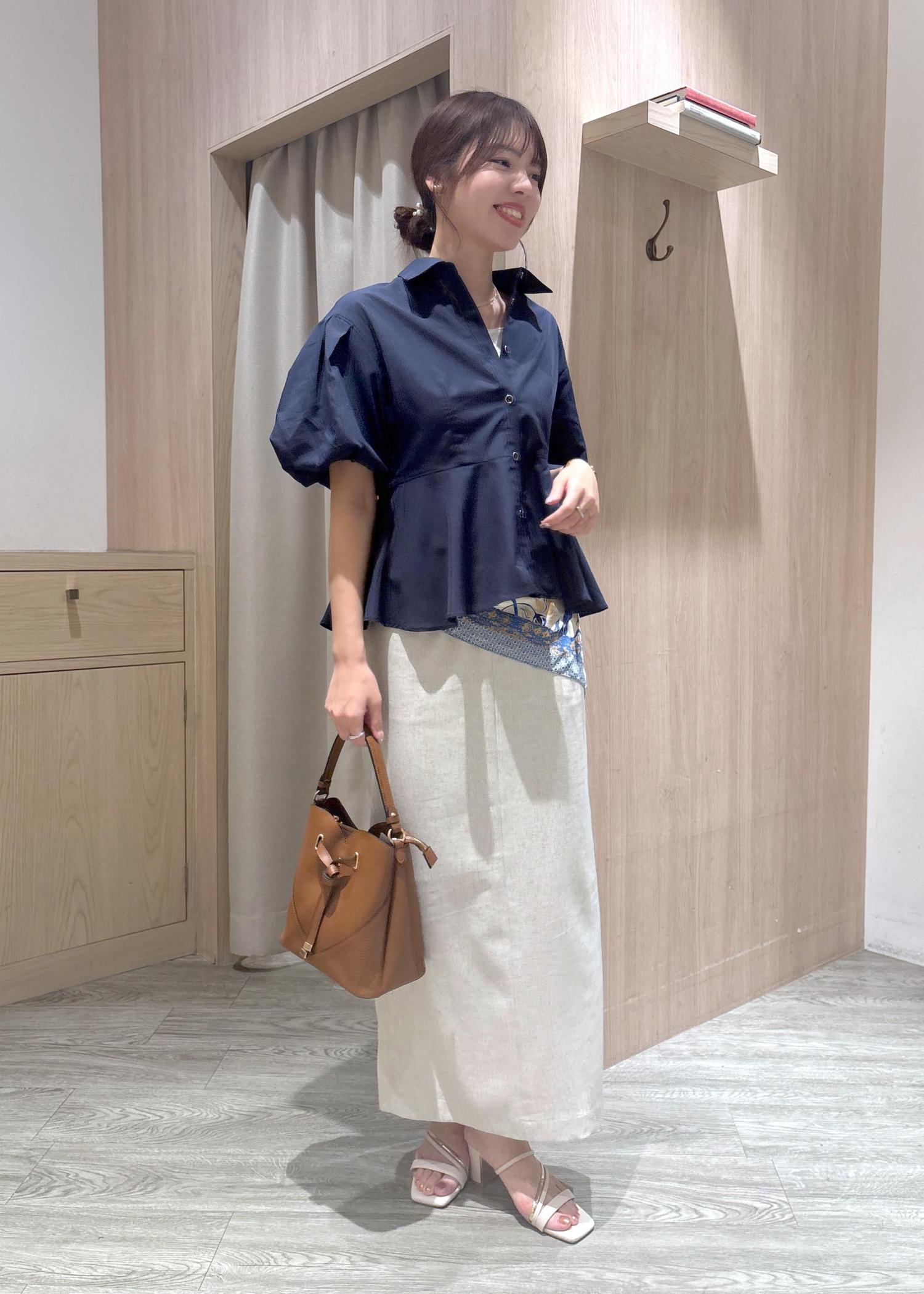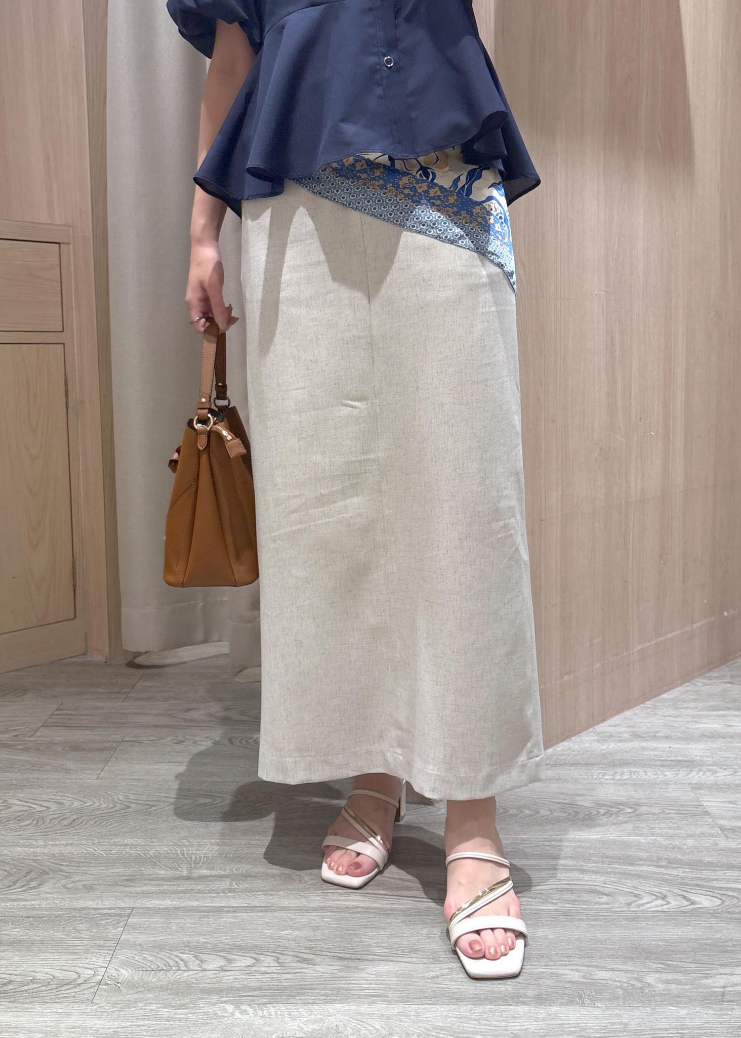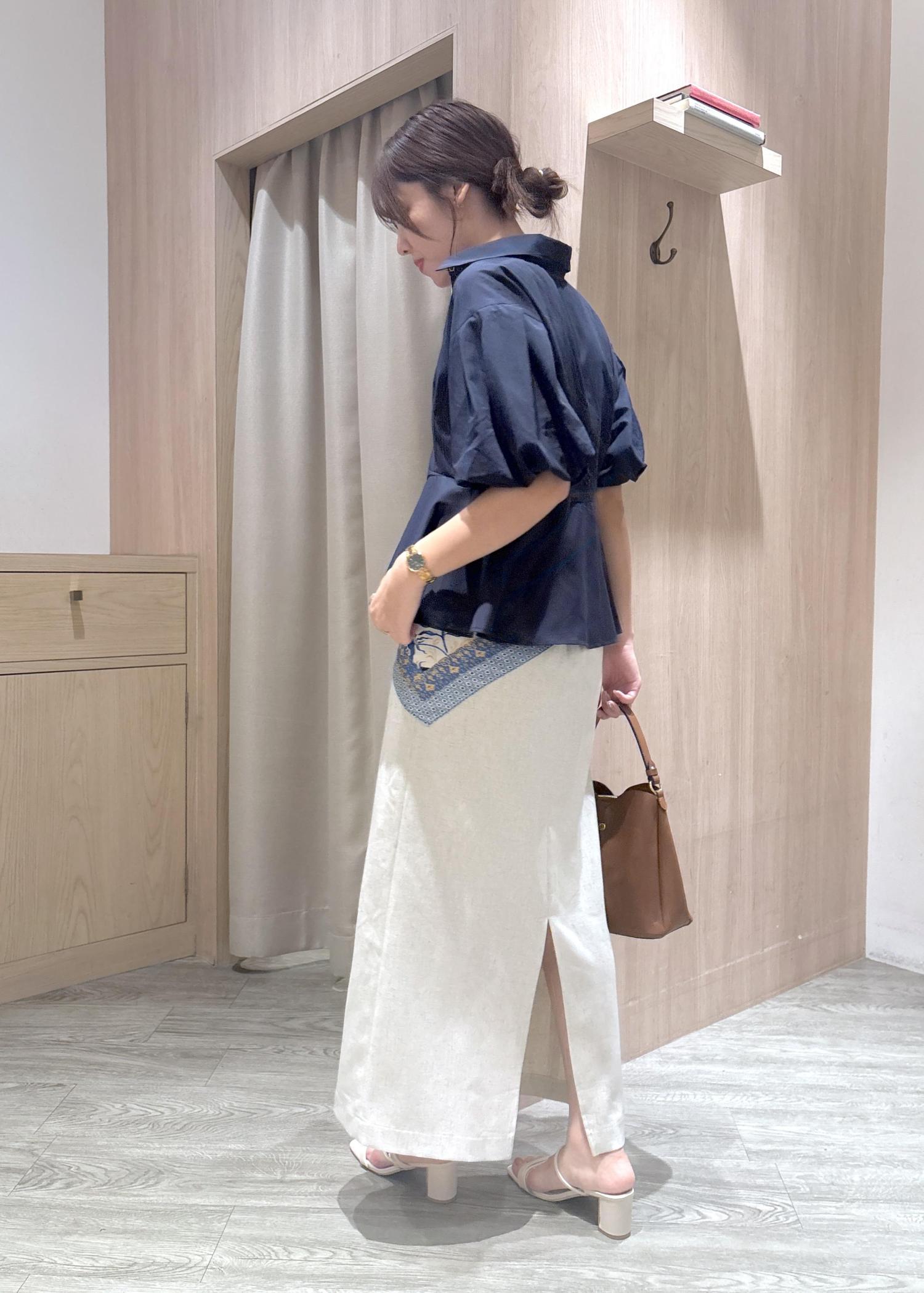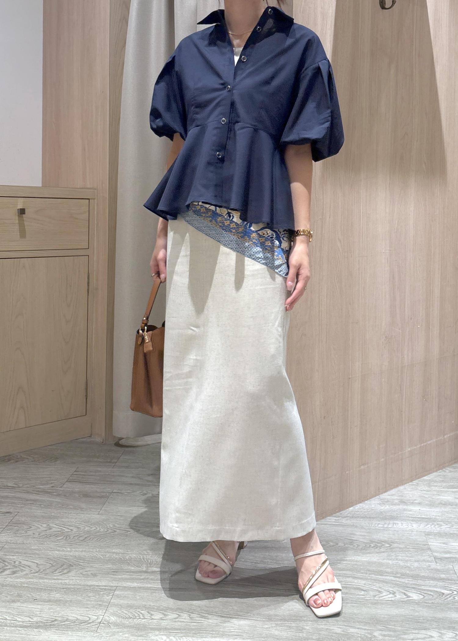 ブラウスがふんわりしてるのでスカートはシンプルなIラインを合わせることでスッキリ見えます。