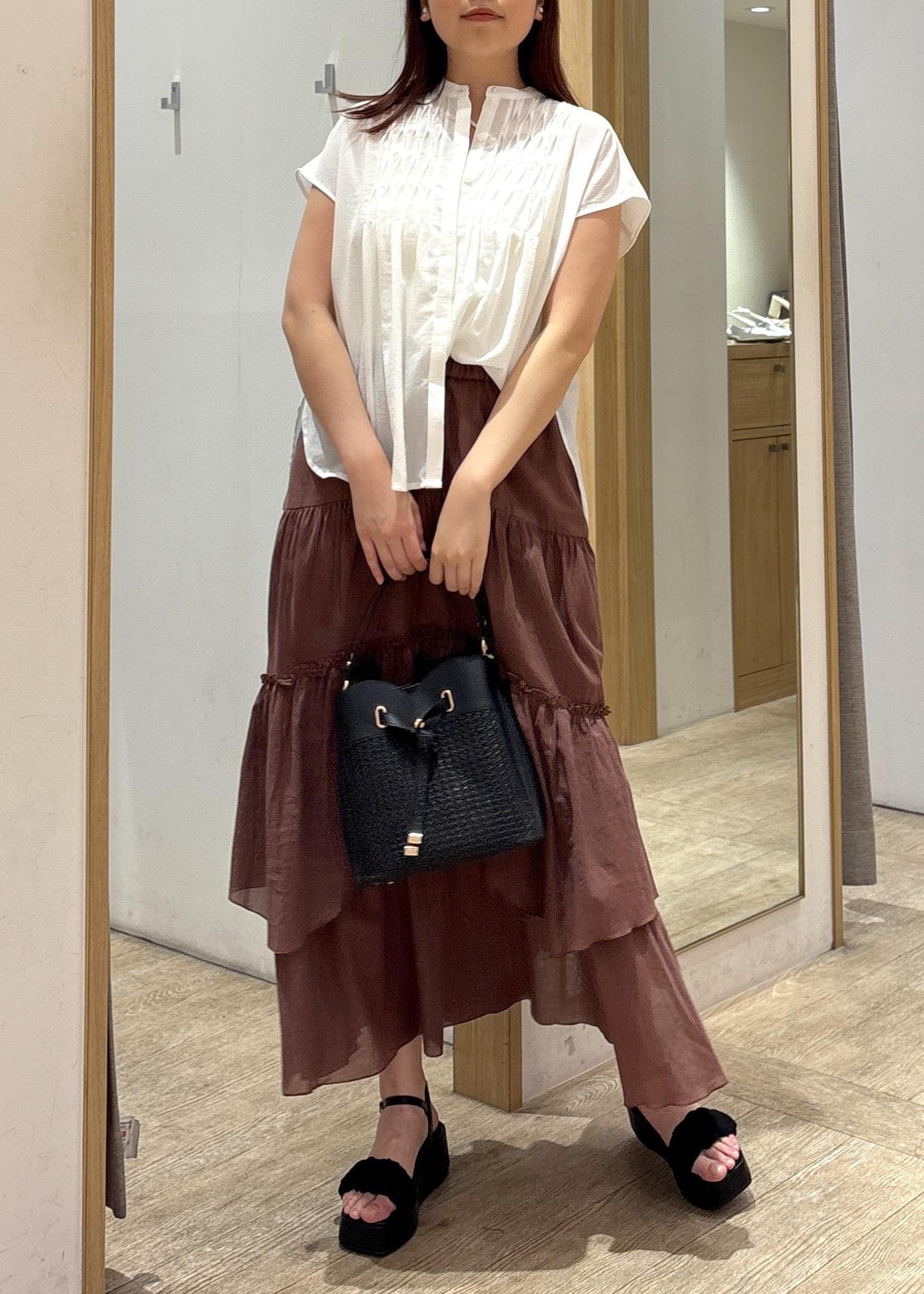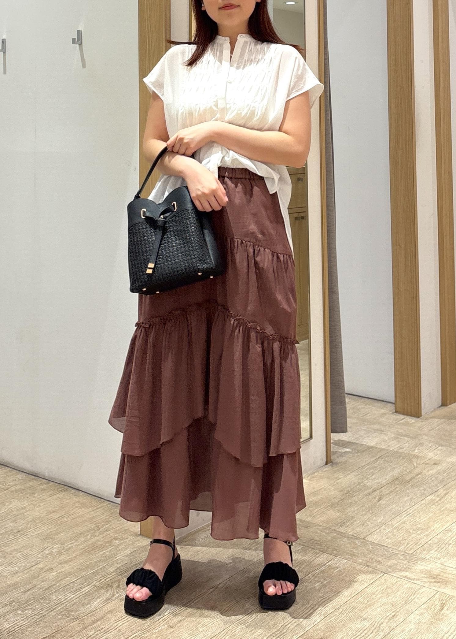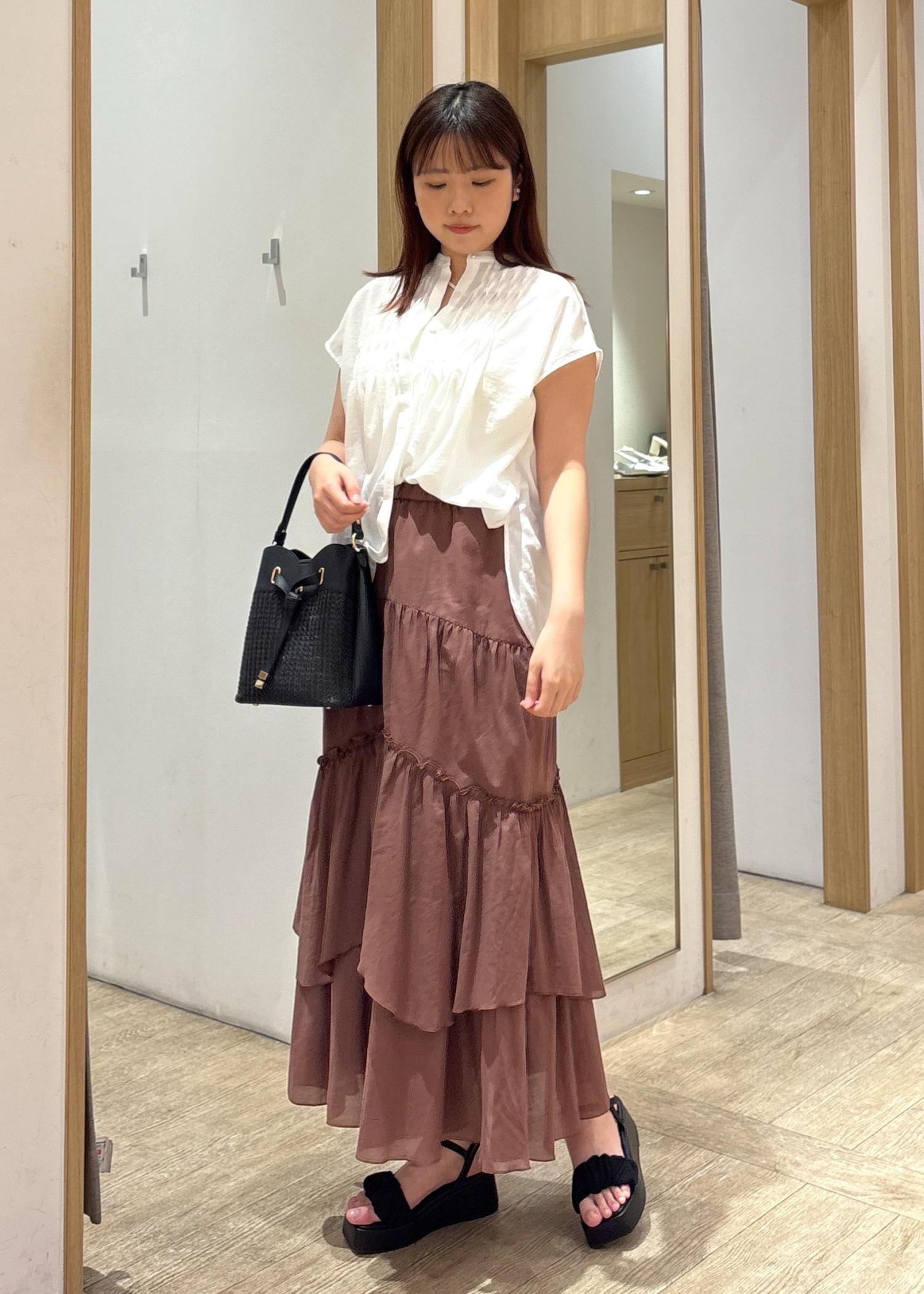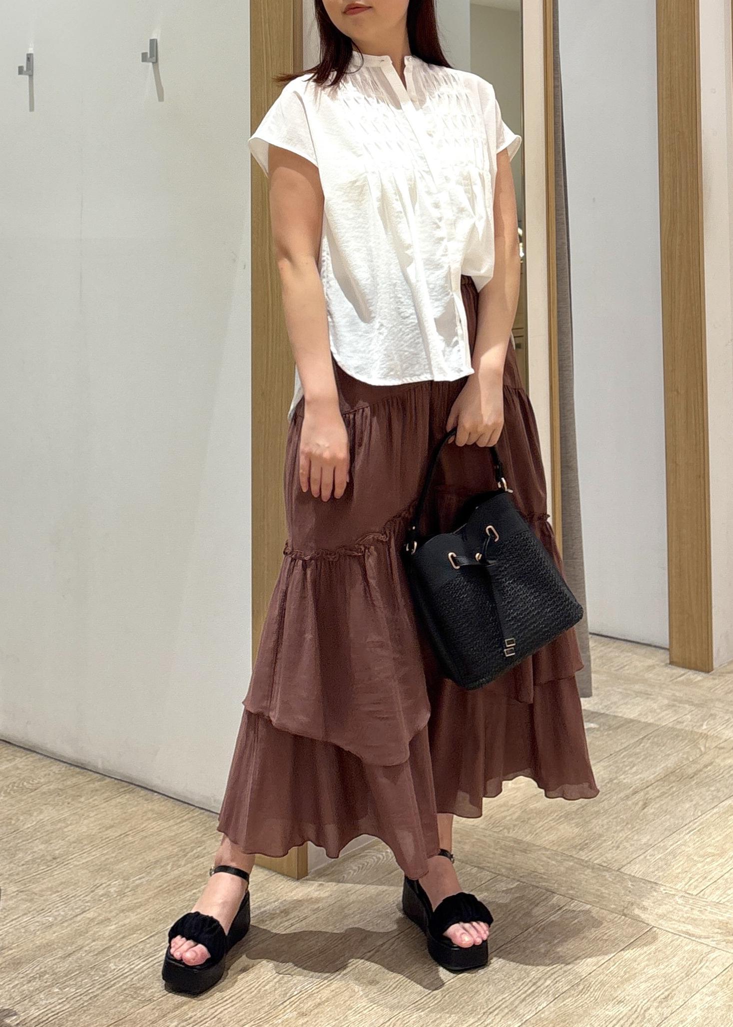 柔らかく肌触りが良くフレンチスリーブで気になる二の腕もカバー出来るブラウスに、夏らしい柔らかな薄手の生地でボリュームのあるティアードデザインのスカートを合わせたコーディネートです♪