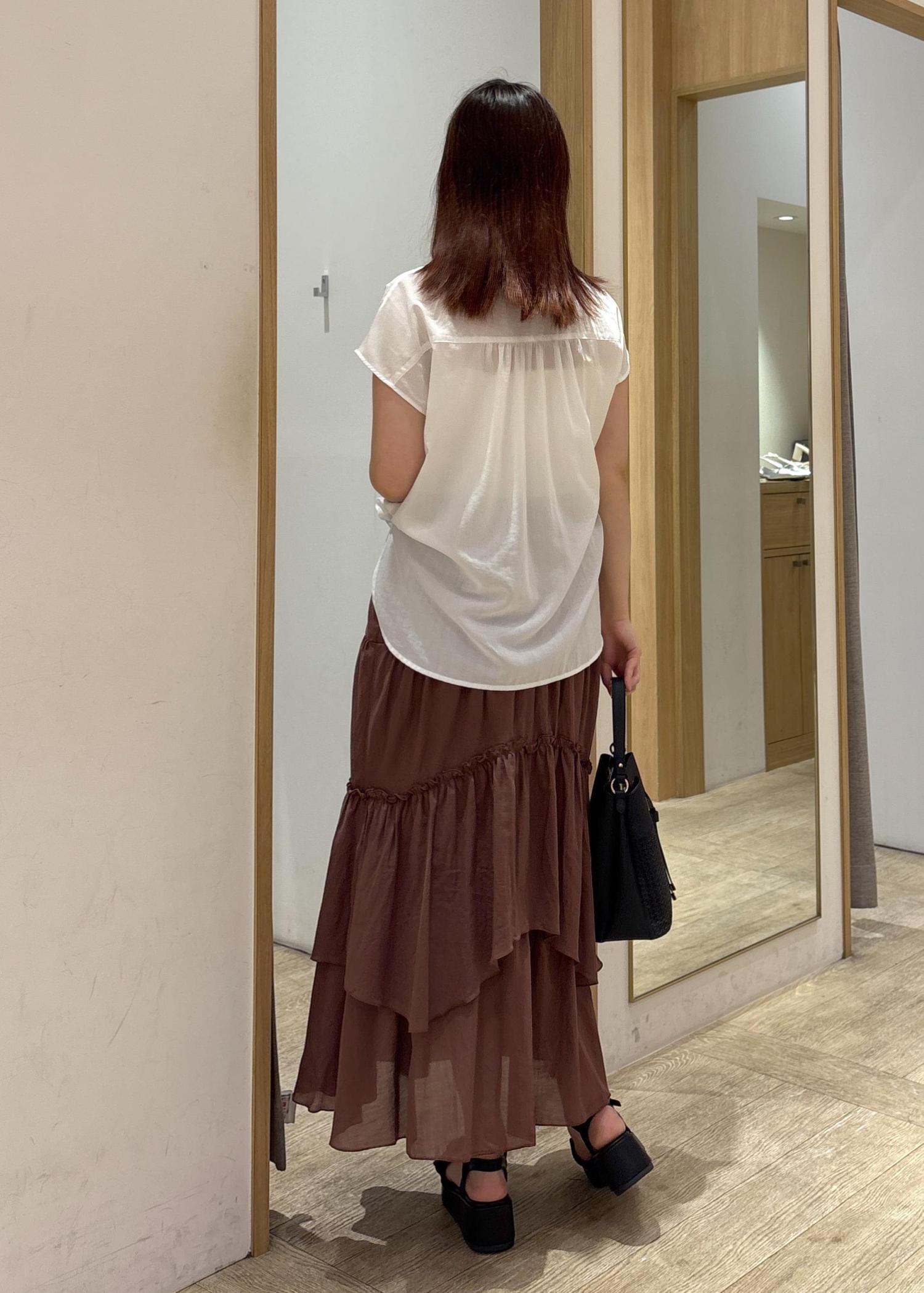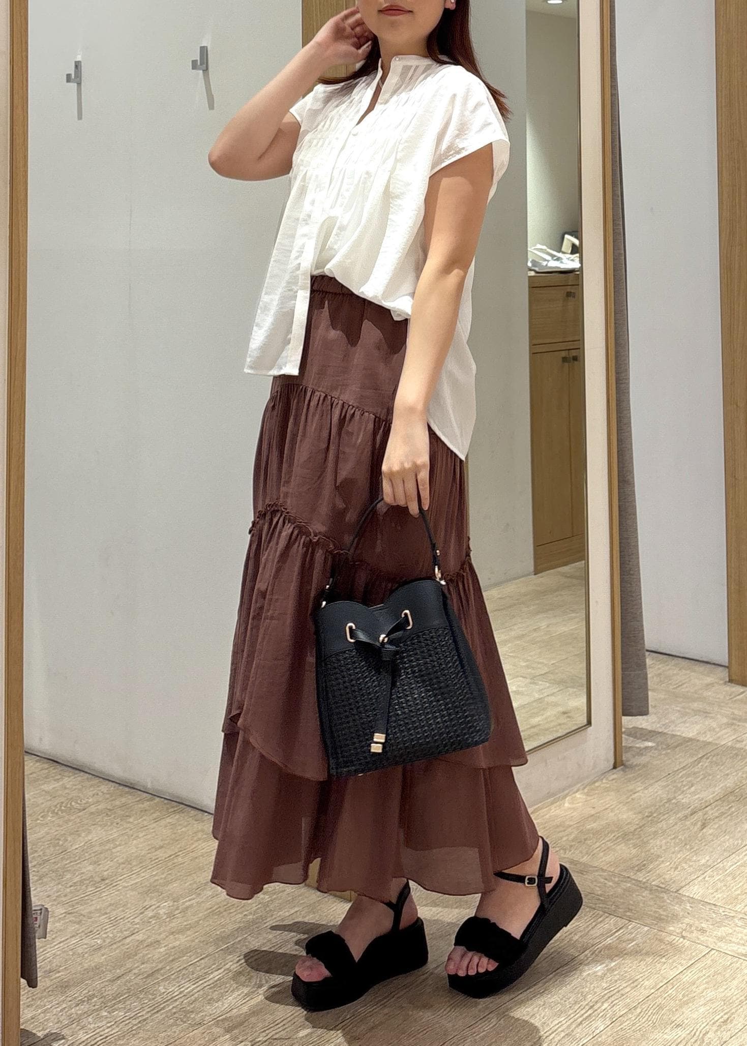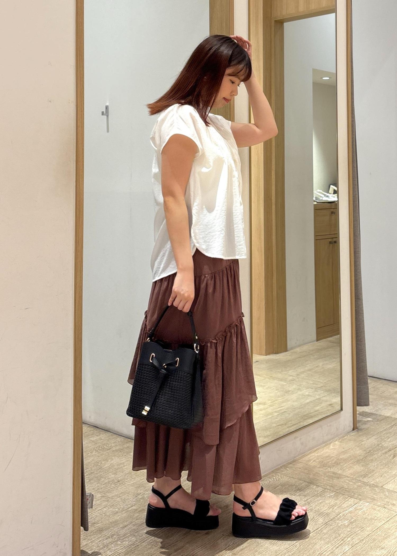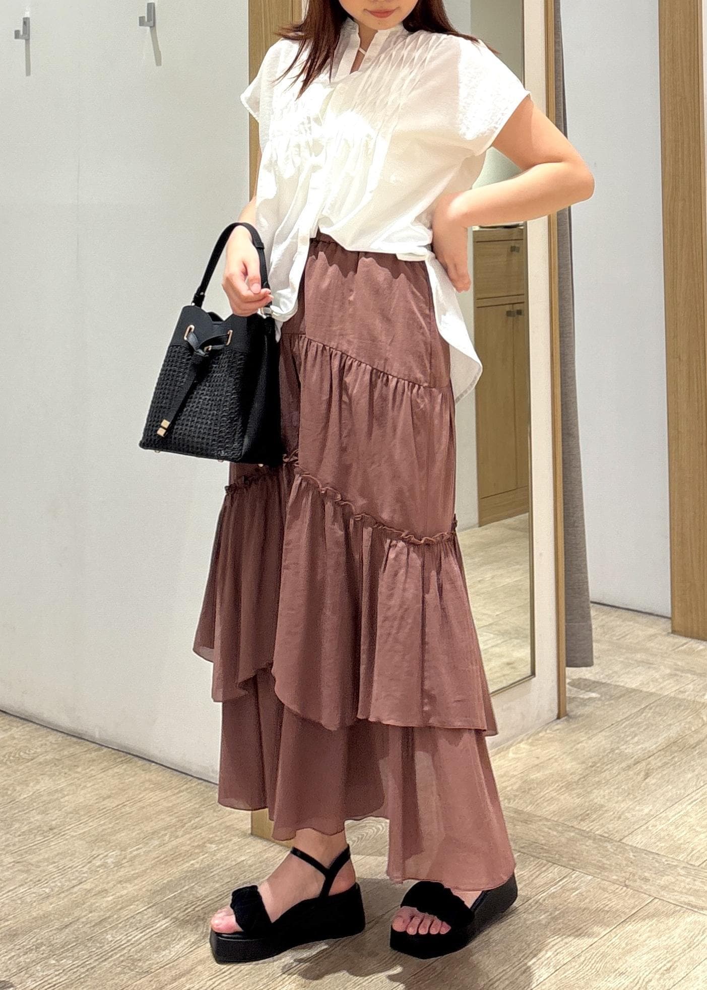 柔らかく肌触りが良くフレンチスリーブで気になる二の腕もカバー出来るブラウスに、夏らしい柔らかな薄手の生地でボリュームのあるティアードデザインのスカートを合わせたコーディネートです♪