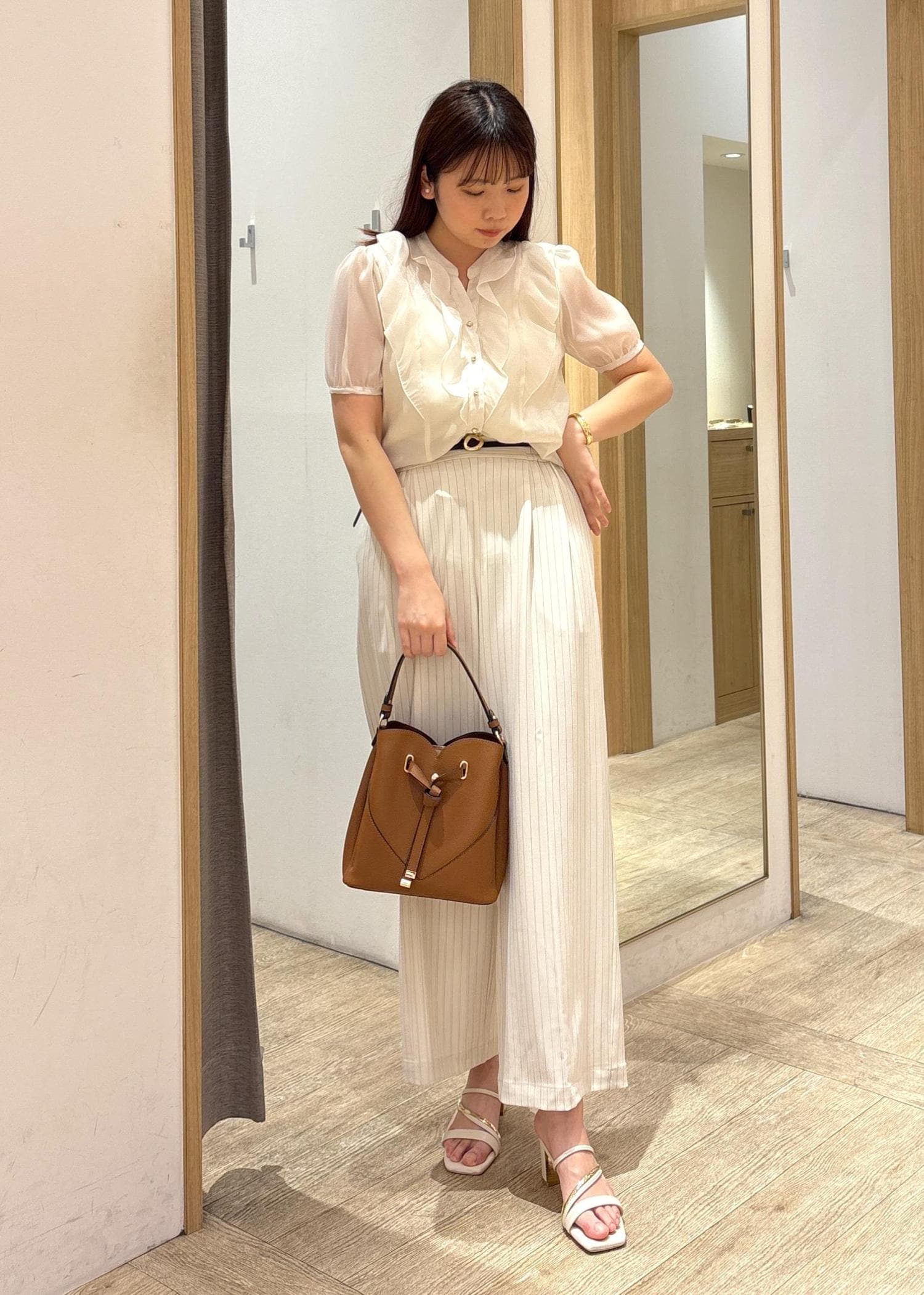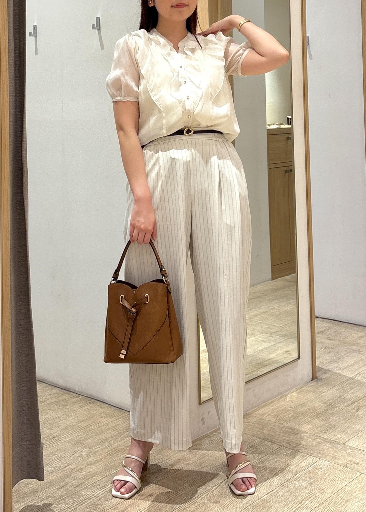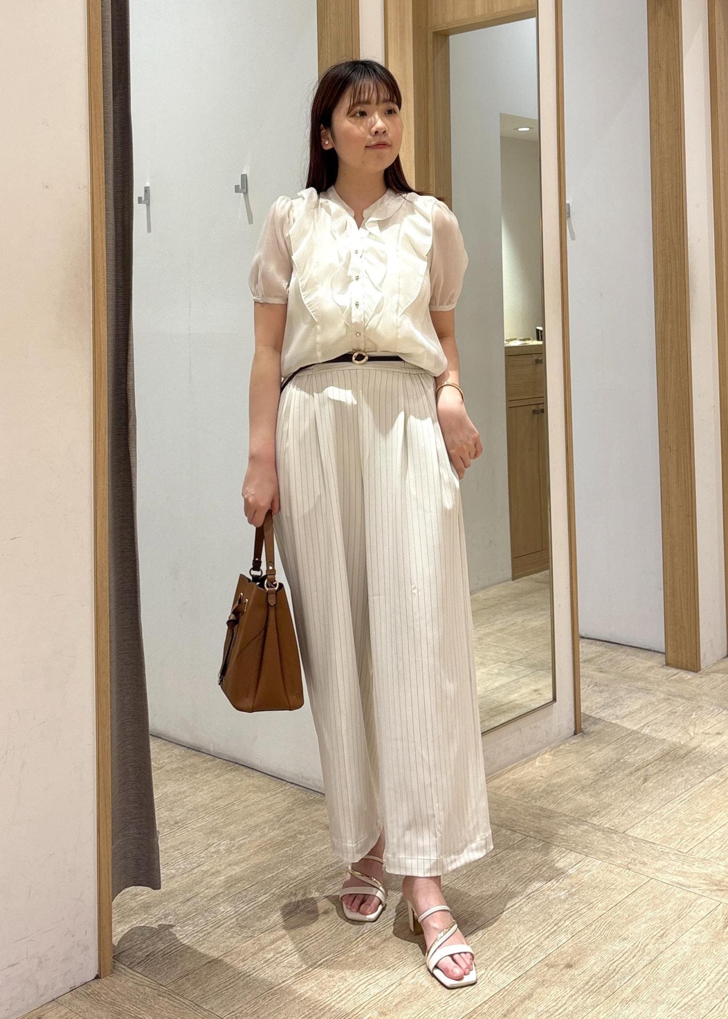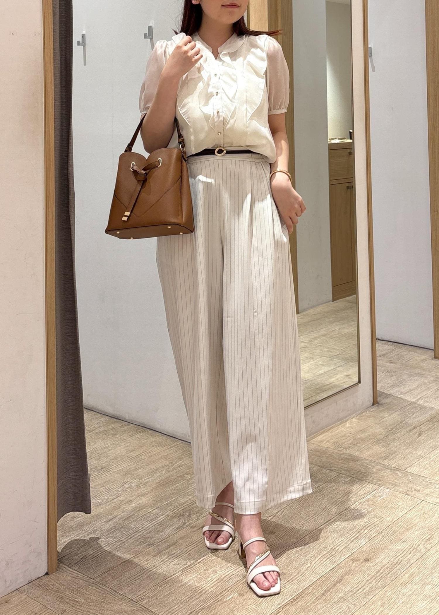 シャイニー素材の柔らかなフリルのブラウスでON/OFF兼用で着用したくなる主役ブラウスに、ゴム仕様のウエストでサラッと楽ちんに履けてなおかつオシャレにきまるストライプワイドパンツを合わせたコーディネートです♪