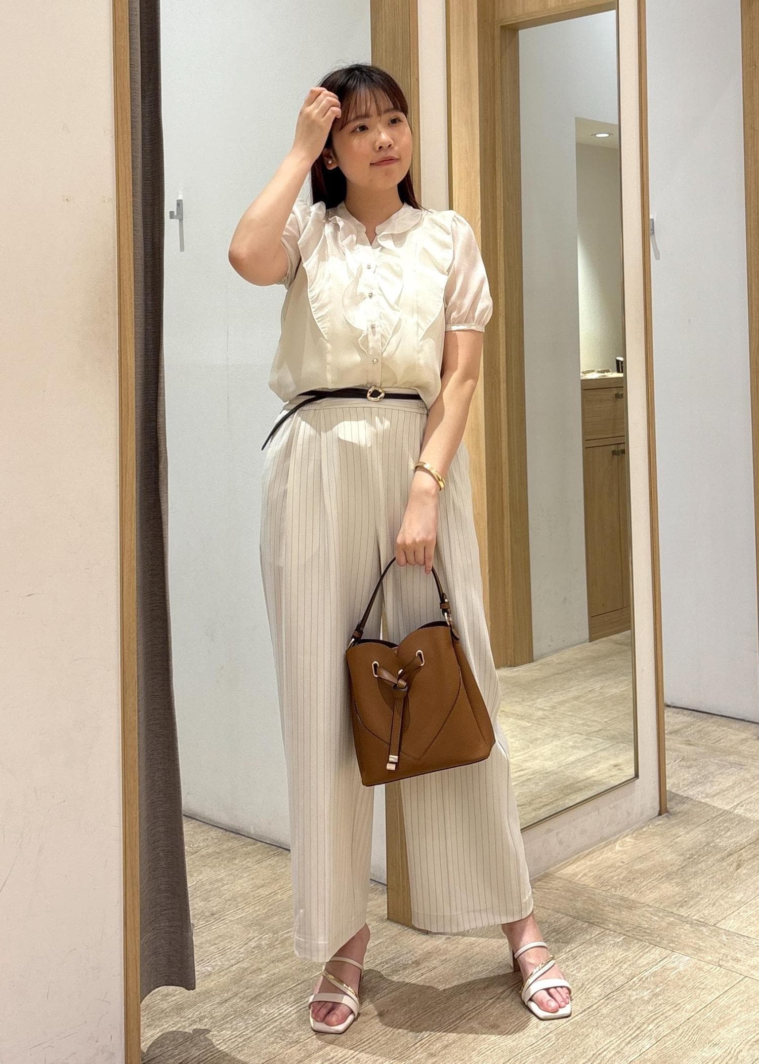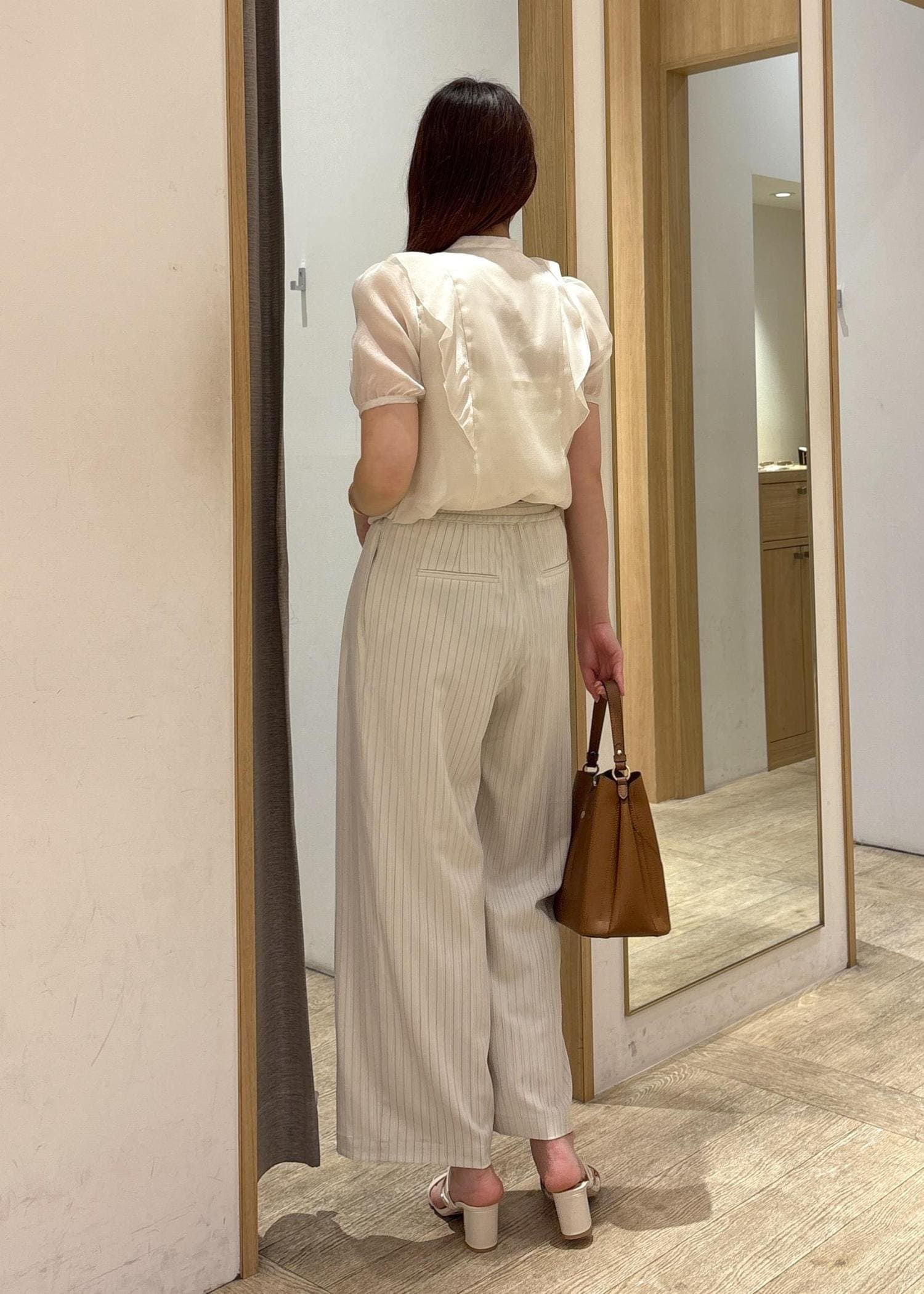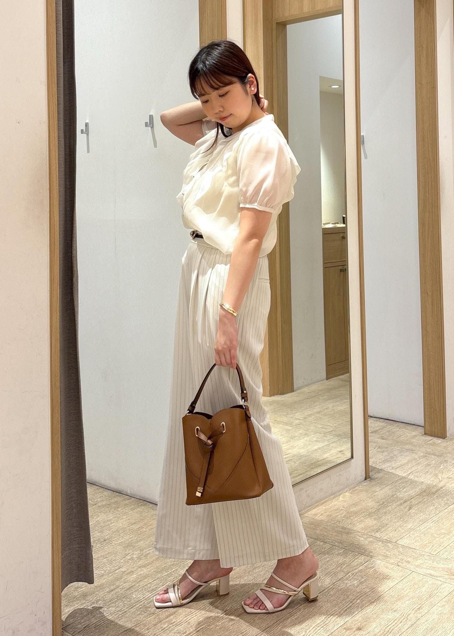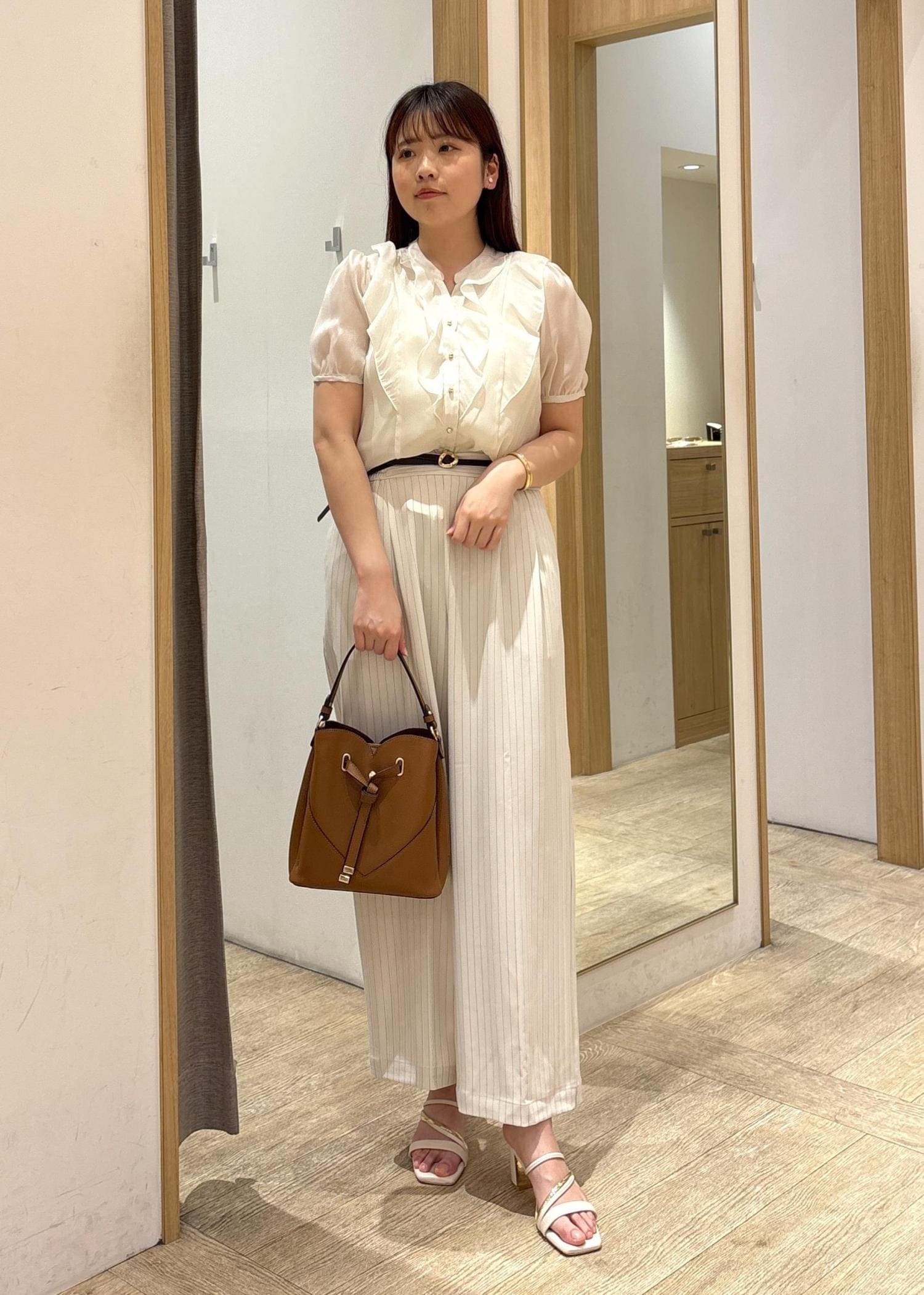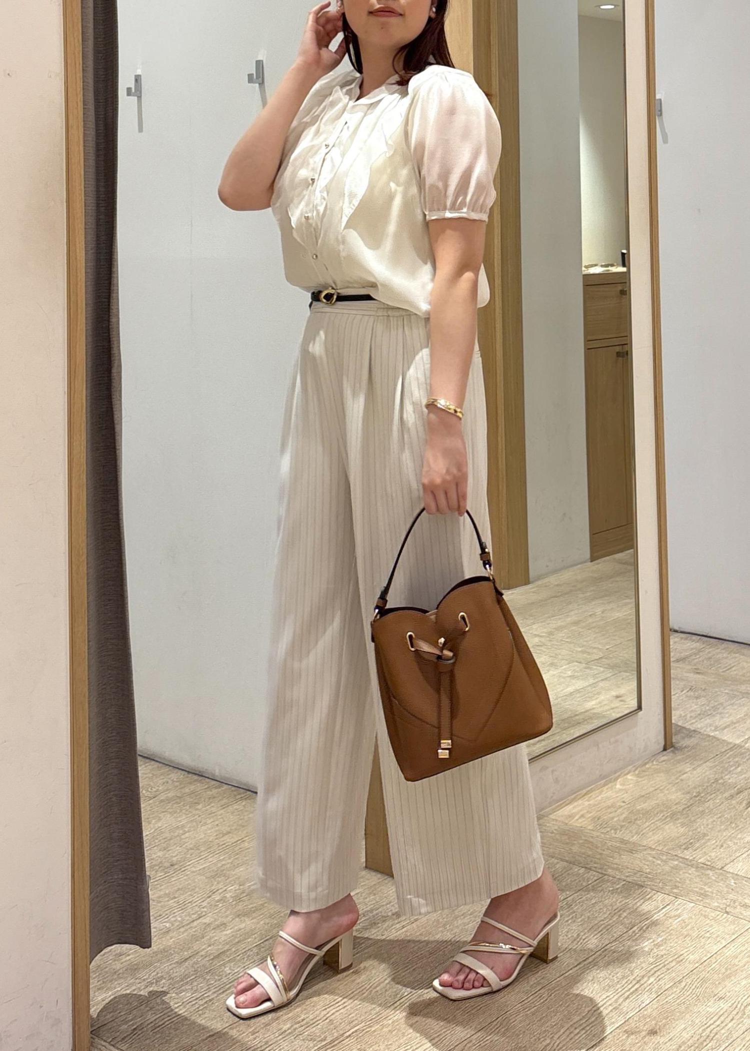 シャイニー素材の柔らかなフリルのブラウスでON/OFF兼用で着用したくなる主役ブラウスに、ゴム仕様のウエストでサラッと楽ちんに履けてなおかつオシャレにきまるストライプワイドパンツを合わせたコーディネートです♪