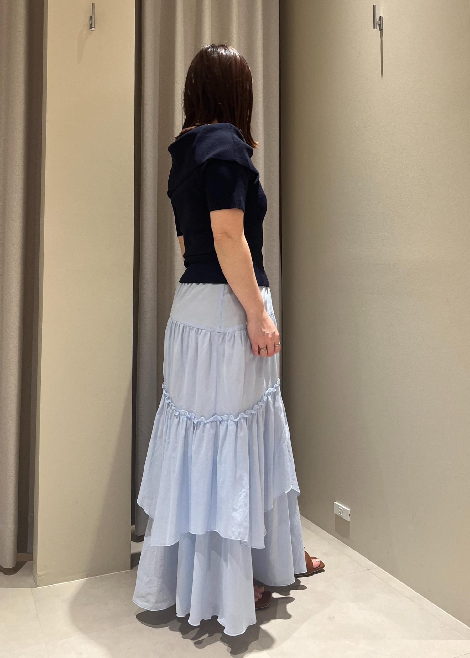 アウトレットVISボイルティアードスカートブルー系 / F¥3,955レビューウエストゴムの伸びがよく、着脱しやすいです。平ゴムなので着脱時ねじれやすいかなと感じました。