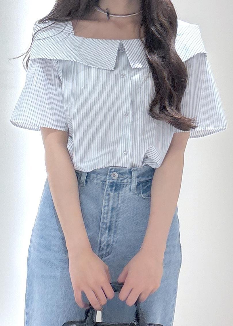 VIS【新色追加】【防シワ】ラメミックスオフショルダー風ストライプシャツホワイト系 / F¥5,489レビュー身長155cmで腰がすこし隠れるくらいの丈感です。