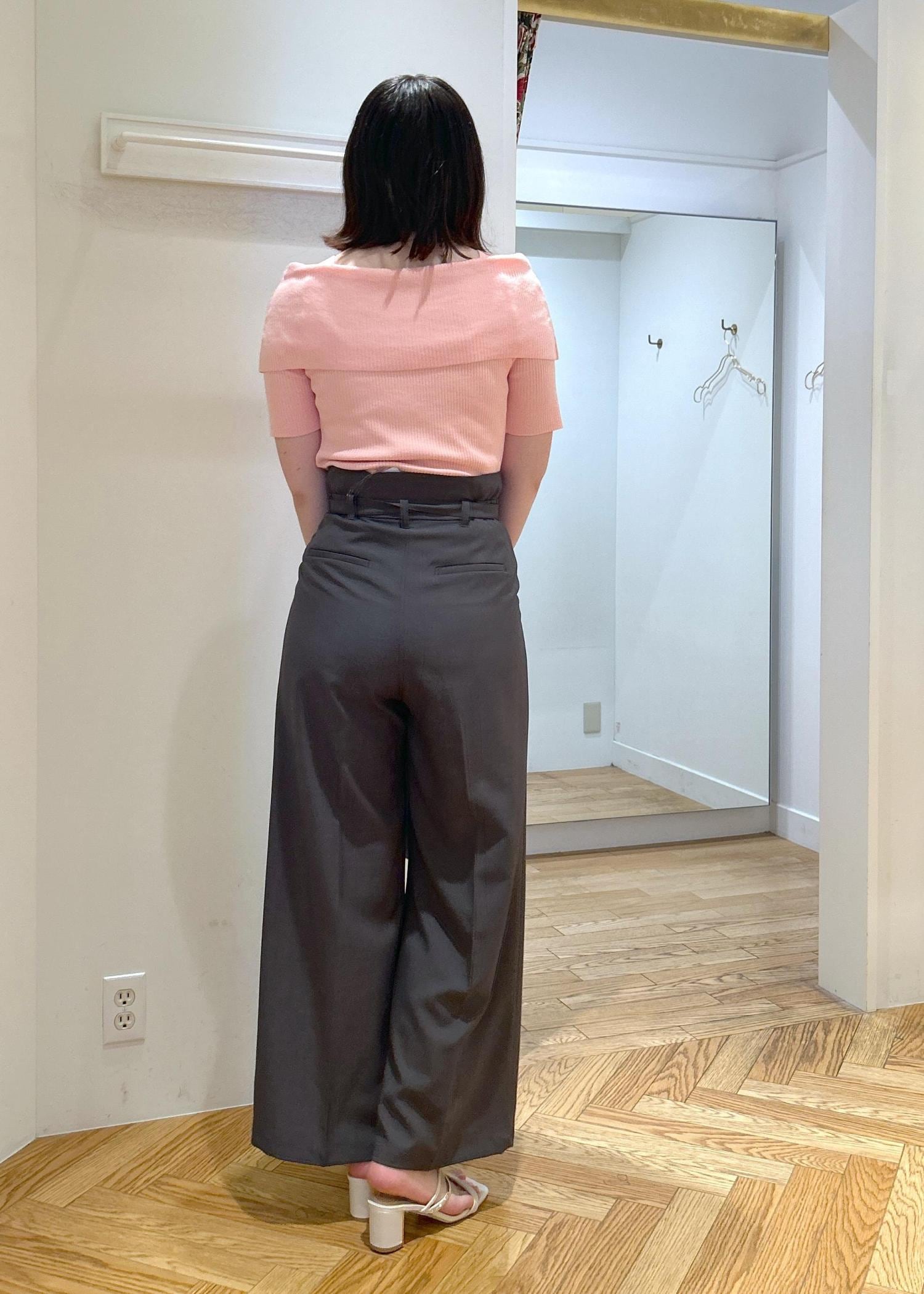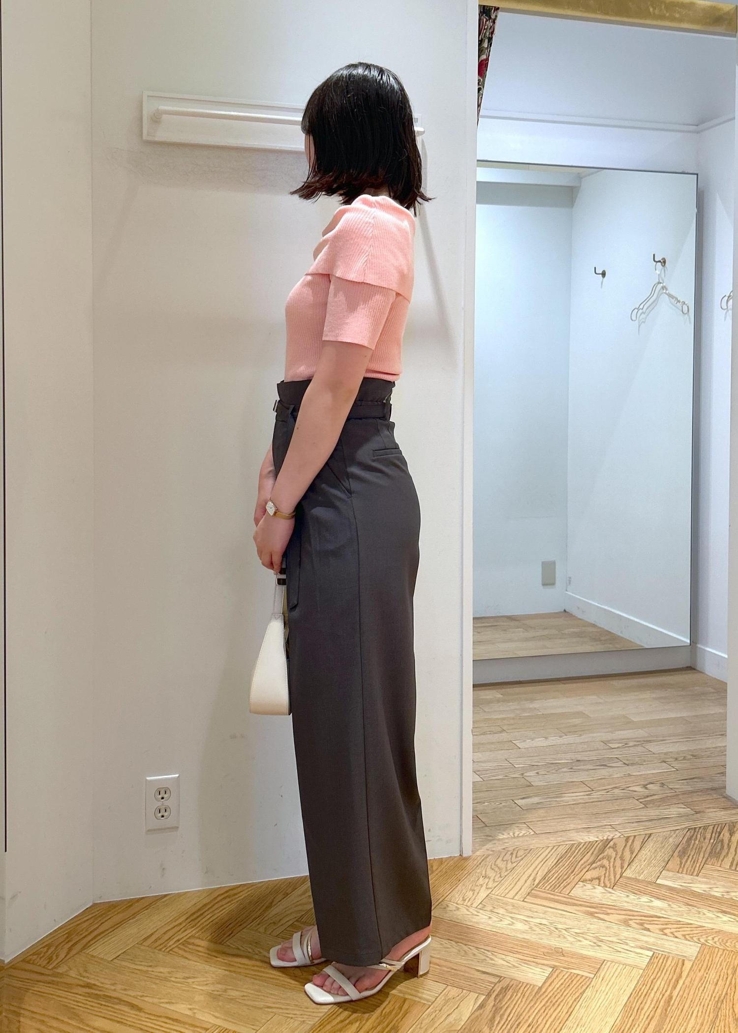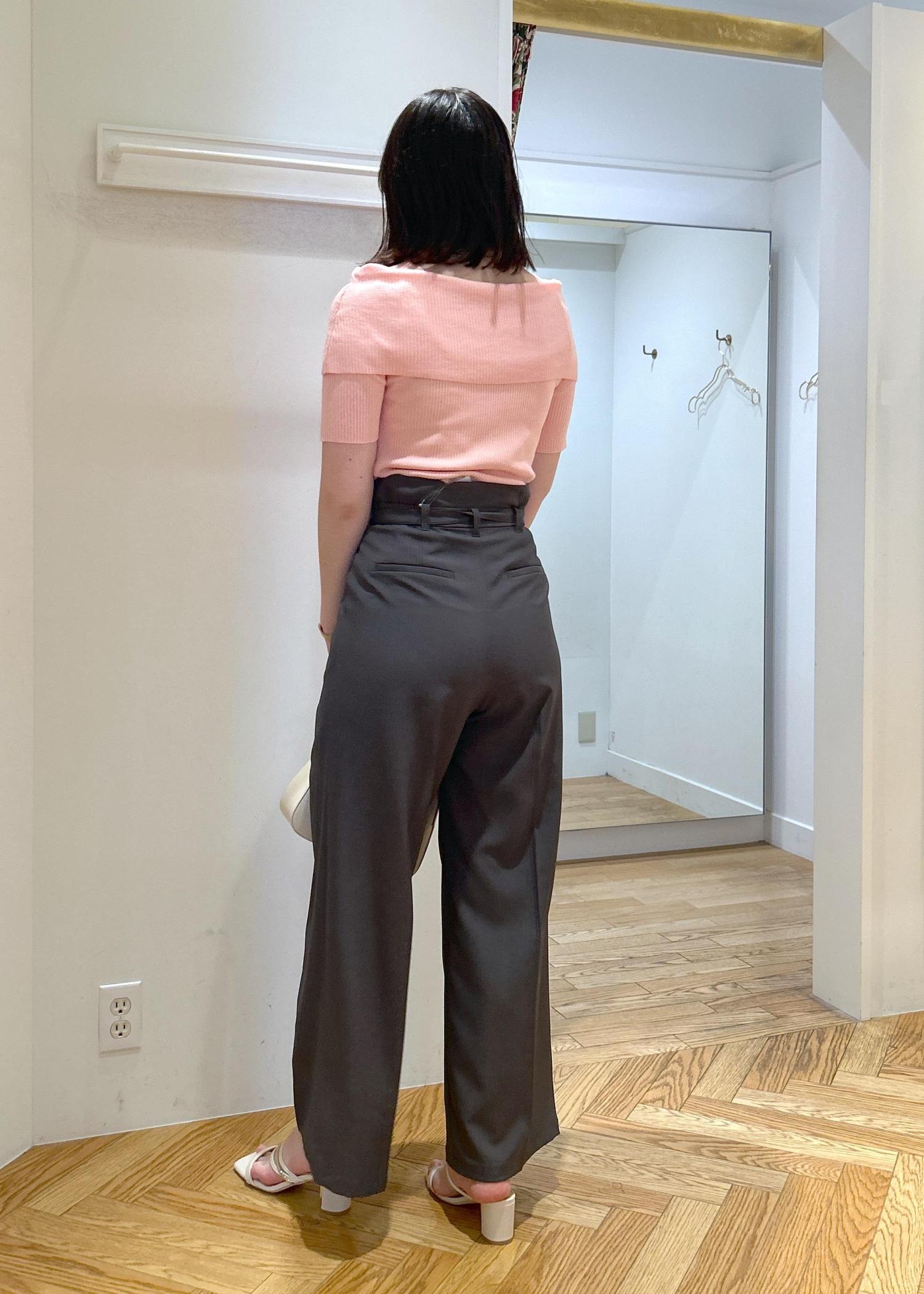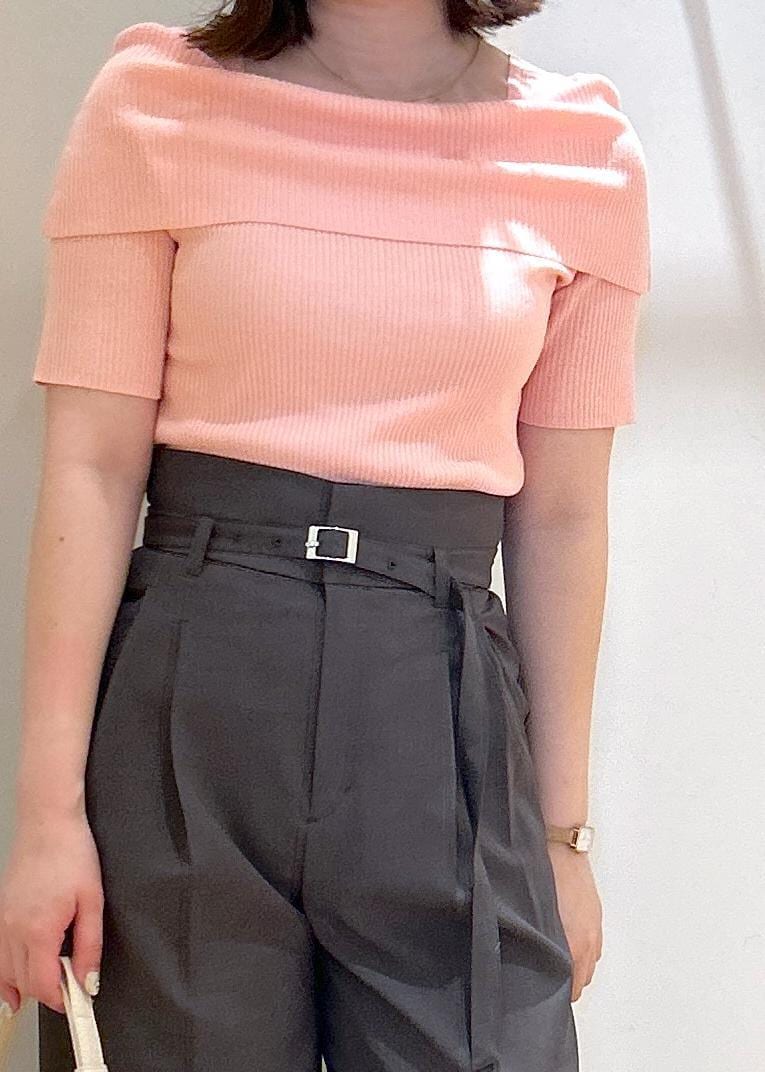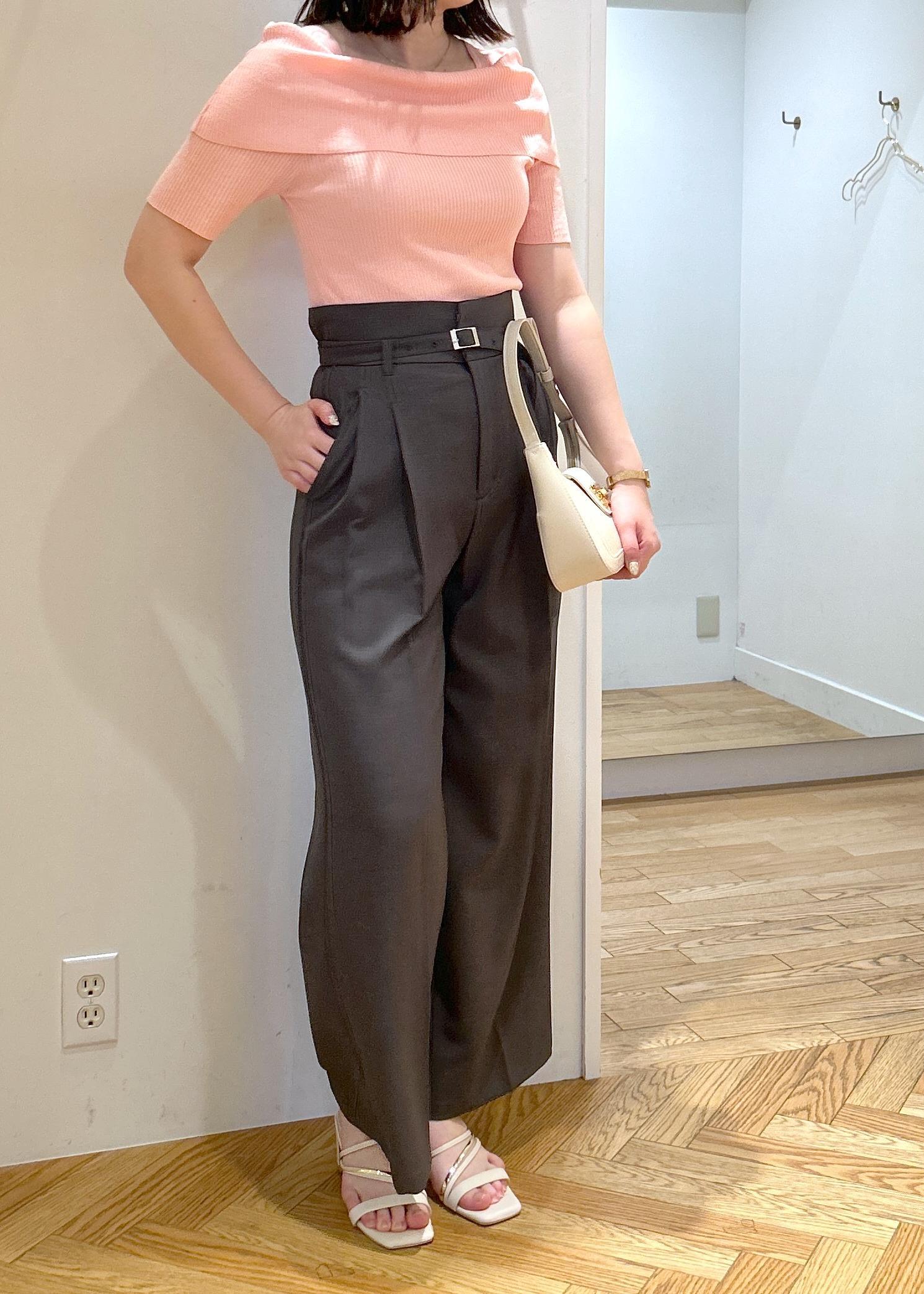オフショル風半袖ニットにハイウエストパンツを合わせた、綺麗めコーデです!