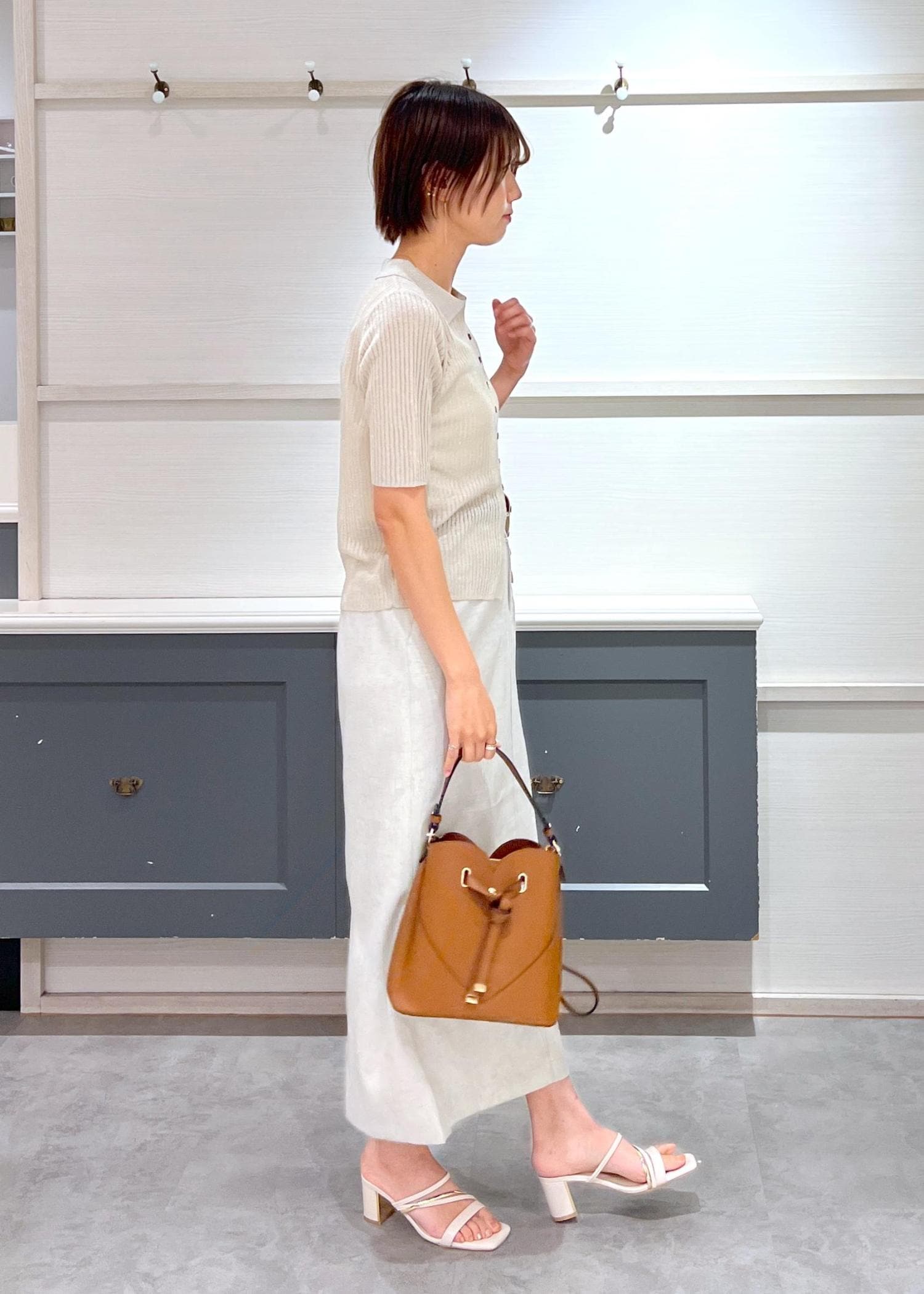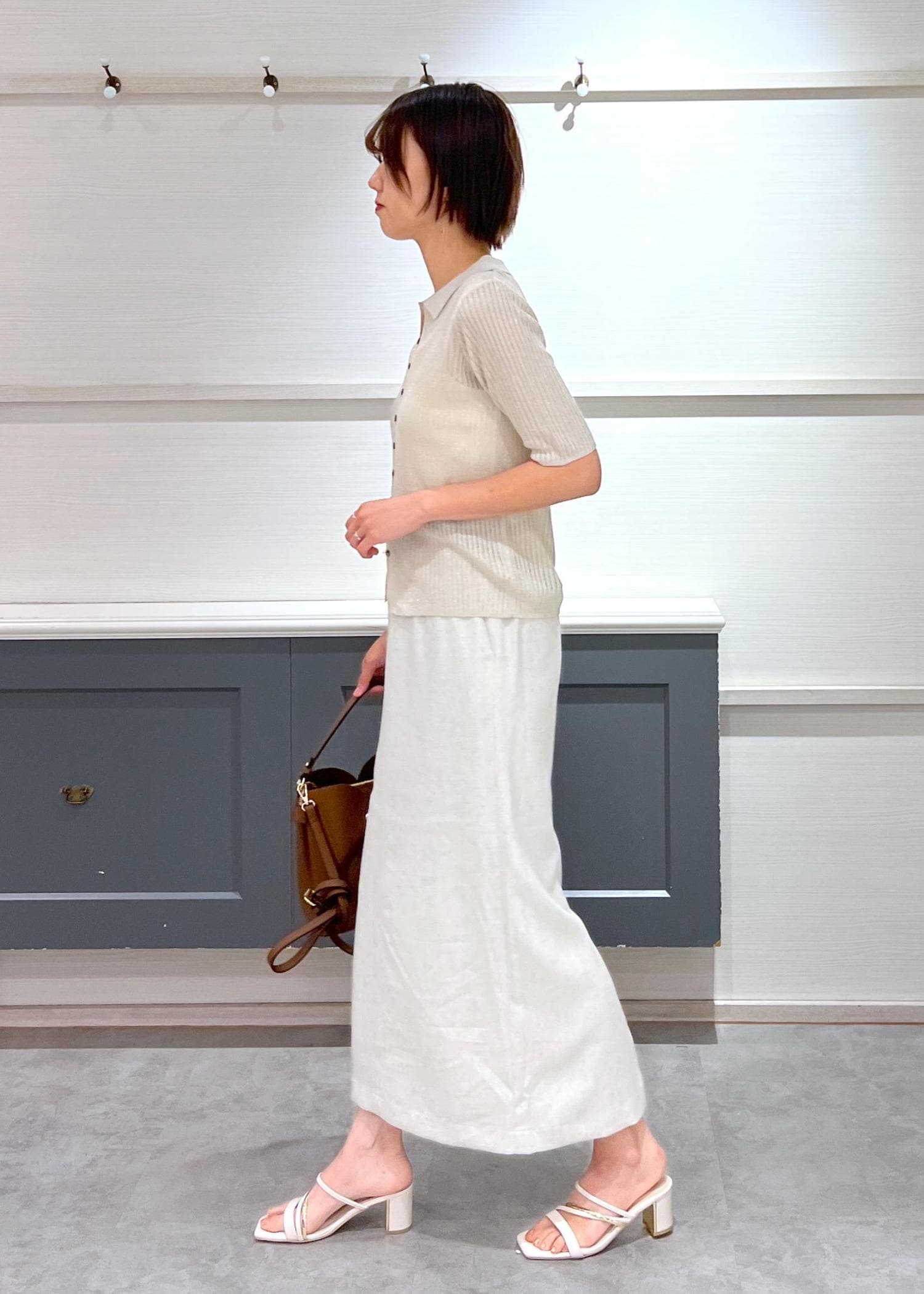 Iラインが綺麗なタイトスカートと合わせて、カラーもシルエットもすっきり見えするコーディネートに◎