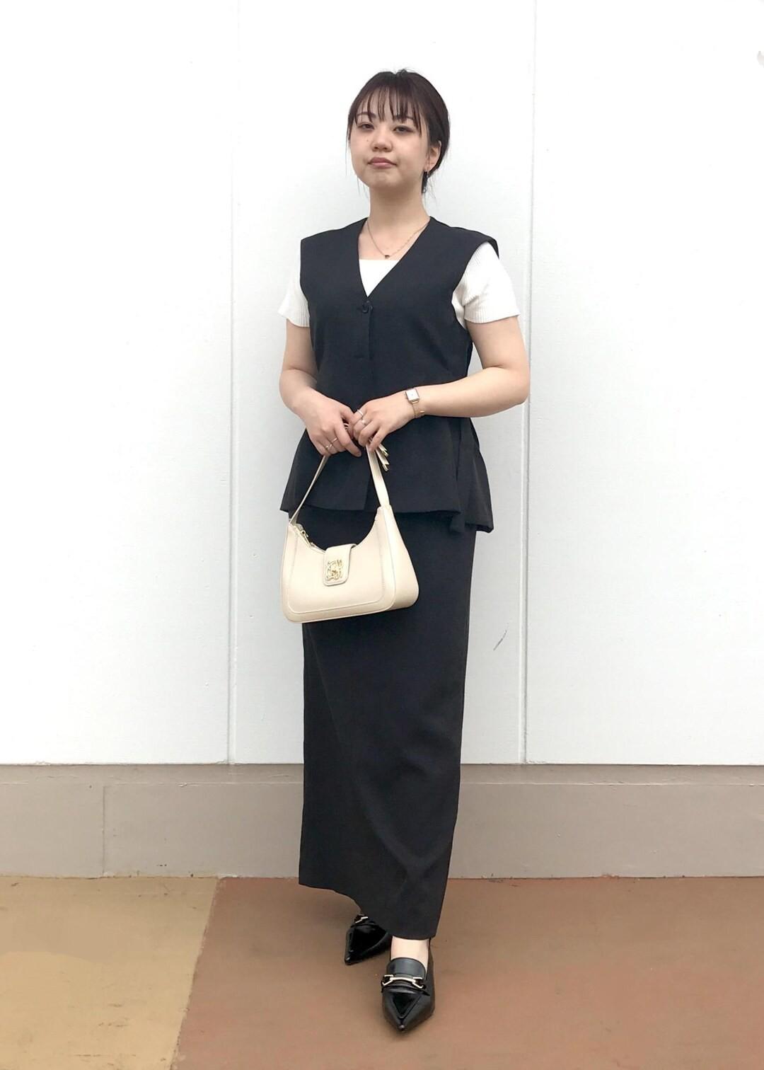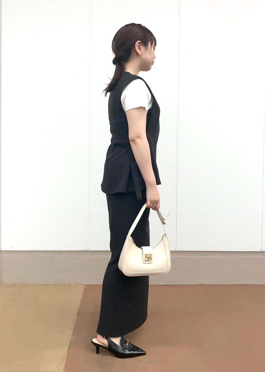 ニットトップスを合わせて、気になる二の腕をカバーしています。