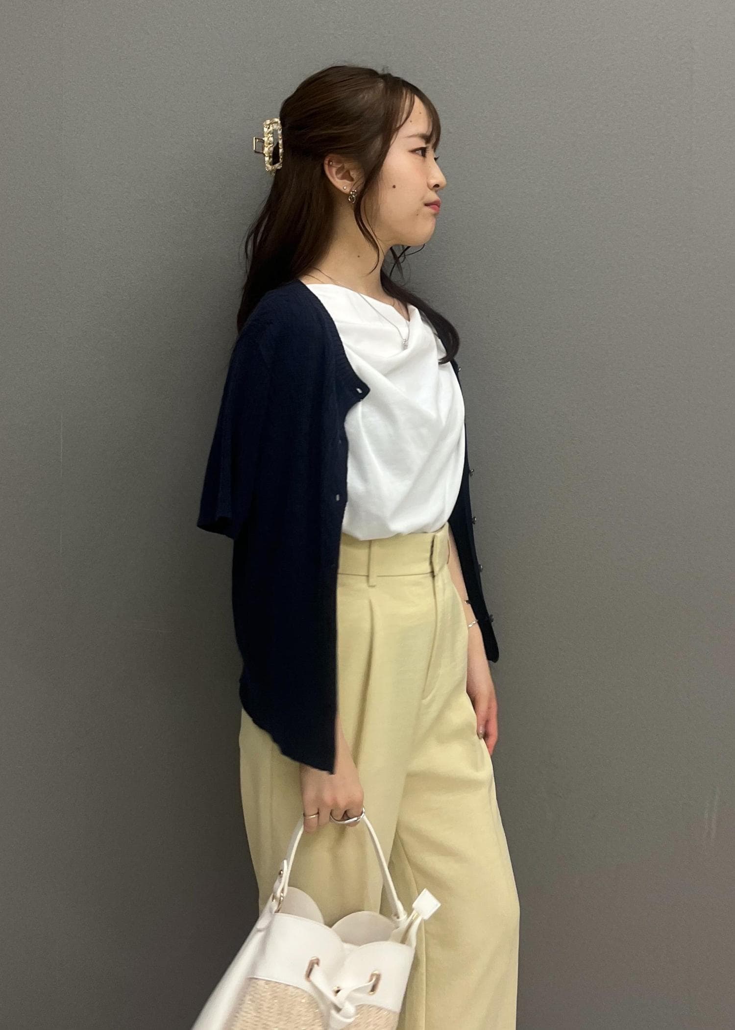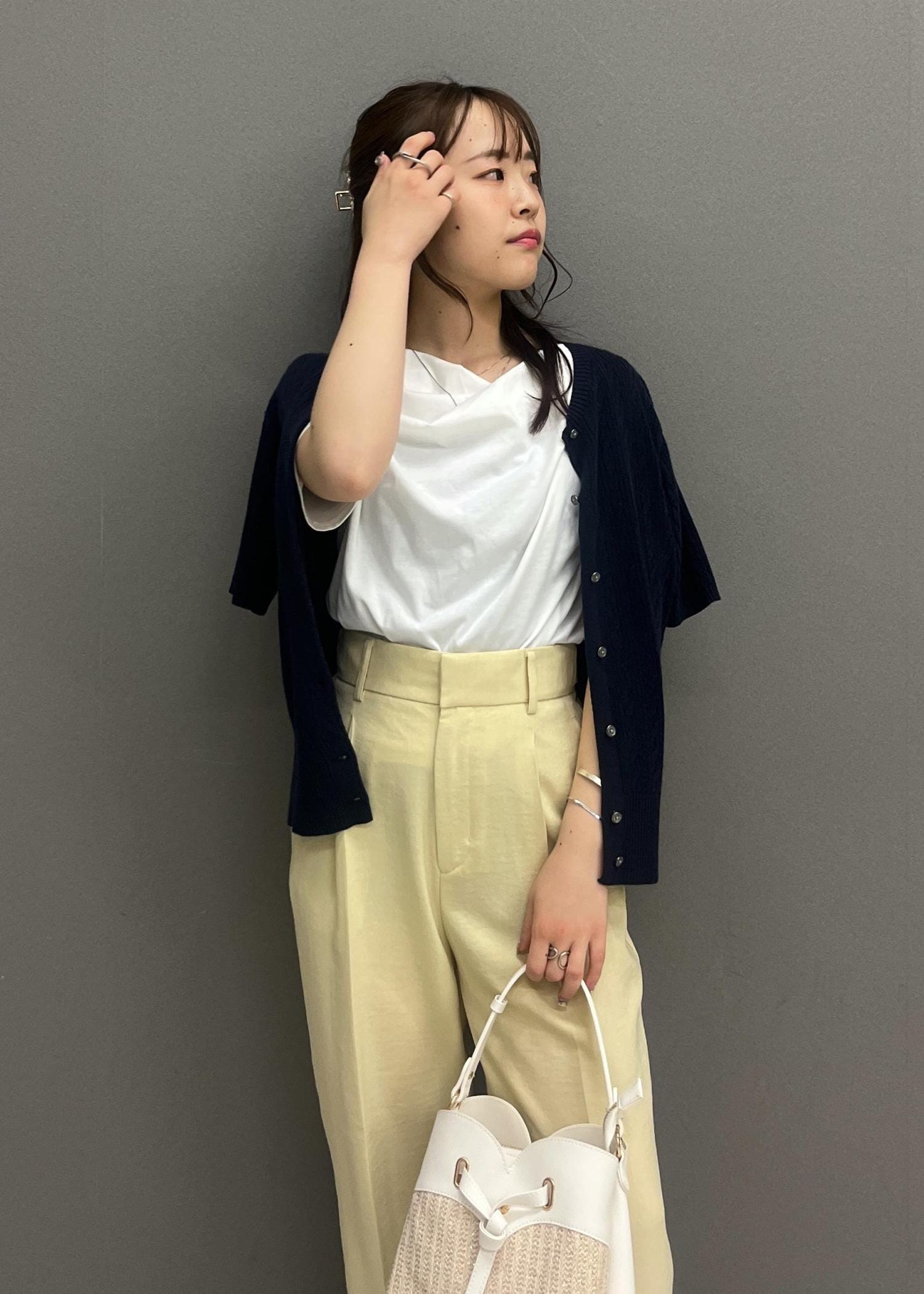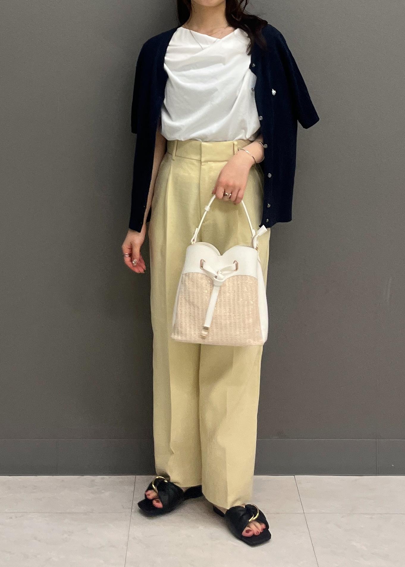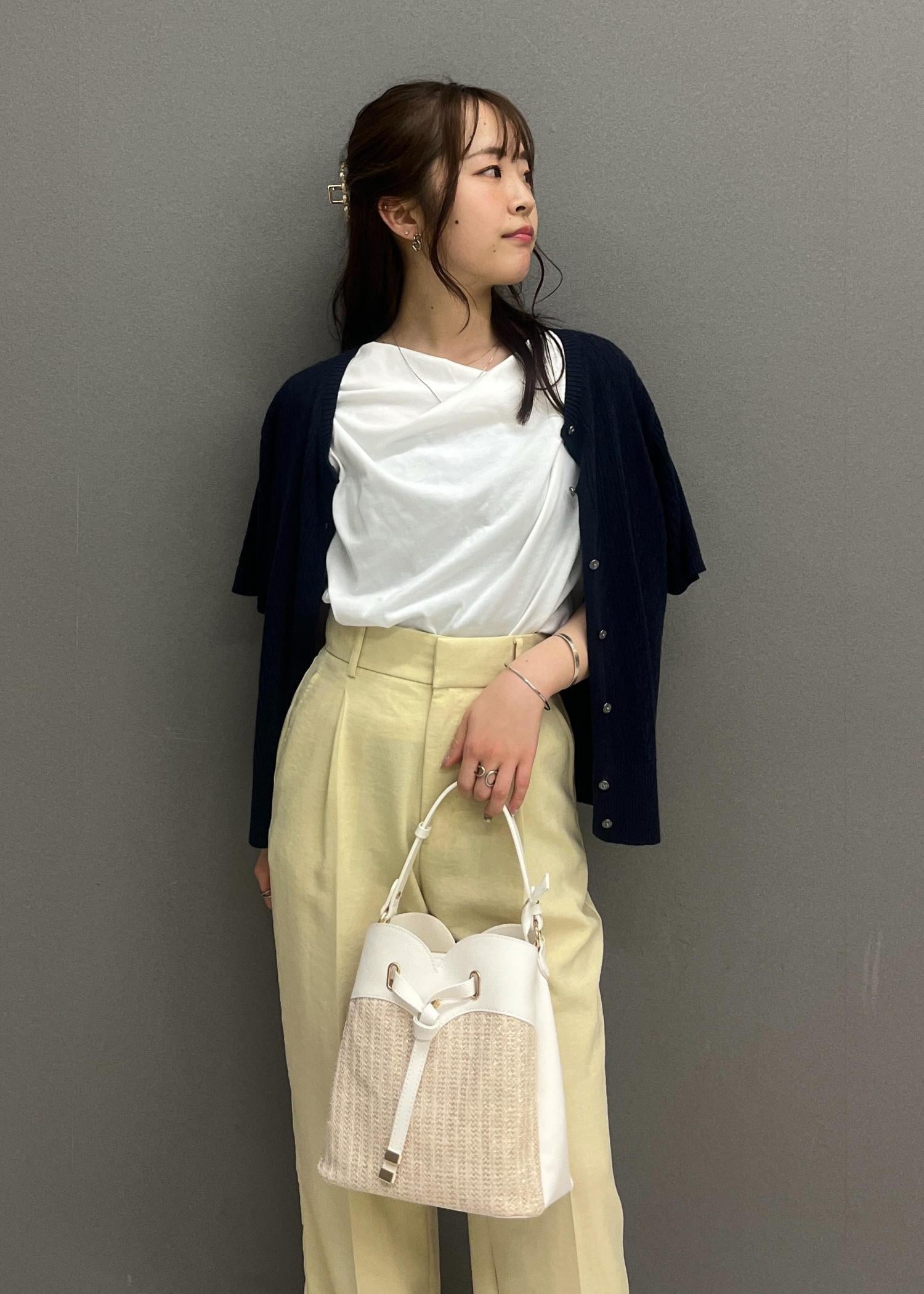 紐部分がアシンメトリーなデザインになるので、デコルテ周りがあいているトップスを着ても可愛いなと思いました☺︎ -