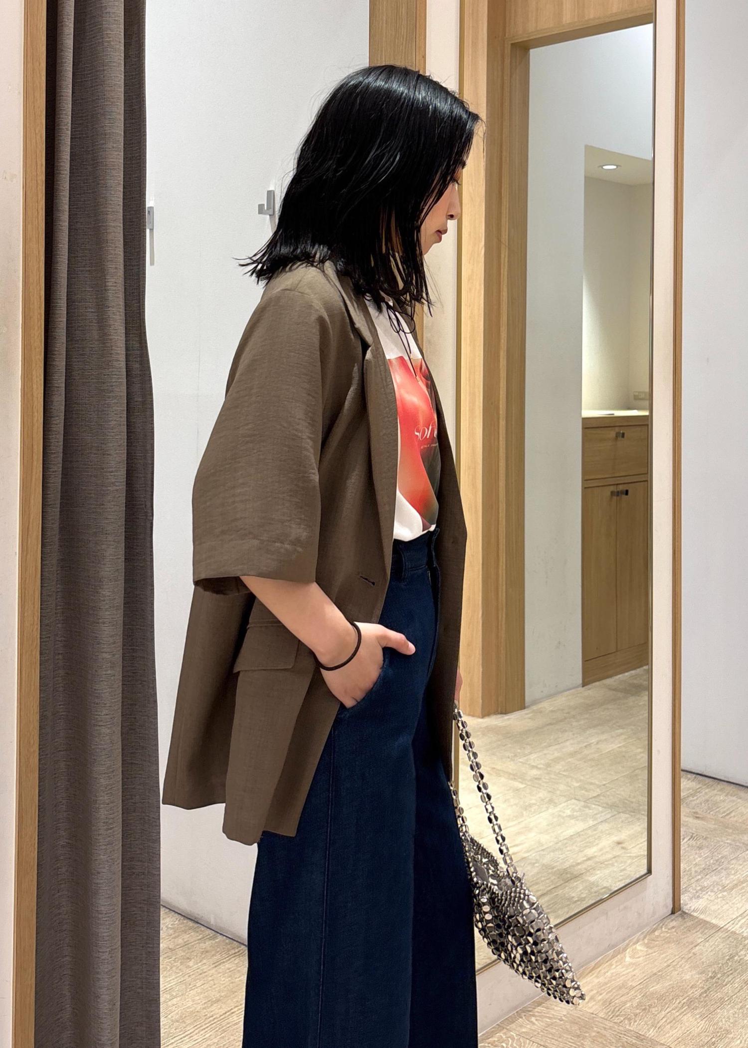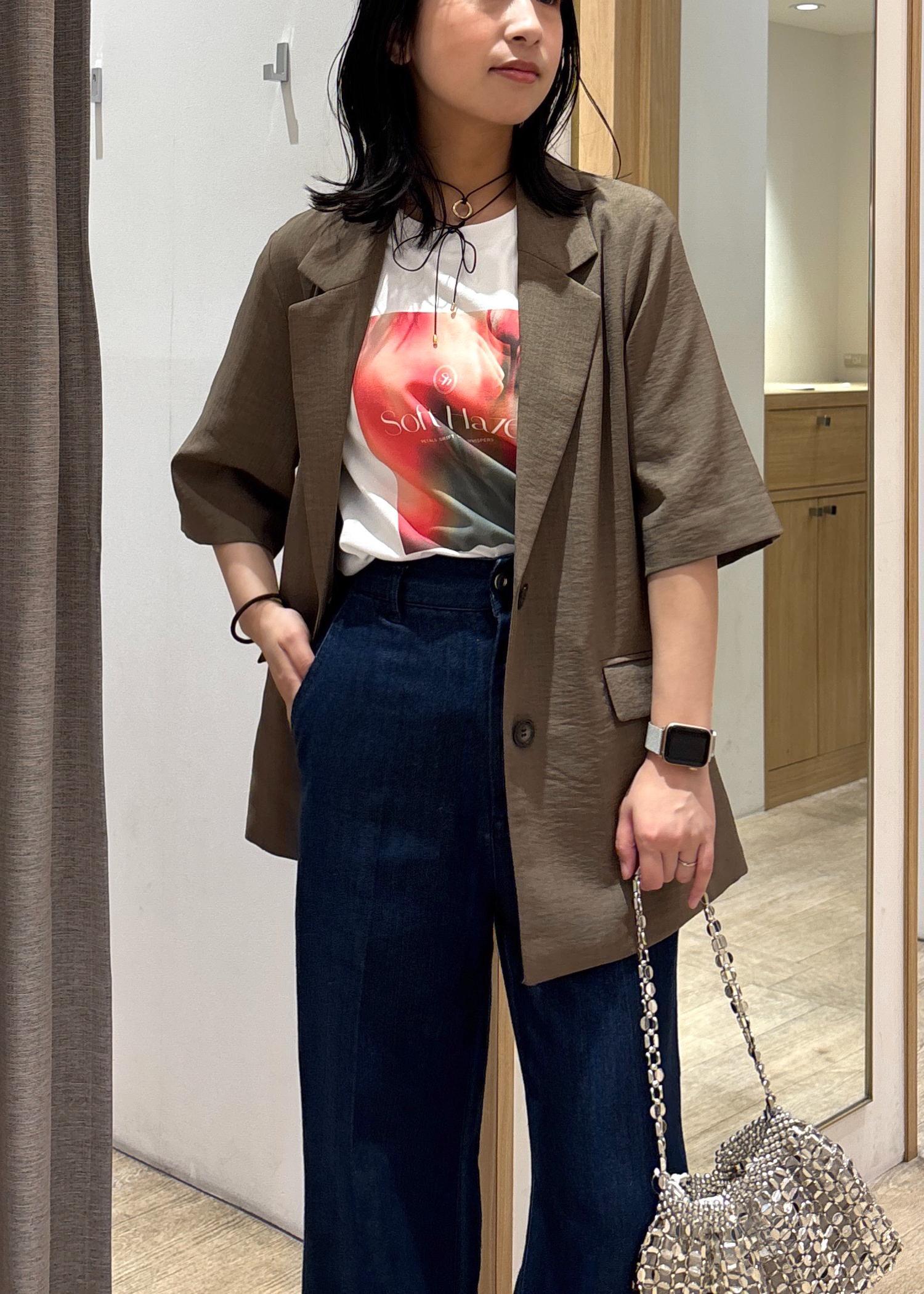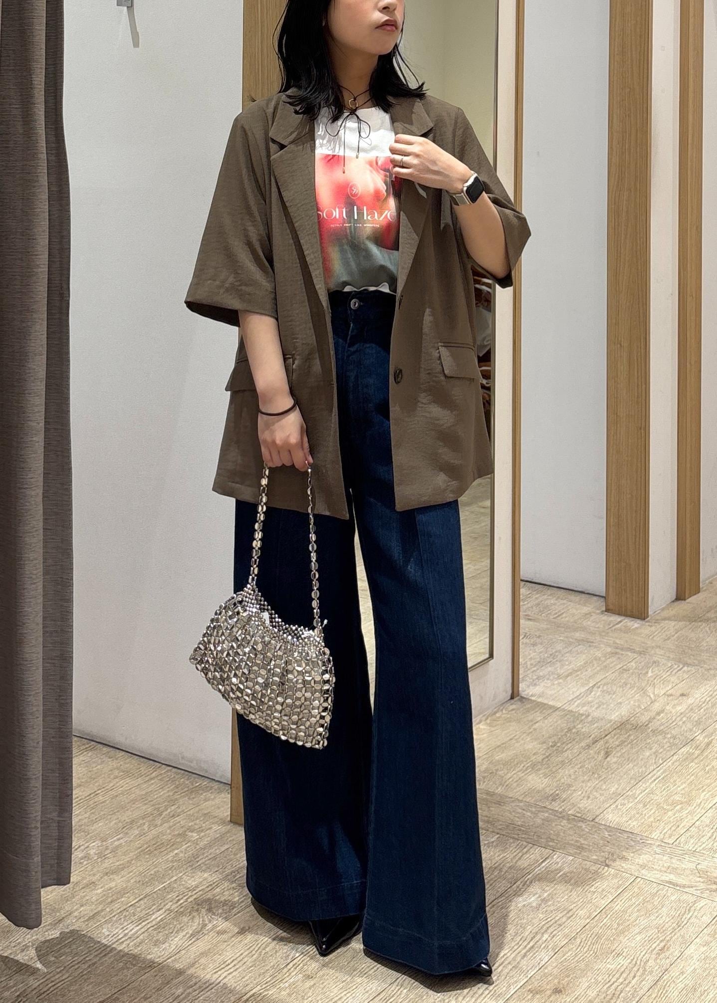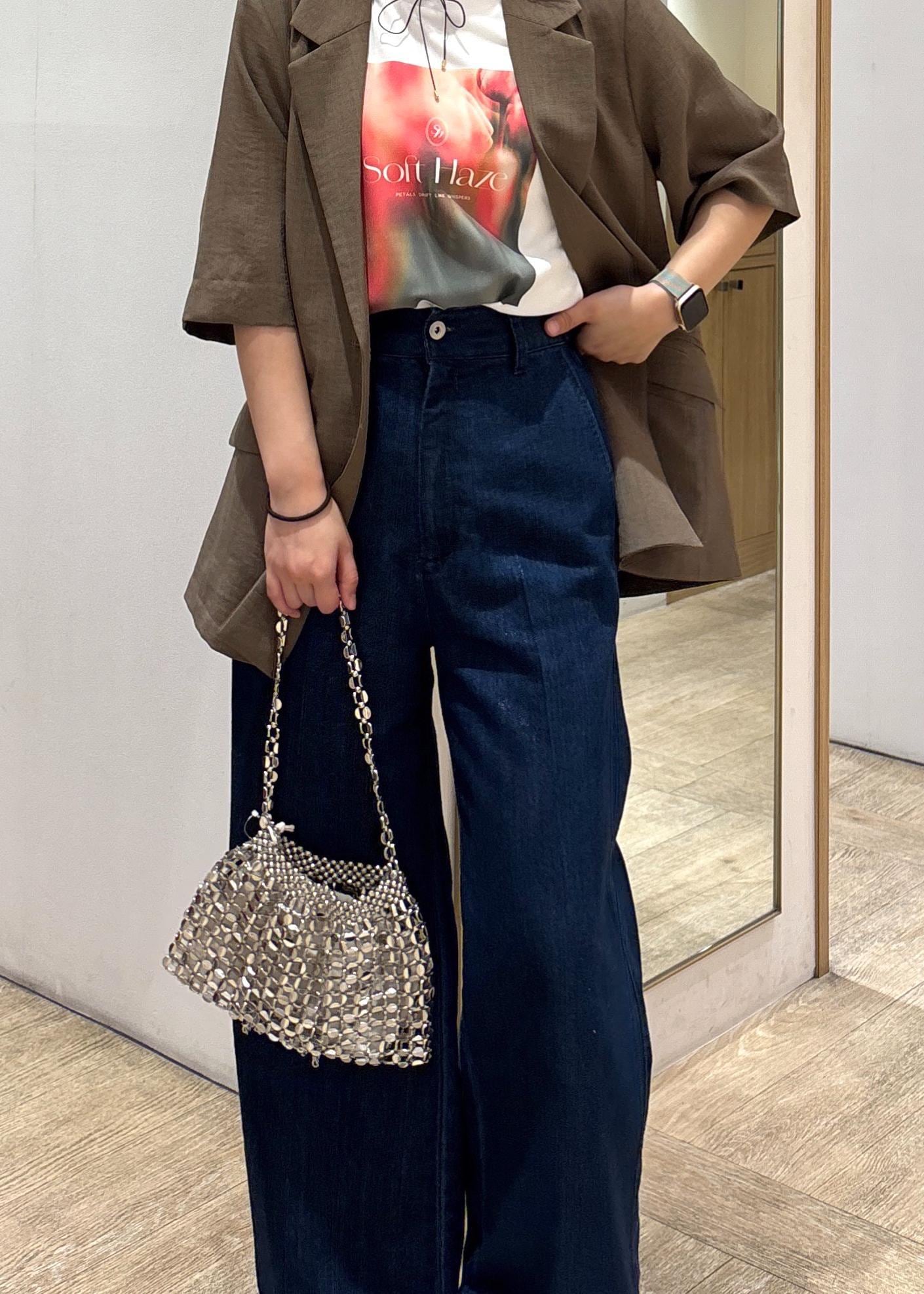 デニムはワイドの広がりが大きくボリュームがあるので、トップスはタンクトップでデコルテの抜け感を出したり、コンパクトTシャツで上半身をスッキリ見せるとスタイルアップ!