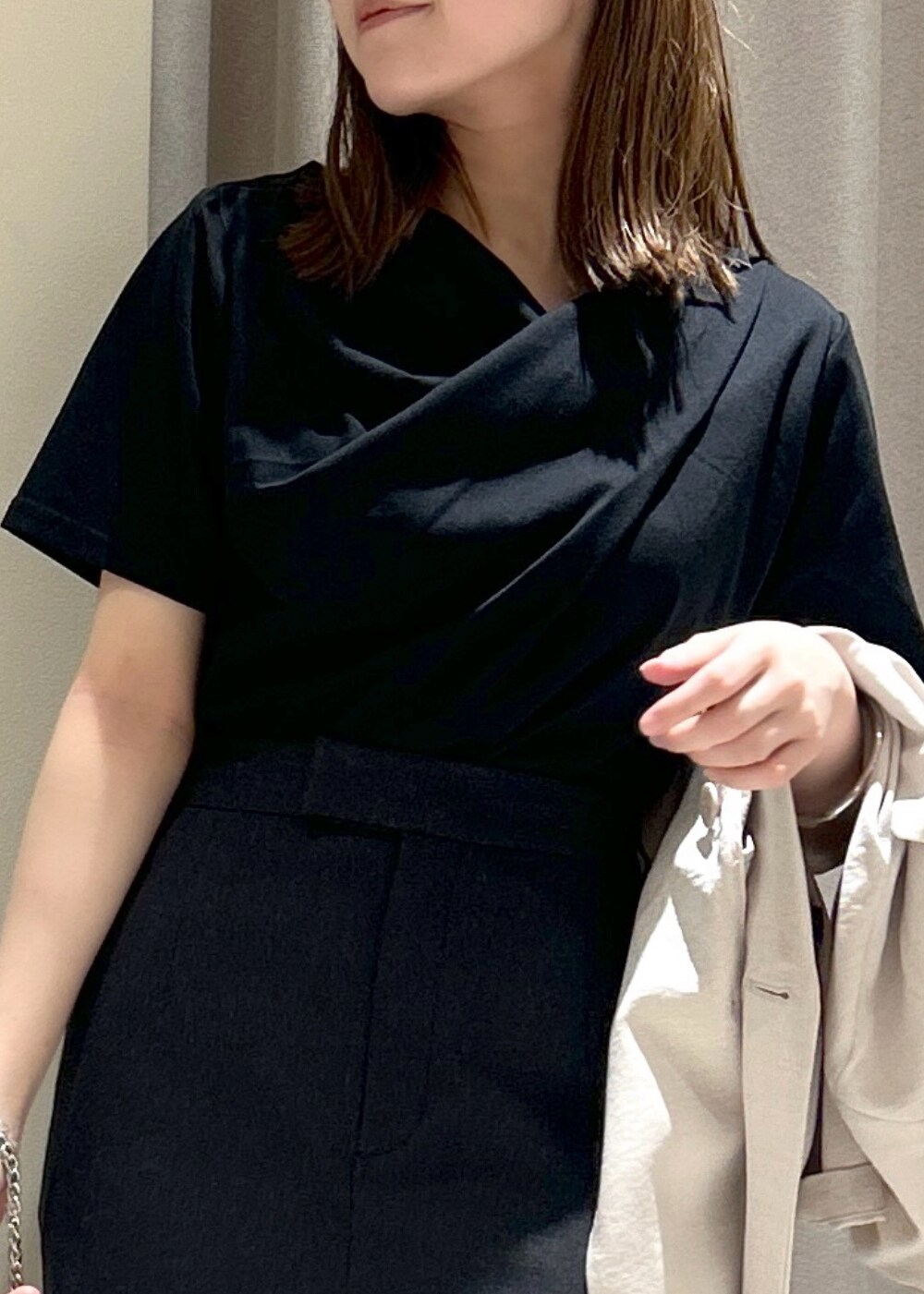 アウトレットVIS半袖ドレープカットソー/WEB限定カラーブラック / F¥2,764レビュー腕やデコルテ部分を華奢見えしてくれるトップスで、ドレープは胸元と、ウエスト位置からもデザインが入っています。キレイめからカジュアルまで幅広いコーディネートができます。