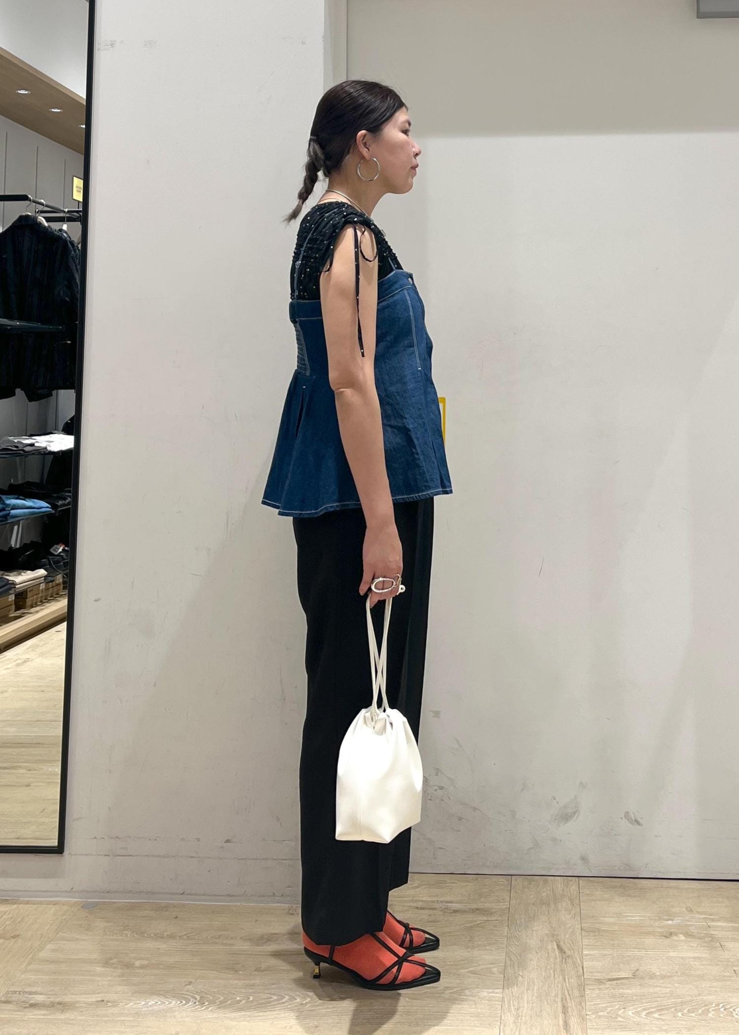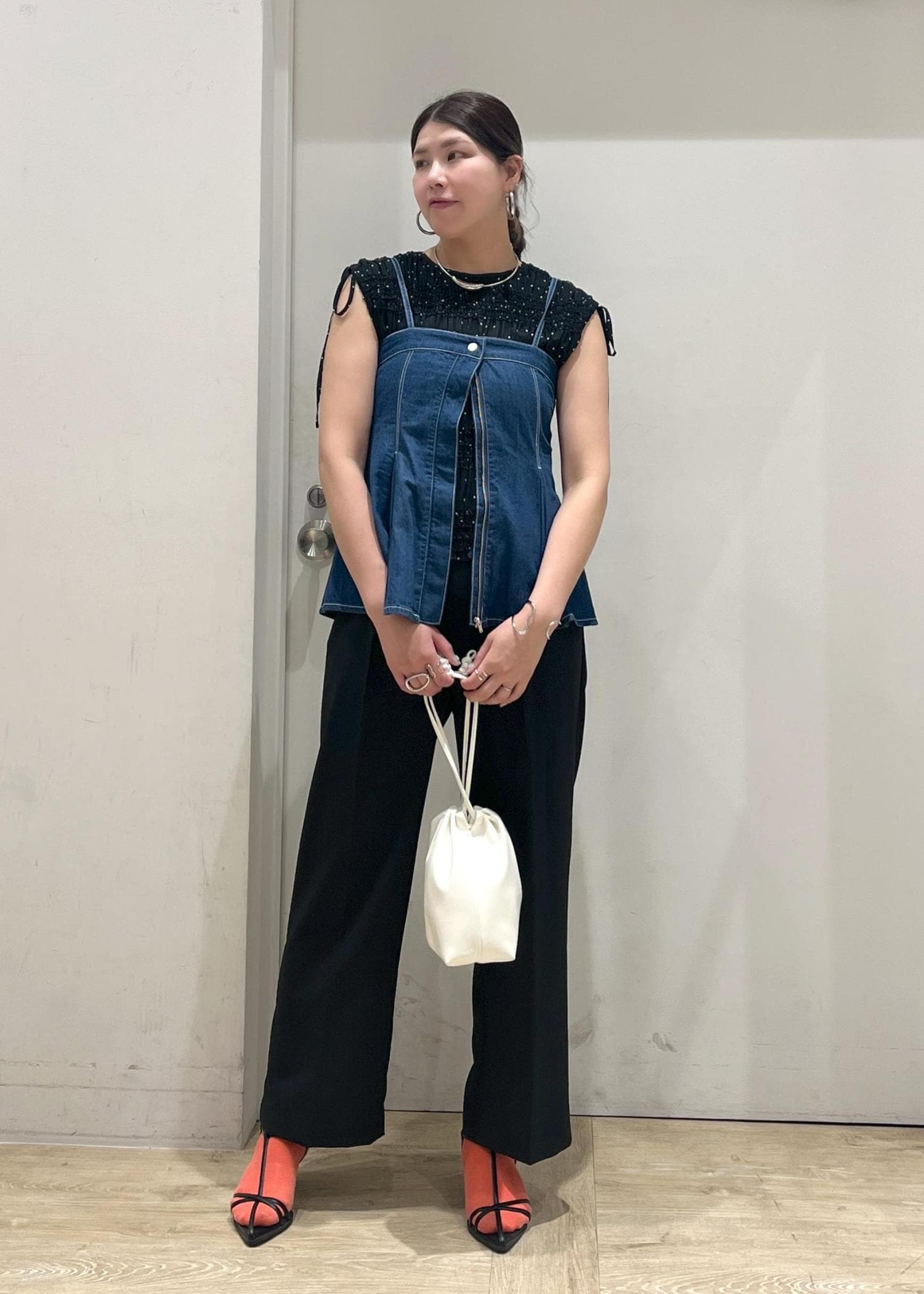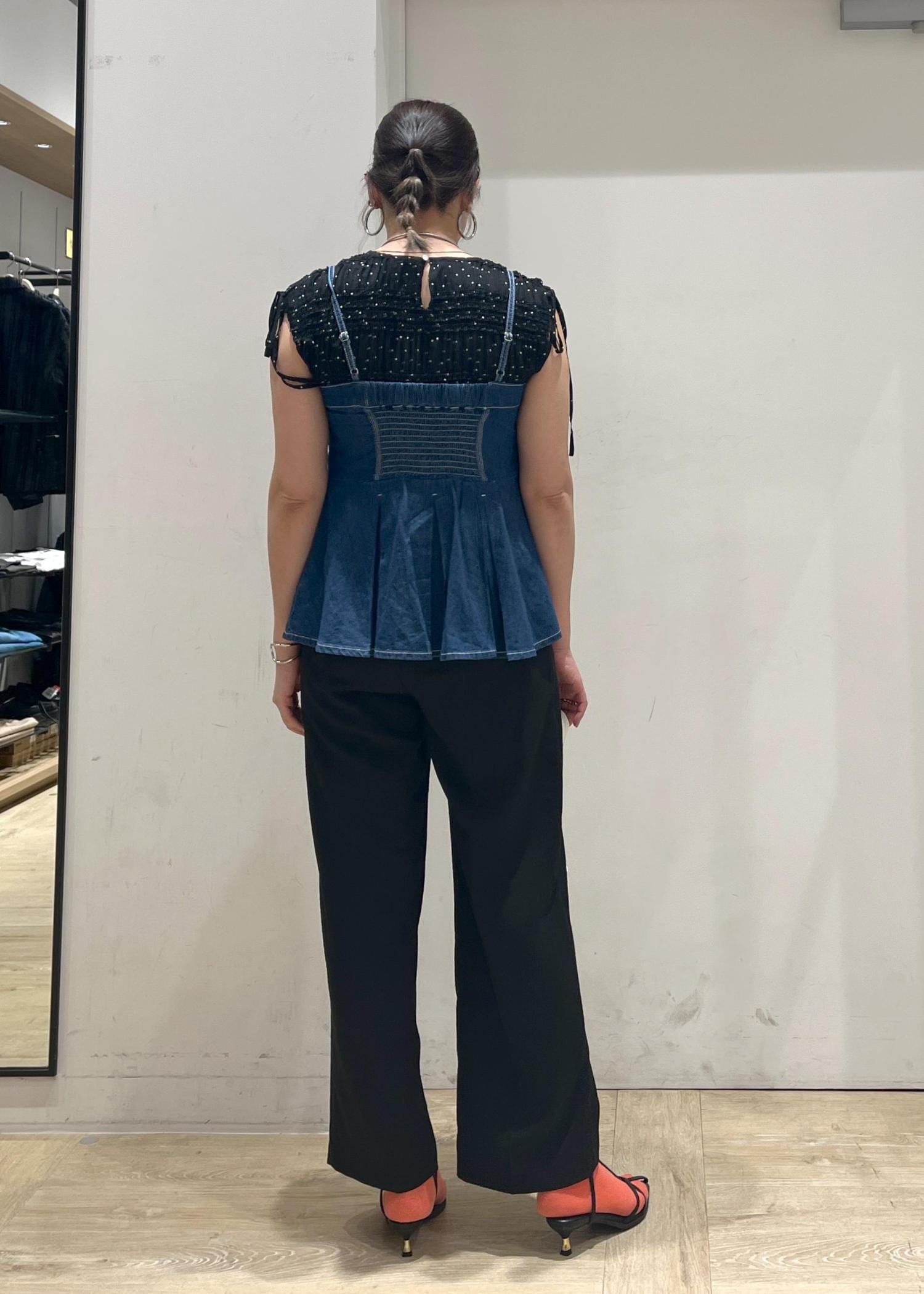ドット柄やプリーツ・シャーリングデザインが映えるブラウスに美easyパンツ合わせで大人な雰囲気を、デニムビスチェ合わせでカジュアルダウン。