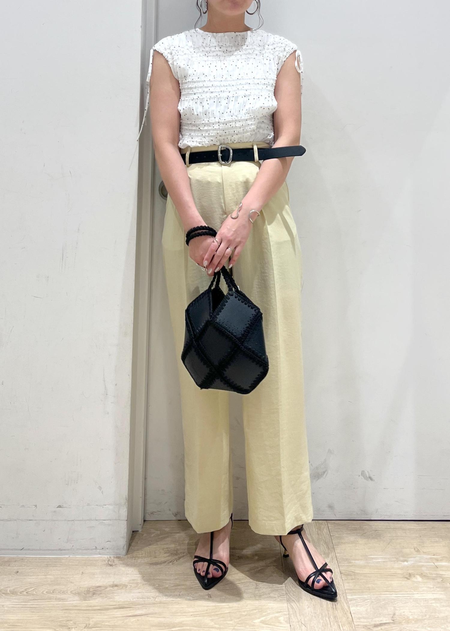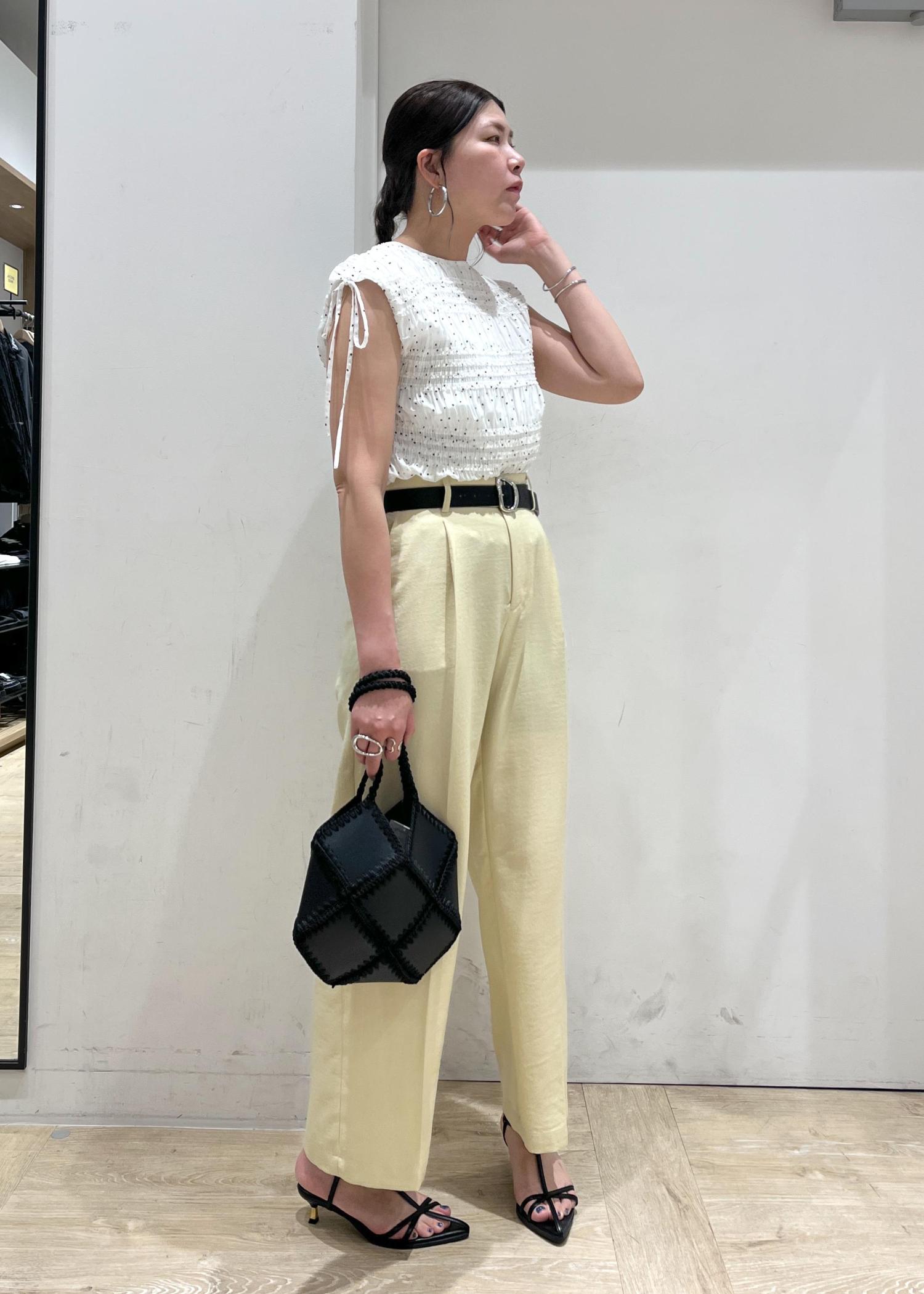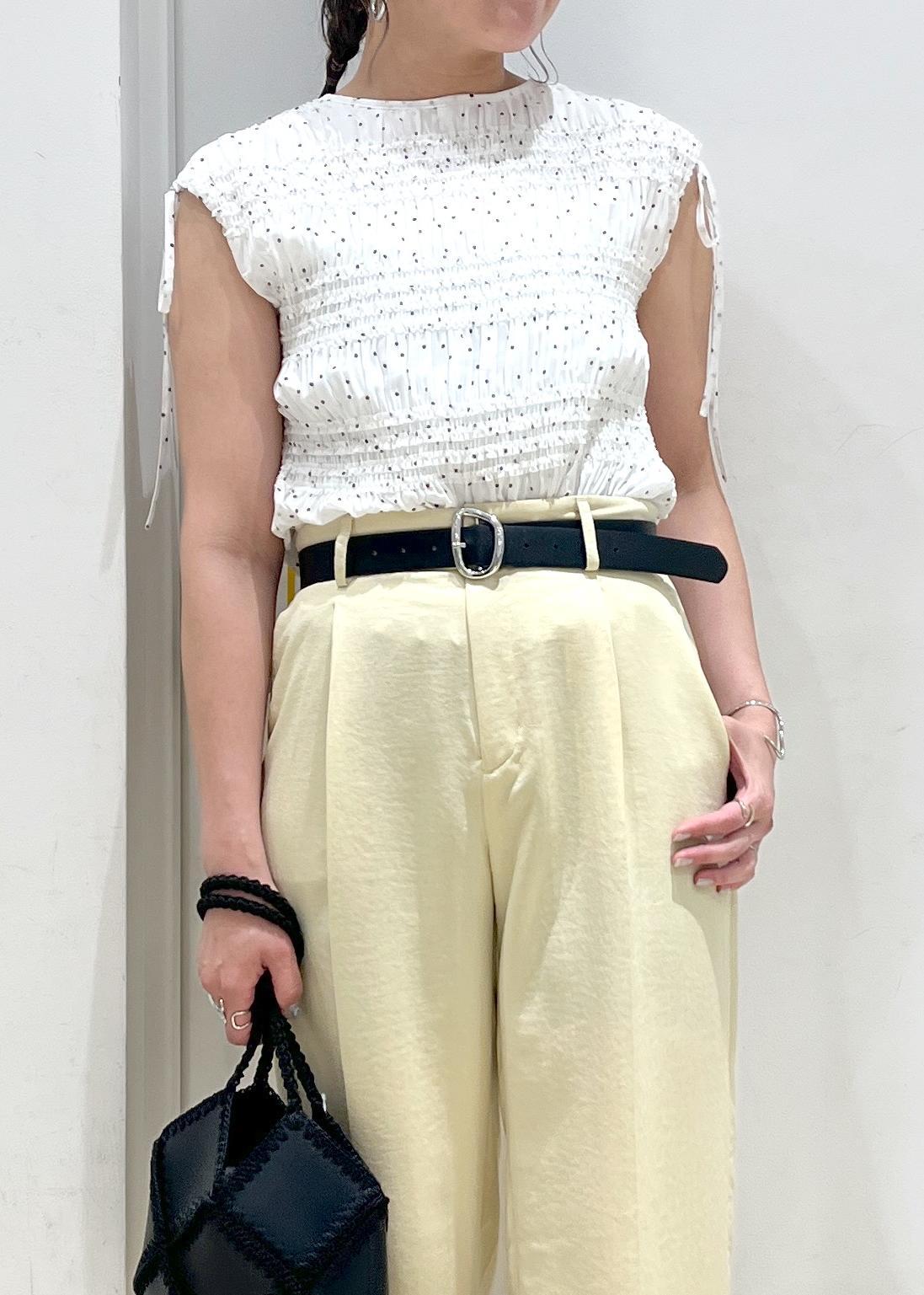 ドット柄が可愛いノースリーブブラウスにシンプル美easyパンツ合わせが大人な着こなし!