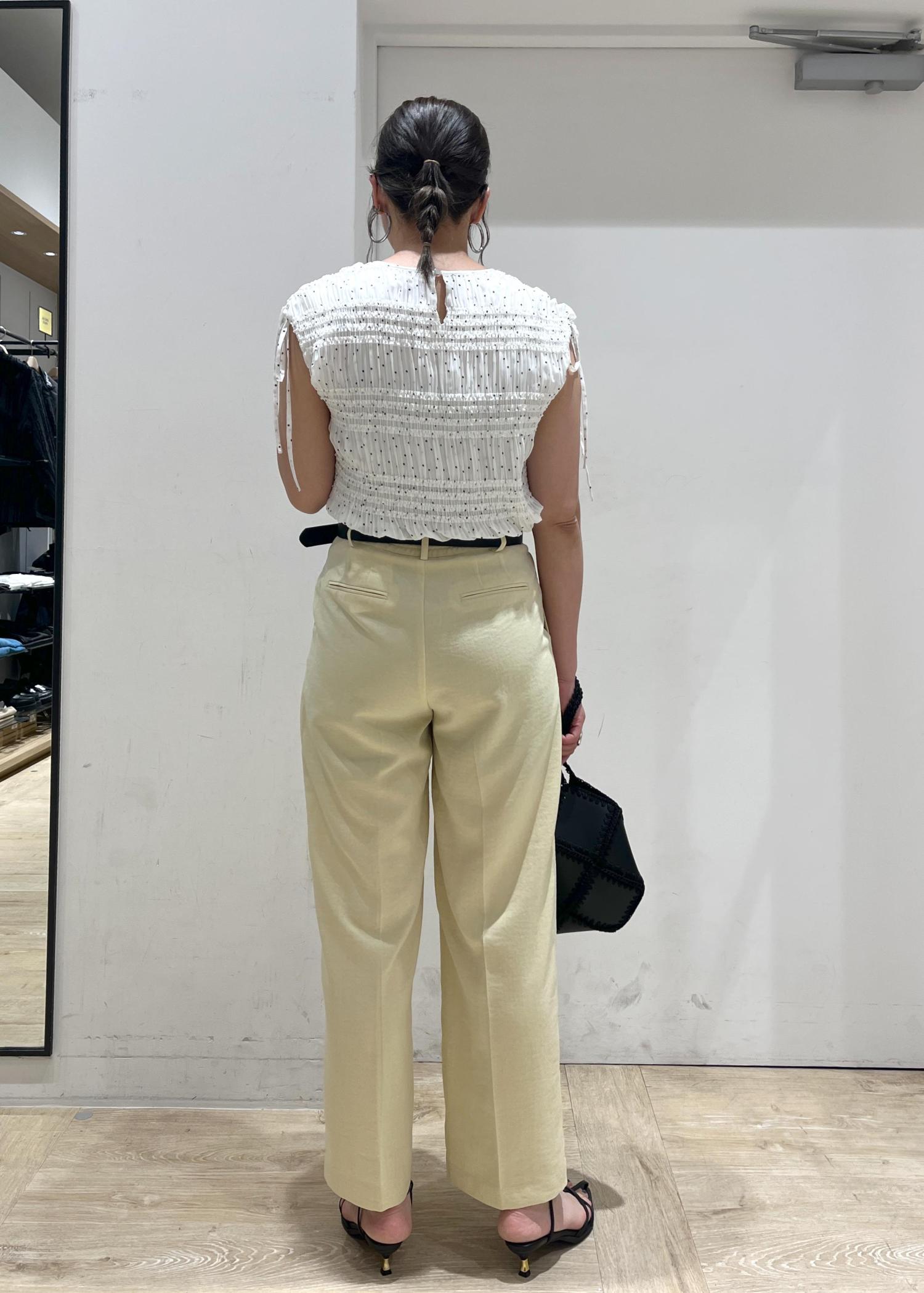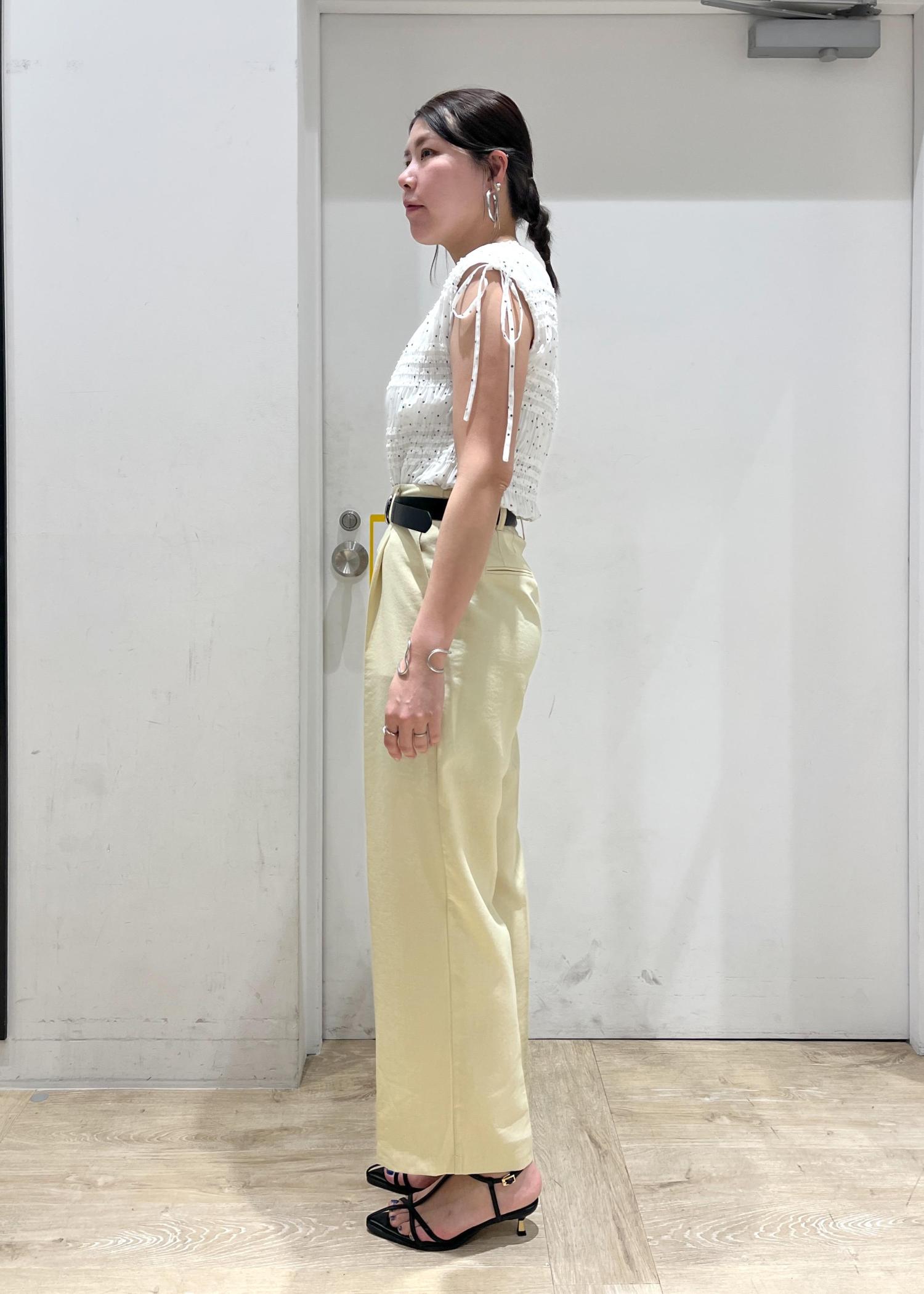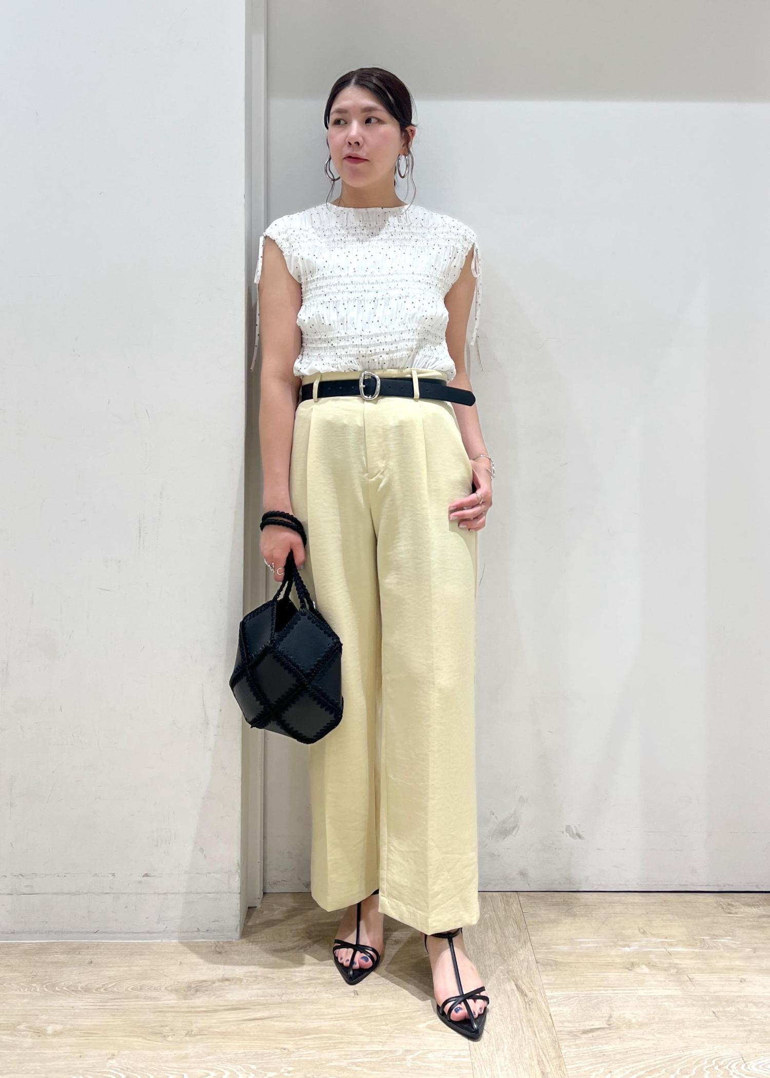 ドット柄が可愛いノースリーブブラウスにシンプル美easyパンツ合わせが大人な着こなし!