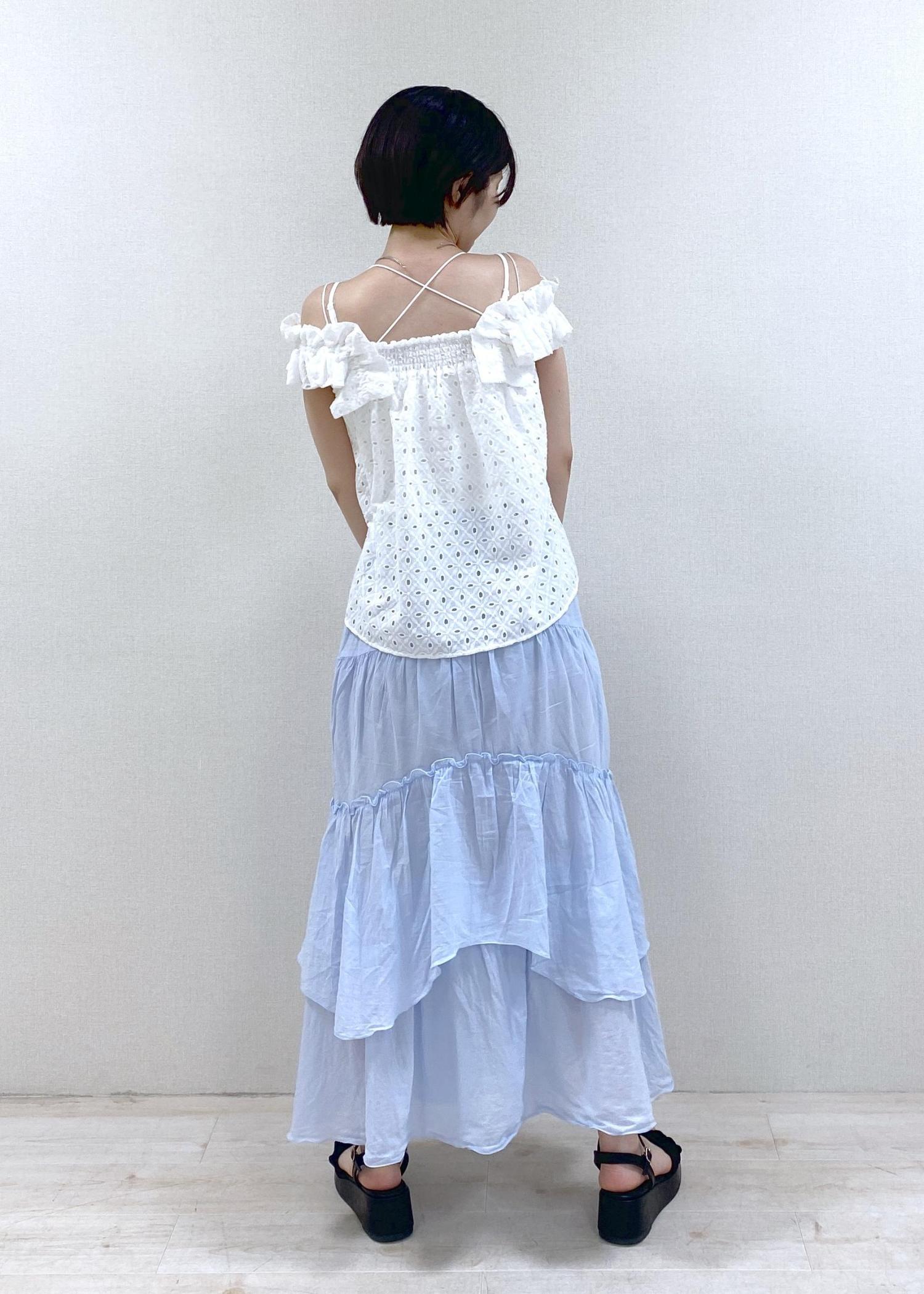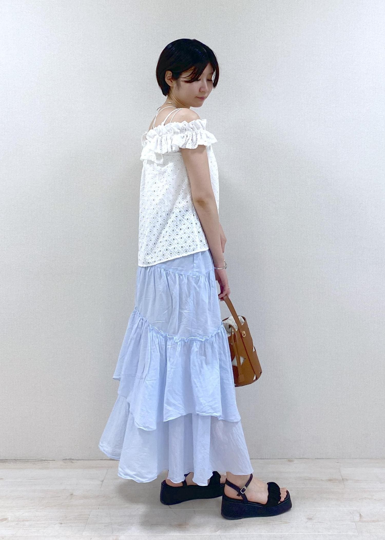 コットンレースブラウスとティアードスカートのスタイリングです。