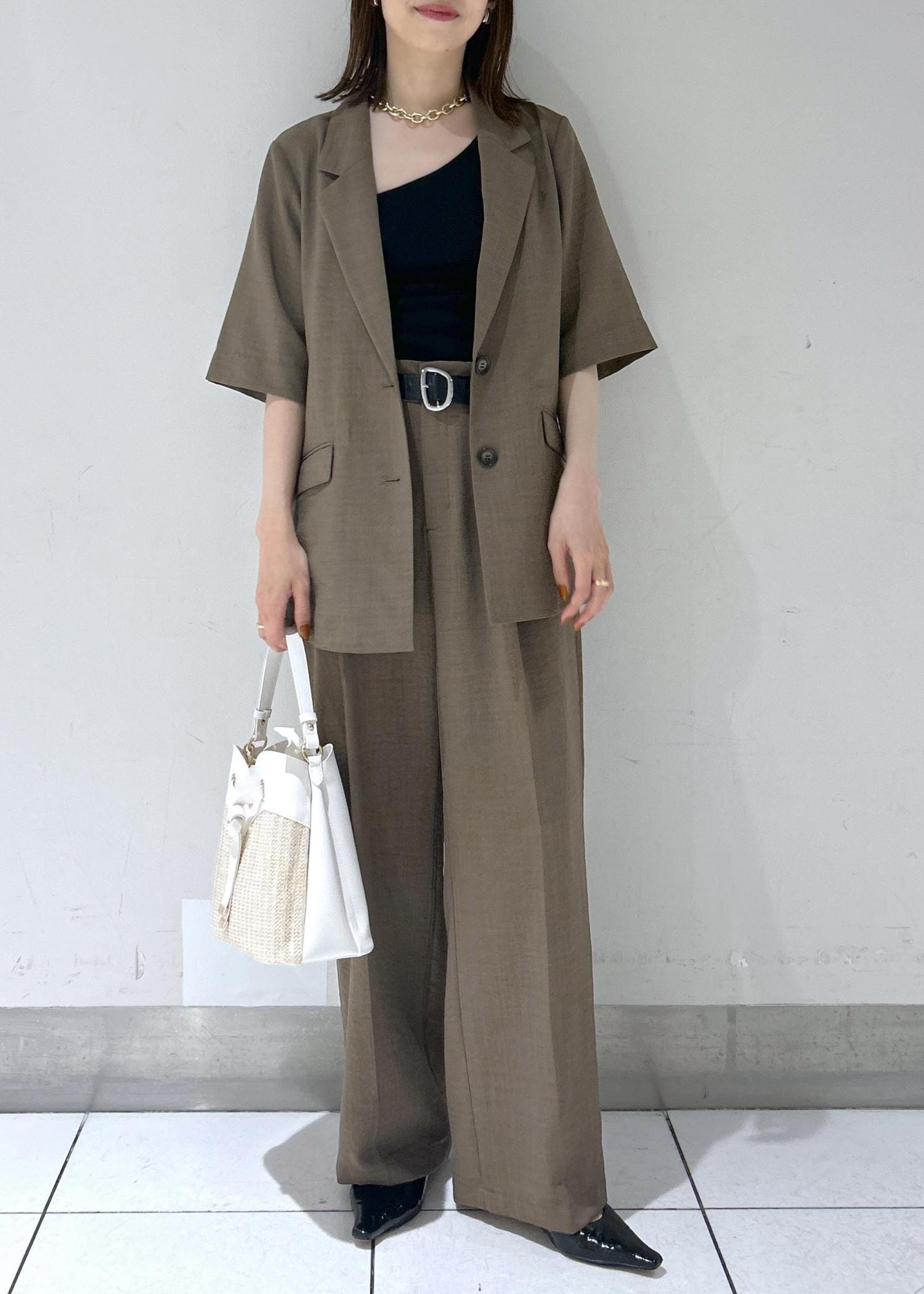 セットアップなので、お仕事にはもちろん、画像のようにキャミソールの上にジャケットを羽織るスタイルや、大きめのベルトを合わせると更にこなれ感がでるので、オフの日にもオススメ!