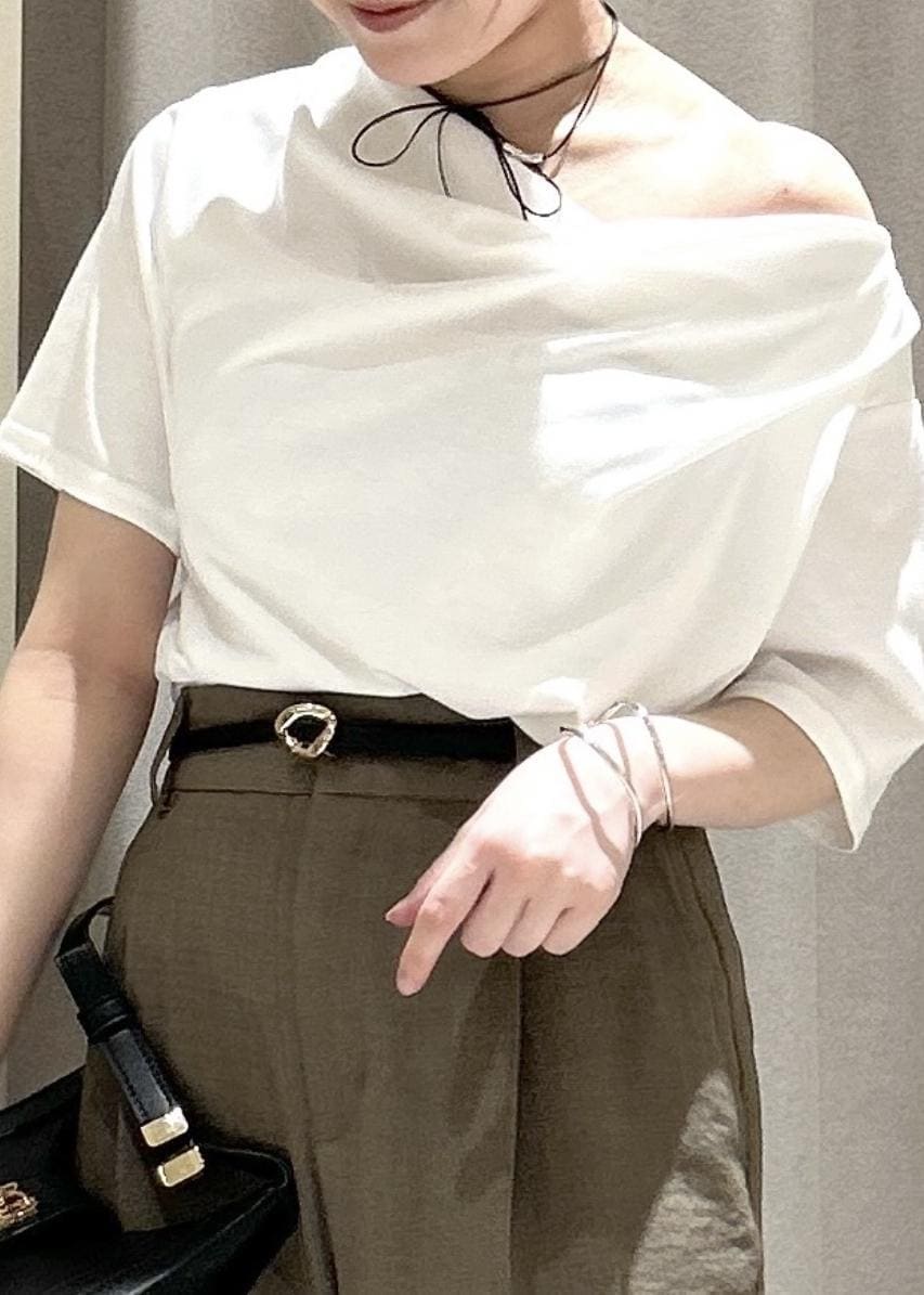 腕やデコルテ部分を華奢見えしてくれるトップスで、ドレープは胸元と、ウエスト位置からもデザインが入っています。キレイめからカジュアルまで幅広いコーディネートができます。