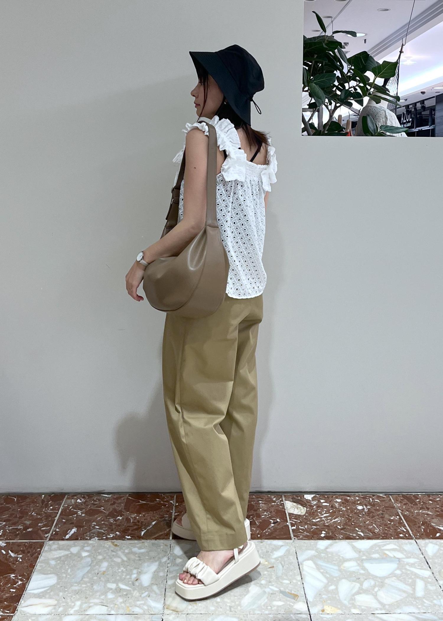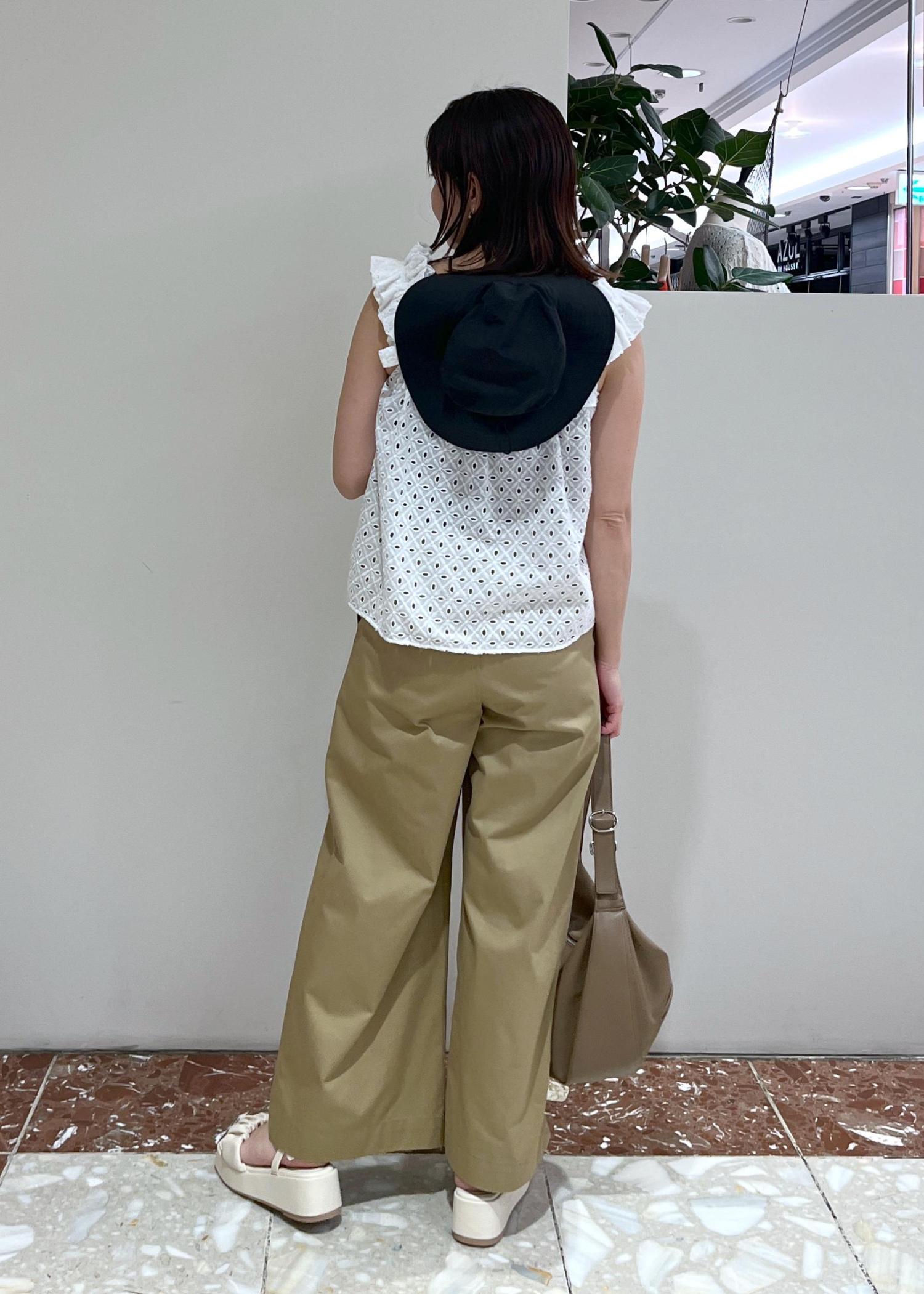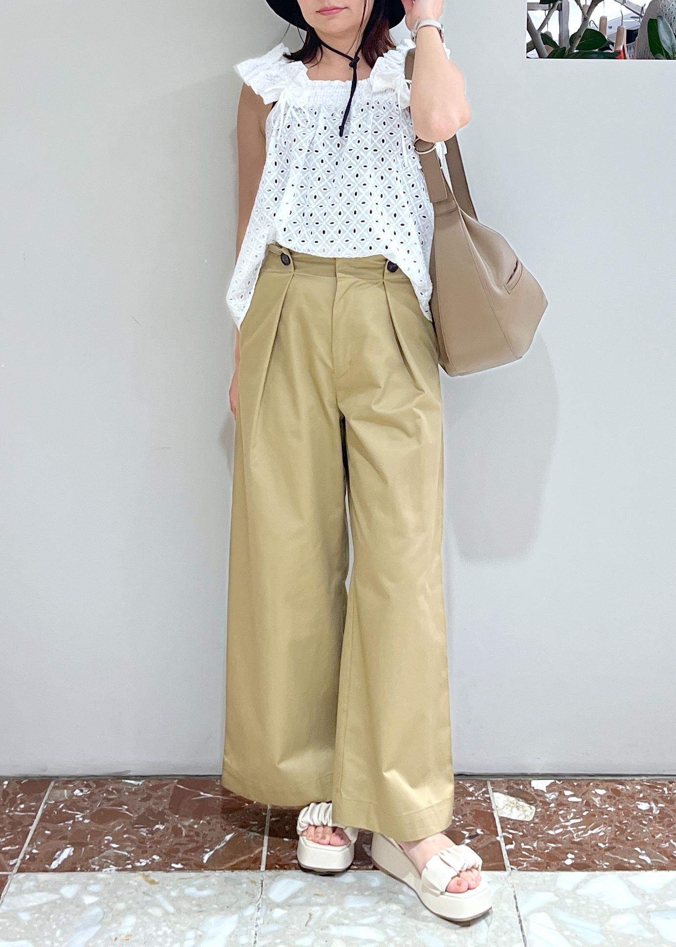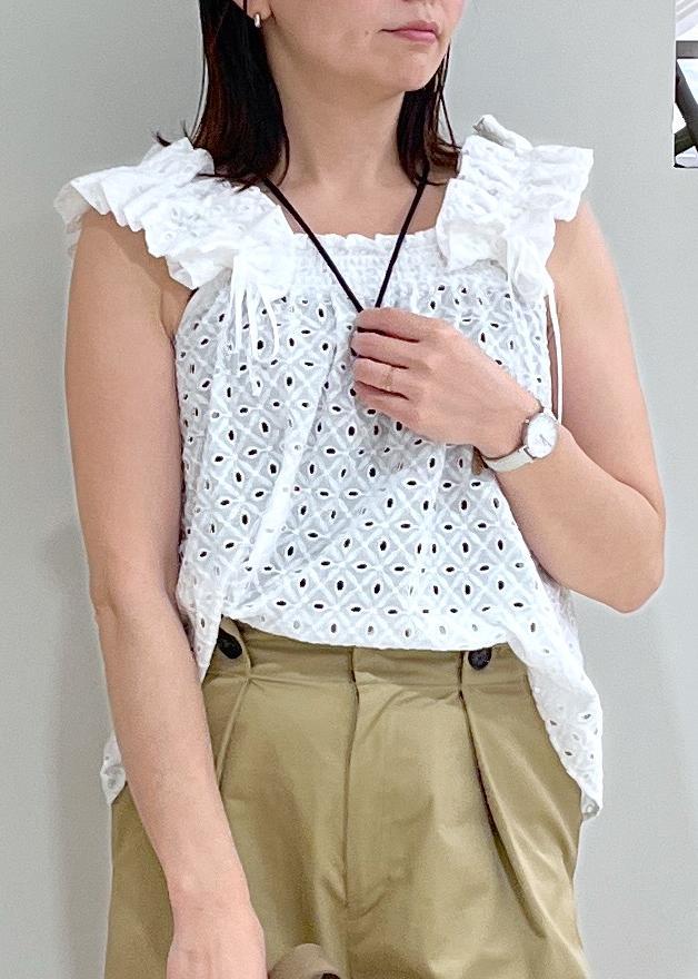 甘い雰囲気がありますが、デニムなどカジュアルはもちろん綺麗めなパンツとも相性が良い夏にピッタリのトップスです。 -