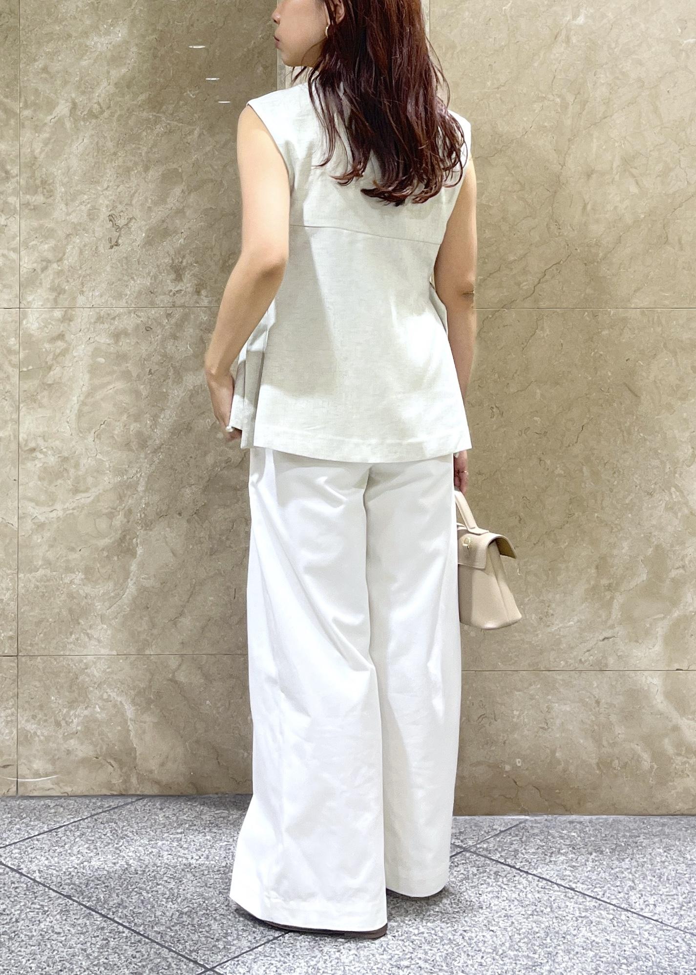 太めのパンツなので、ジレは裾のボタンを開けてすっきりと。