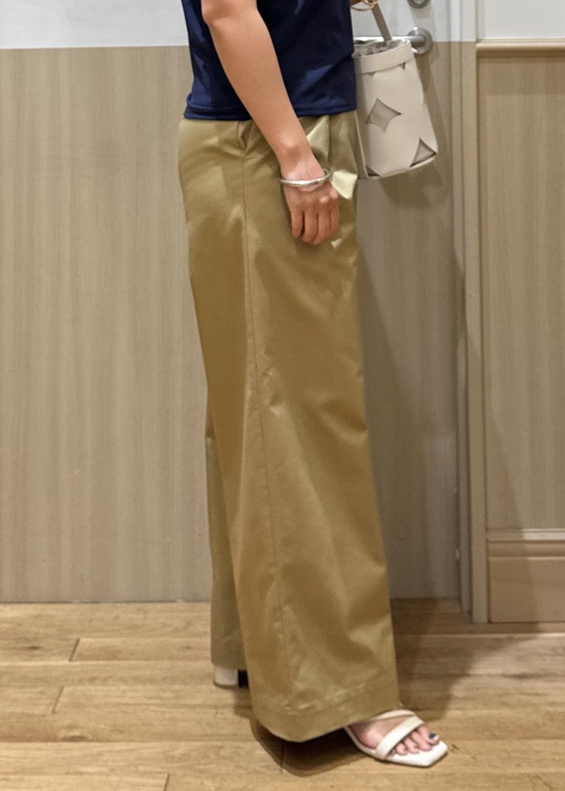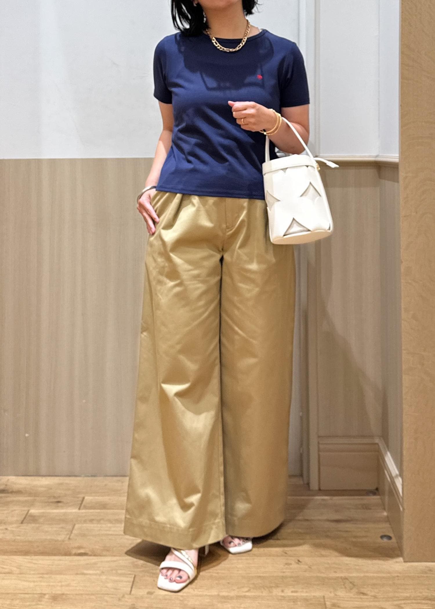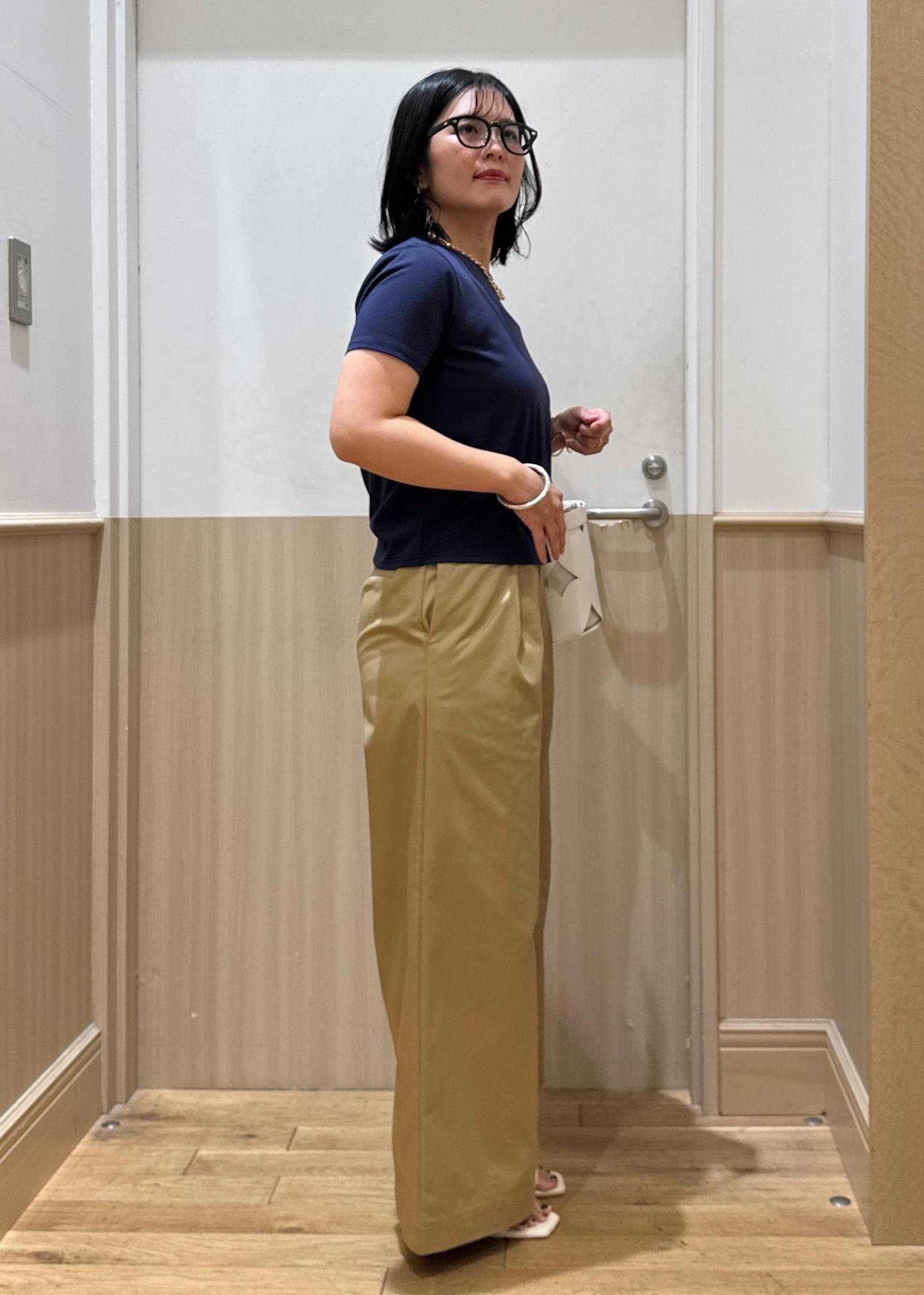 カラーはあえて落ち着いたネイビーとベージュの合わせで、大人のカジュアルスタイリングにしました!